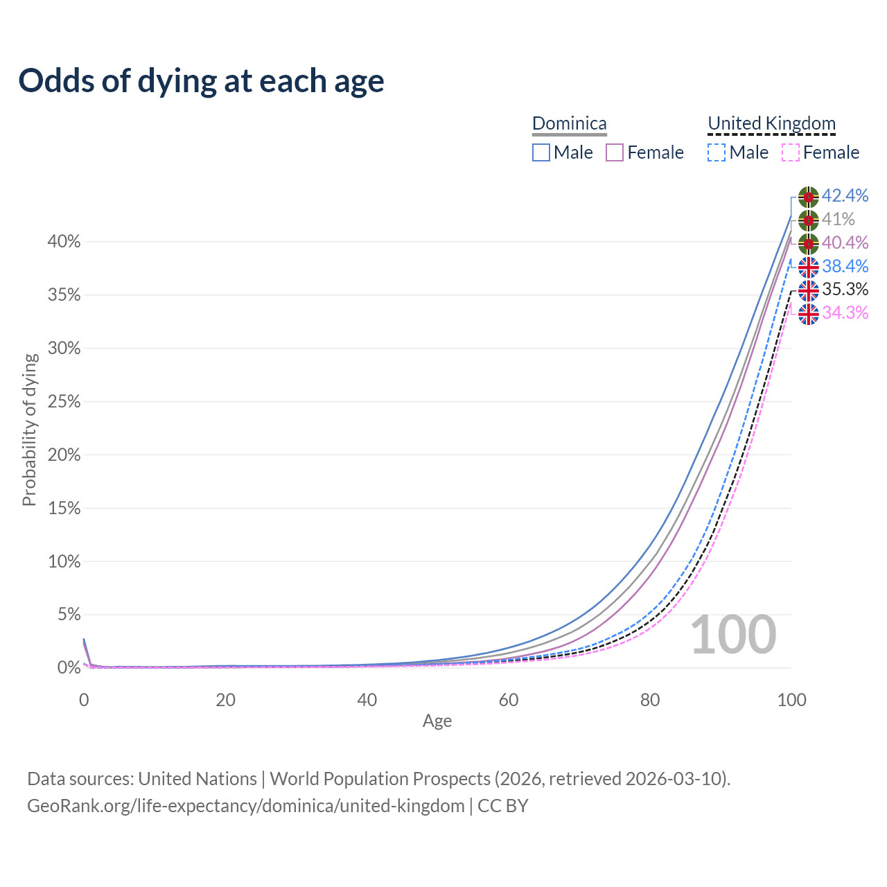 This life expectancy calculator shows the odds of living to 100, 95, 90, and below based on current age for both males and females in Dominica and the United Kingdom, along with mean and median age of death. The calculations are based on the 2026 life tables (actuarial tables) from the UN World Population Prospects.