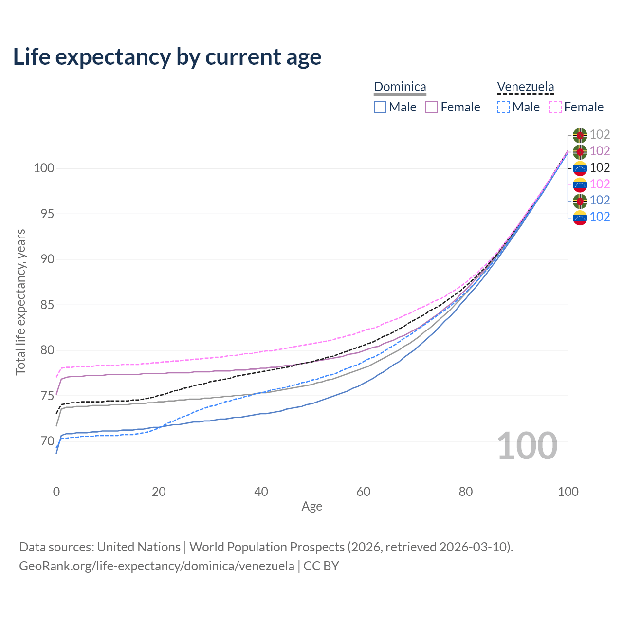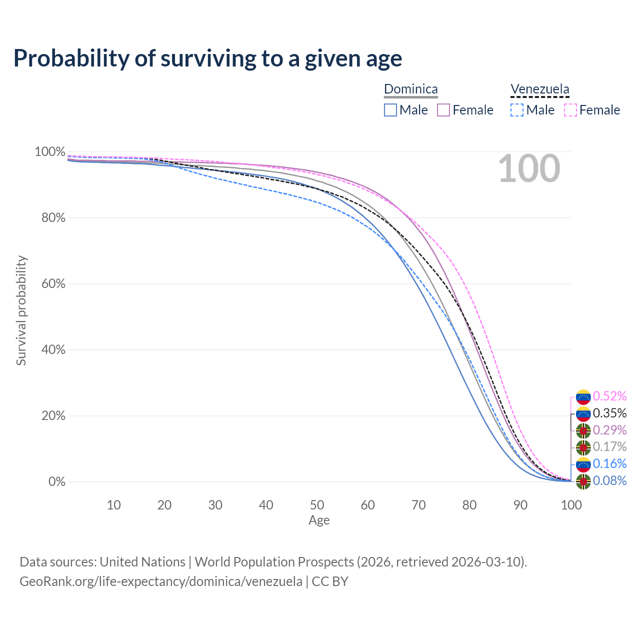 This life expectancy calculator shows the odds of living to 100, 95, 90, and below based on current age for both males and females in Dominica and Venezuela, along with mean and median age of death. The calculations are based on the 2026 life tables (actuarial tables) from the UN World Population Prospects.