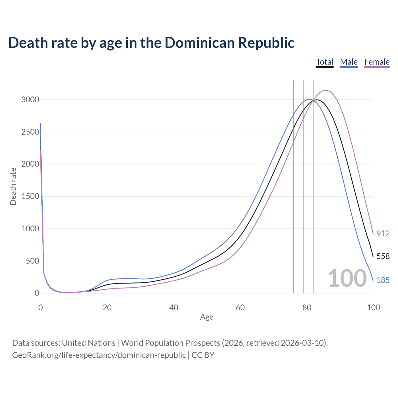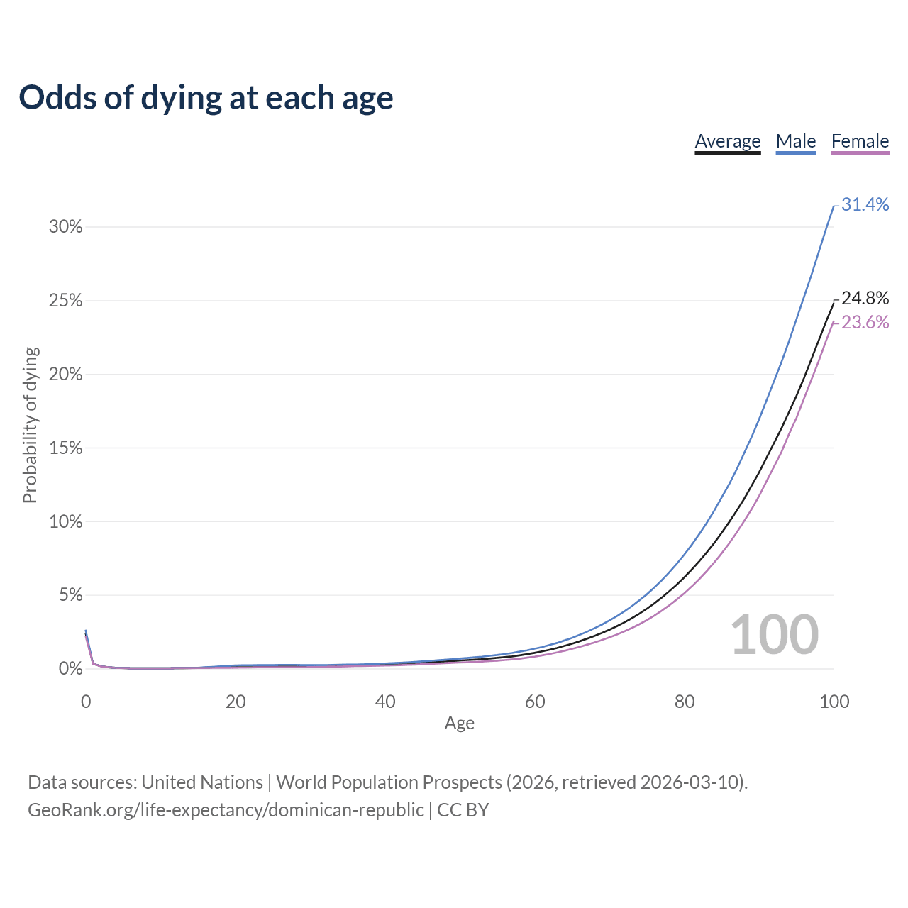 This life expectancy calculator shows the odds of living to 100, 95, 90, and below based on current age for both males and females in the Dominican Republic, along with mean and median age of death. The calculations are based on the 2026 life tables (actuarial tables) from the UN World Population Prospects.