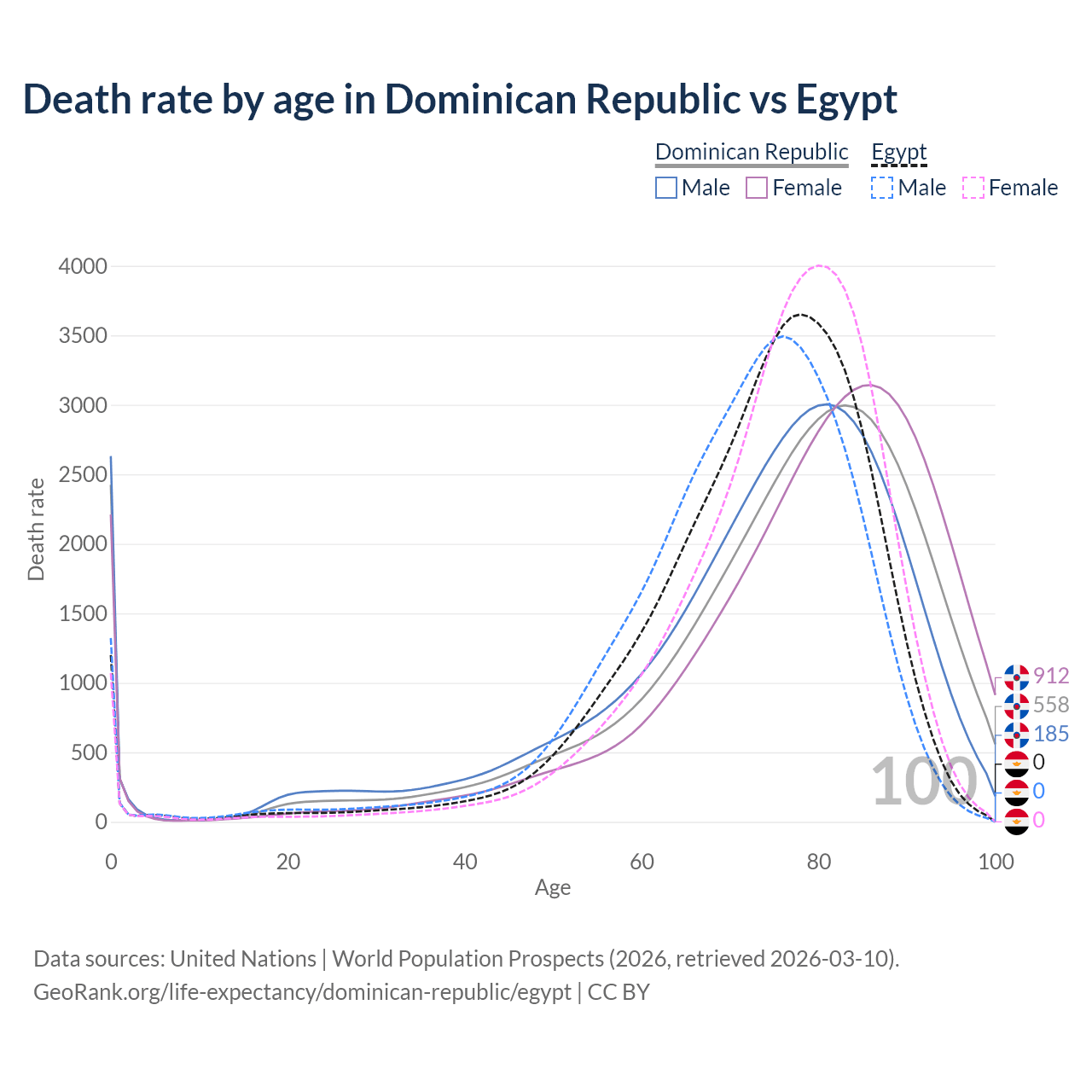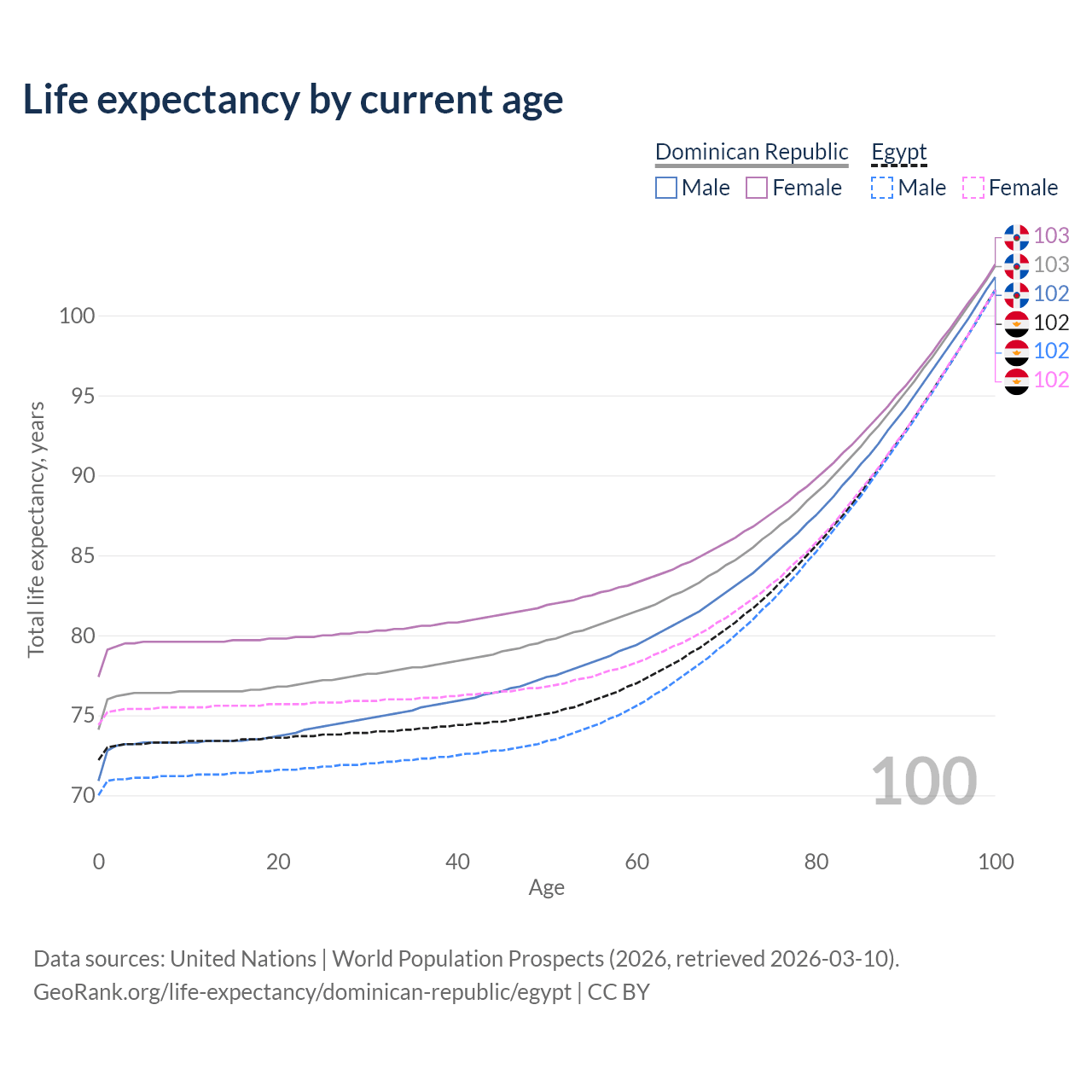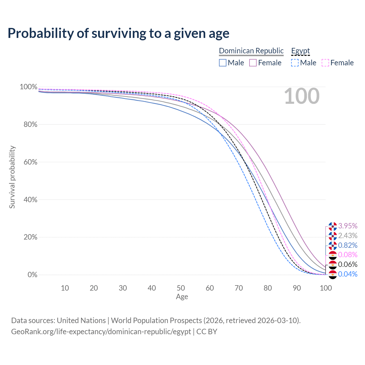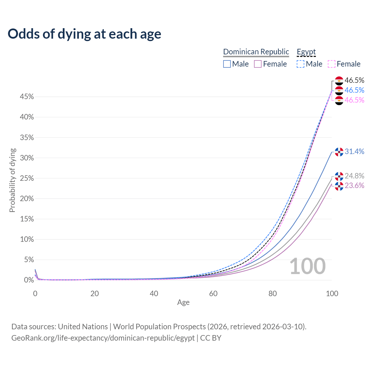 This life expectancy calculator shows the odds of living to 100, 95, 90, and below based on current age for both males and females in the Dominican Republic and Egypt, along with mean and median age of death. The calculations are based on the 2026 life tables (actuarial tables) from the UN World Population Prospects.