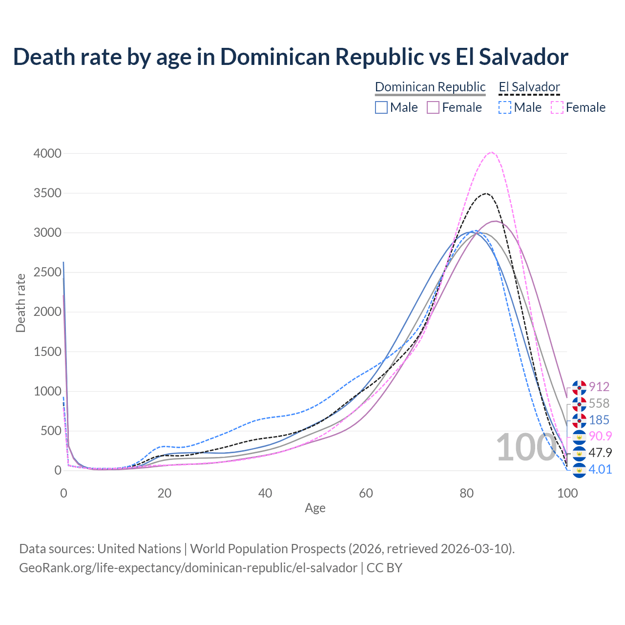 In the Dominican Republic, the most common age of death is 83, compared to 84 in El Salvador. The median age of death is 78.9 in the Dominican Republic and 78.1 in El Salvador, meaning only half of each cohort is expected to live past that age.