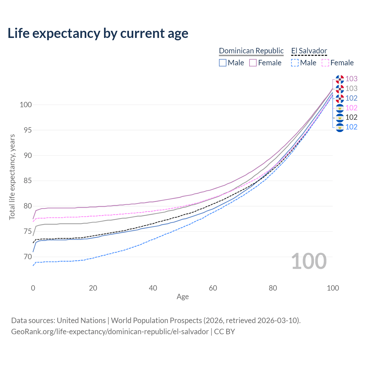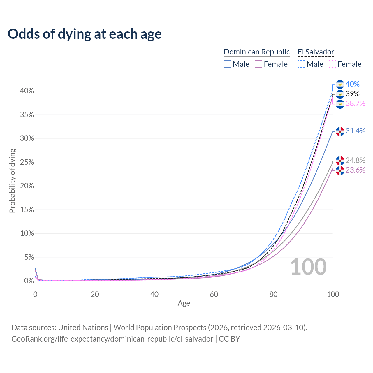 This life expectancy calculator shows the odds of living to 100, 95, 90, and below based on current age for both males and females in the Dominican Republic and El Salvador, along with mean and median age of death. The calculations are based on the 2026 life tables (actuarial tables) from the UN World Population Prospects.