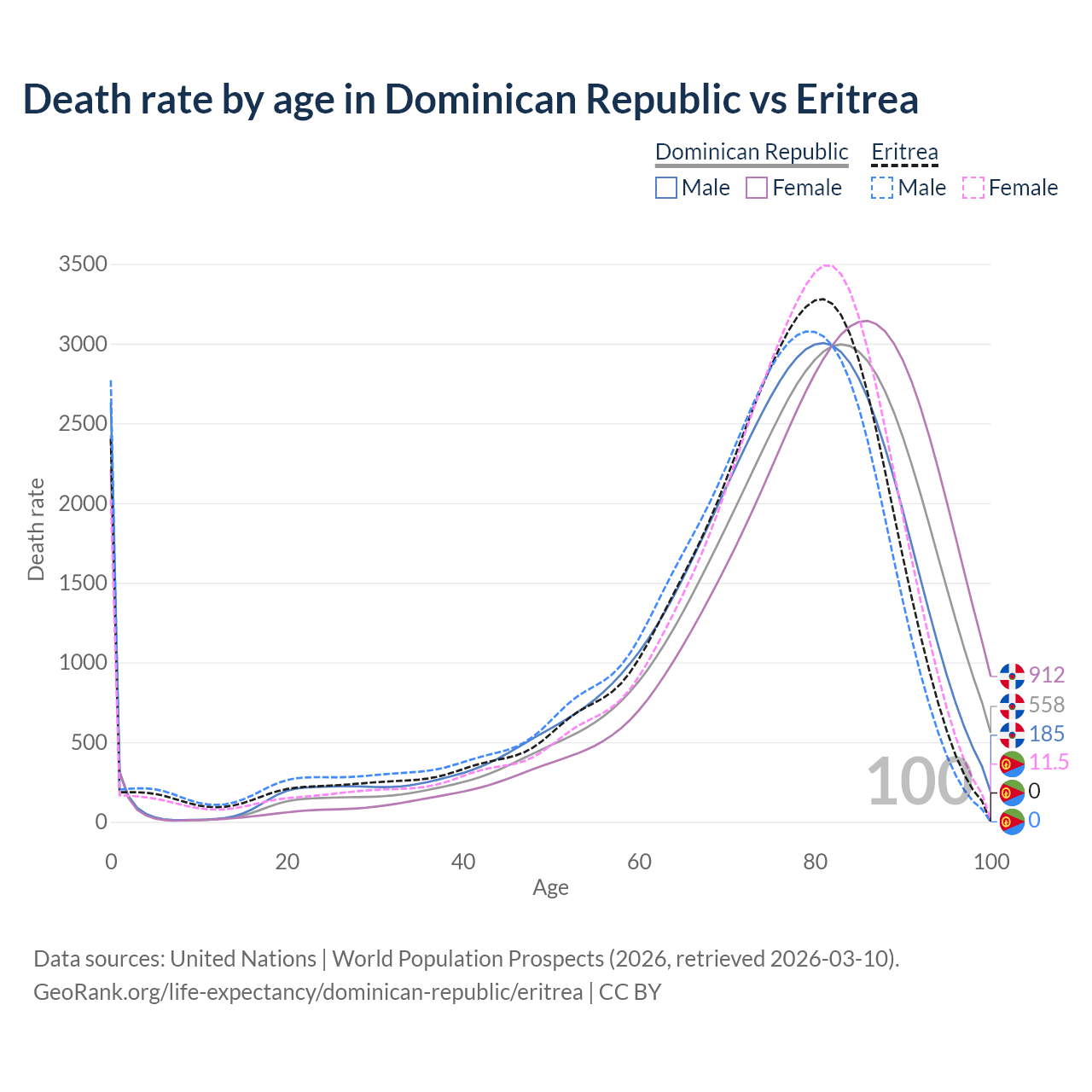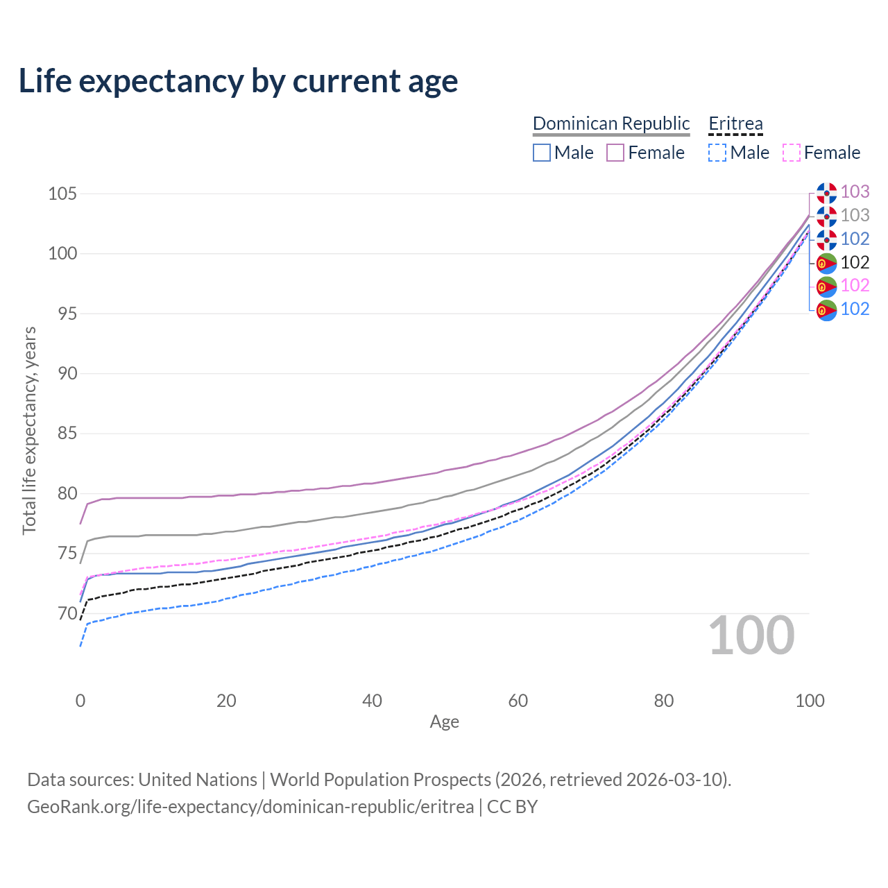 This life expectancy calculator shows the odds of living to 100, 95, 90, and below based on current age for both males and females in the Dominican Republic and Eritrea, along with mean and median age of death. The calculations are based on the 2026 life tables (actuarial tables) from the UN World Population Prospects.