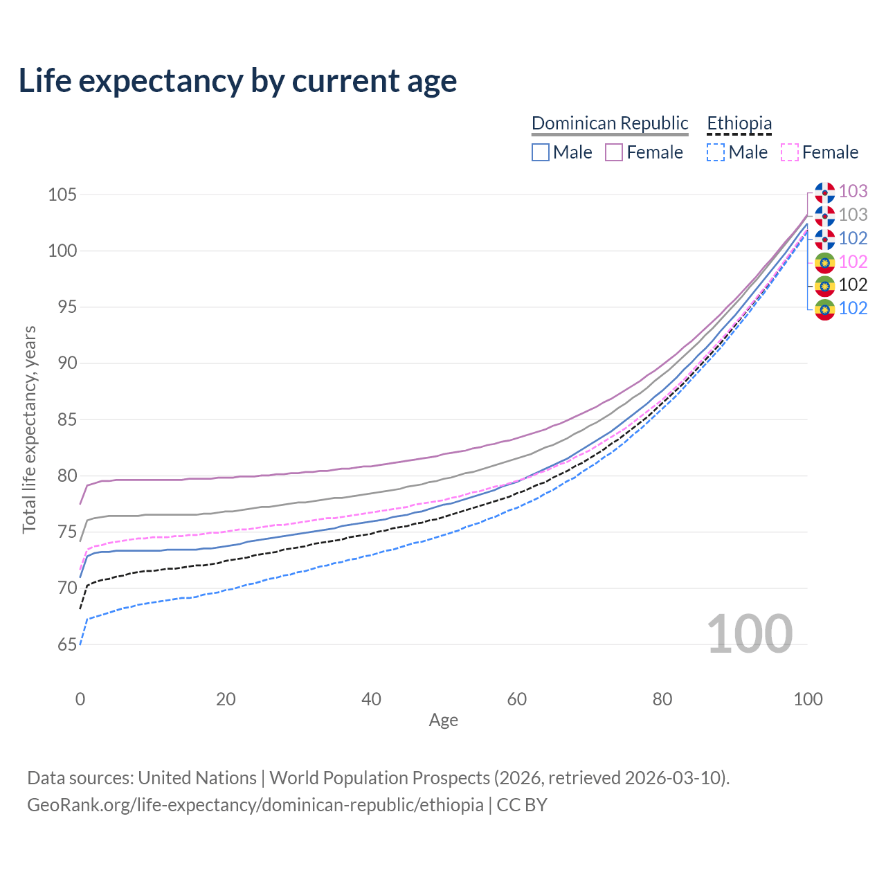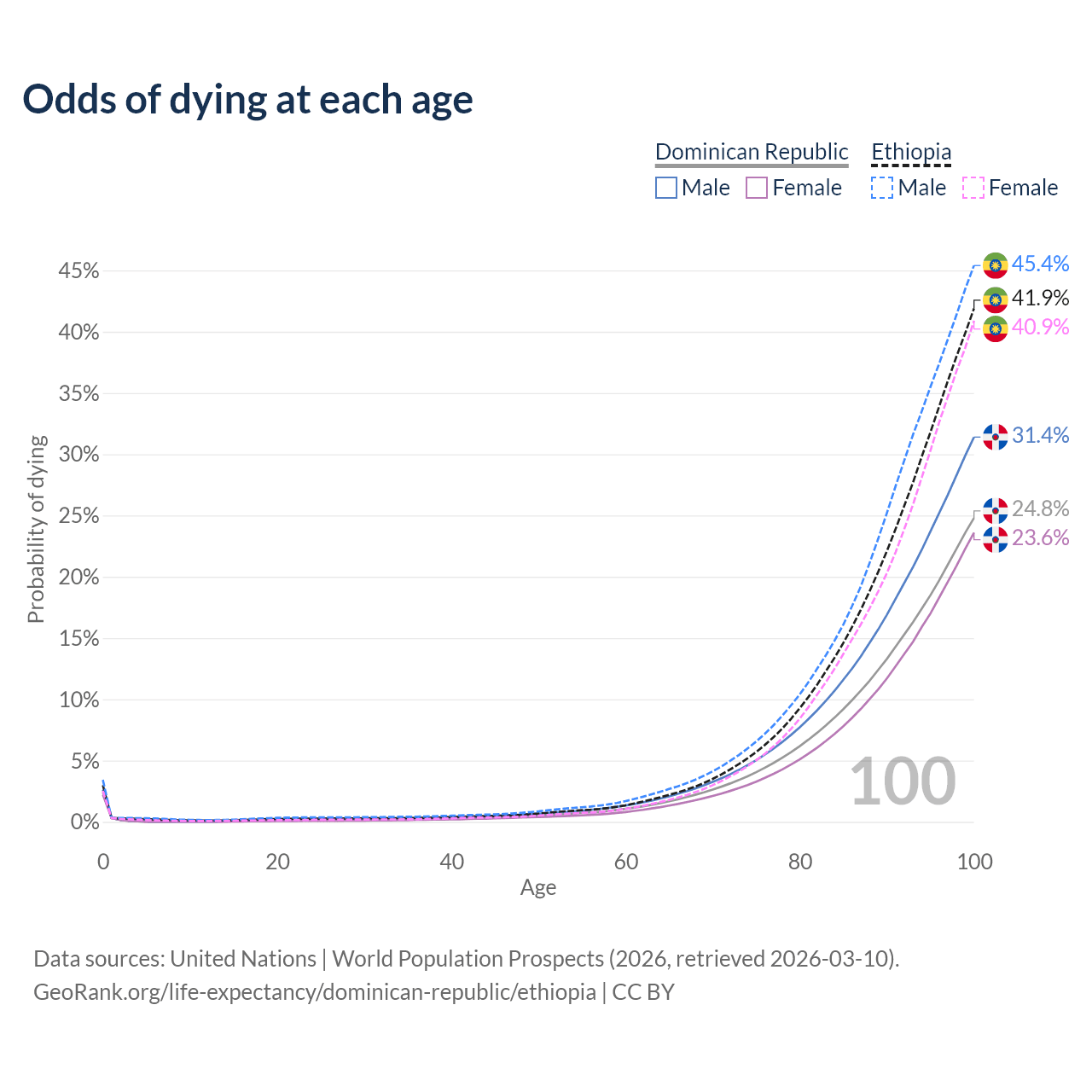 This life expectancy calculator shows the odds of living to 100, 95, 90, and below based on current age for both males and females in the Dominican Republic and Ethiopia, along with mean and median age of death. The calculations are based on the 2026 life tables (actuarial tables) from the UN World Population Prospects.