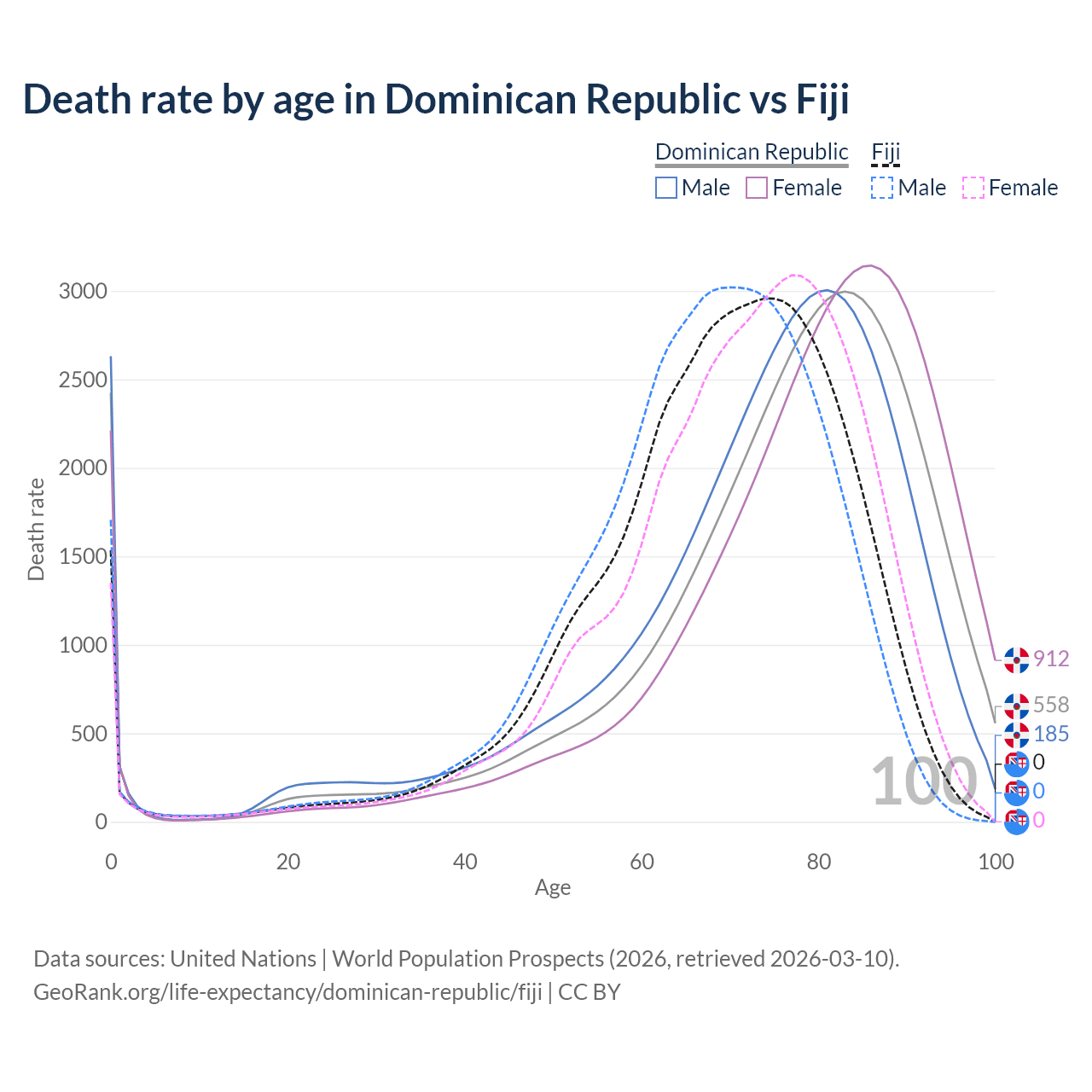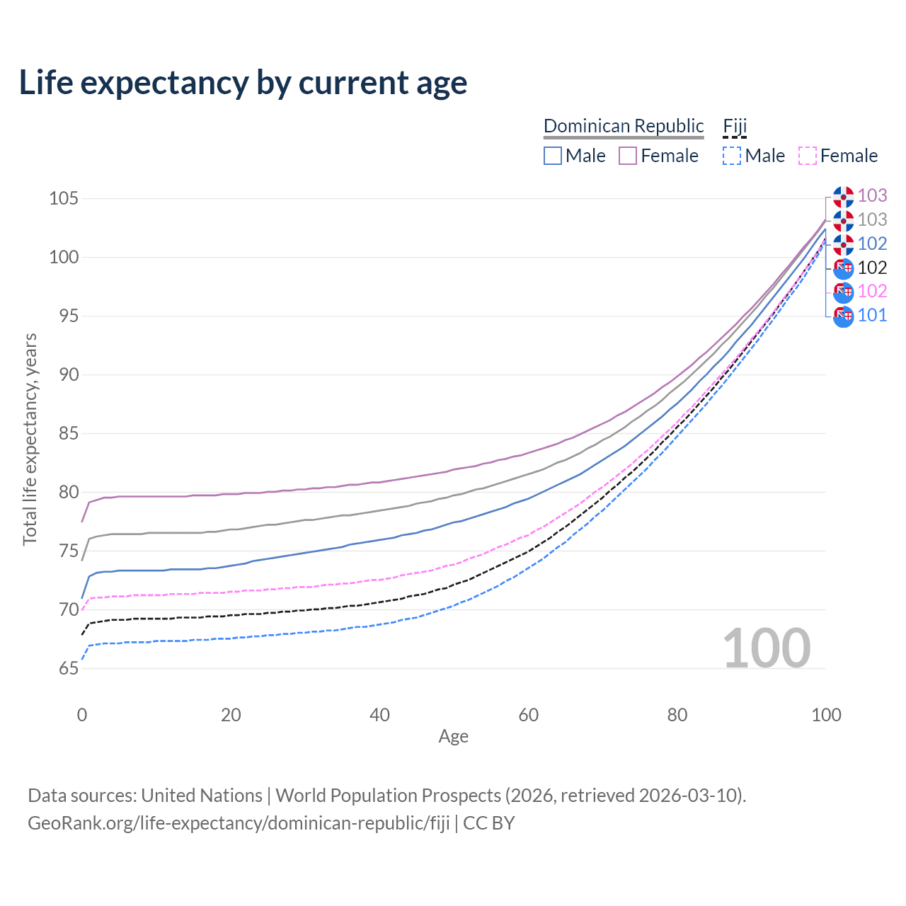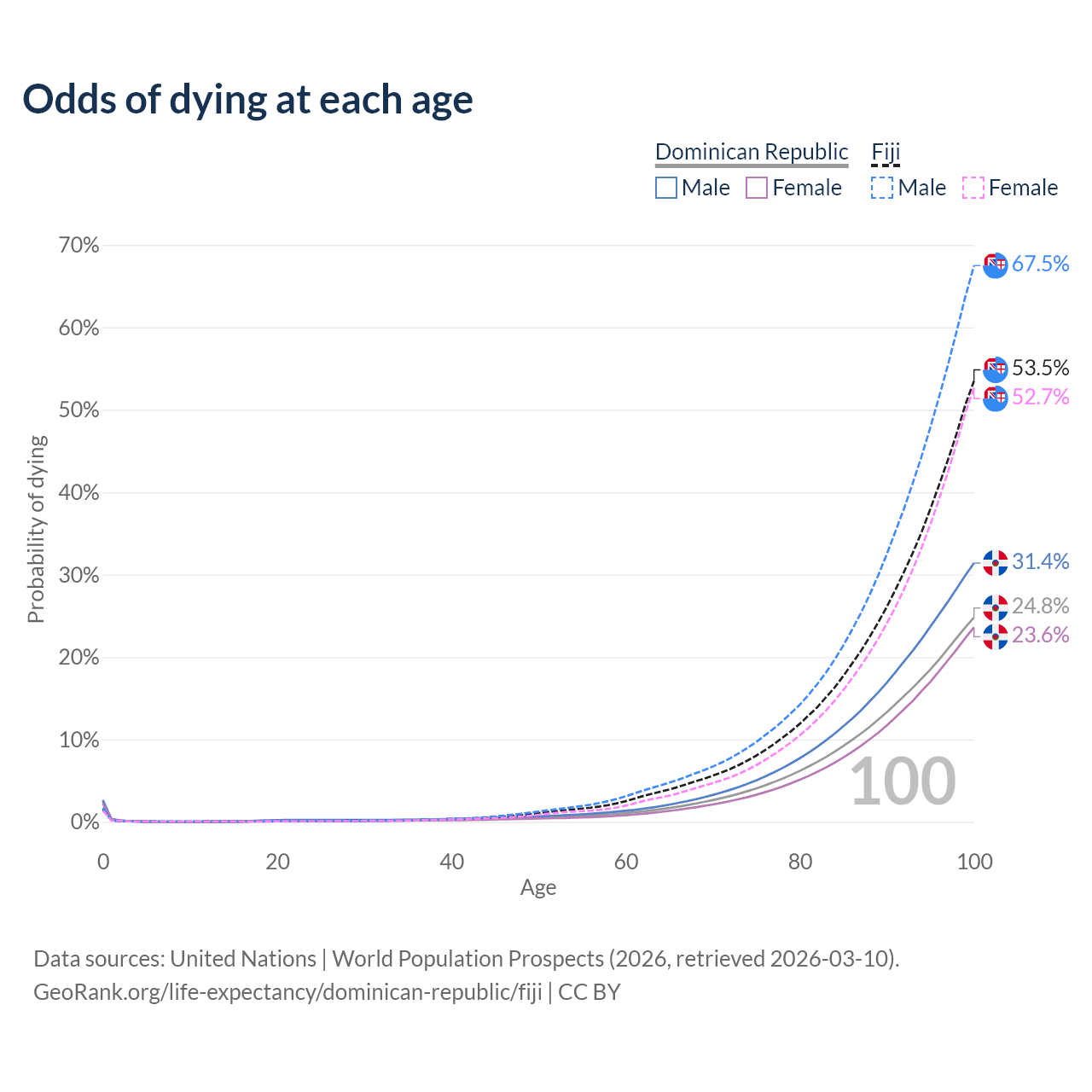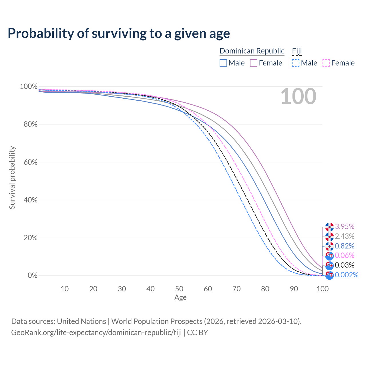 This life expectancy calculator shows the odds of living to 100, 95, 90, and below based on current age for both males and females in the Dominican Republic and Fiji, along with mean and median age of death. The calculations are based on the 2026 life tables (actuarial tables) from the UN World Population Prospects.