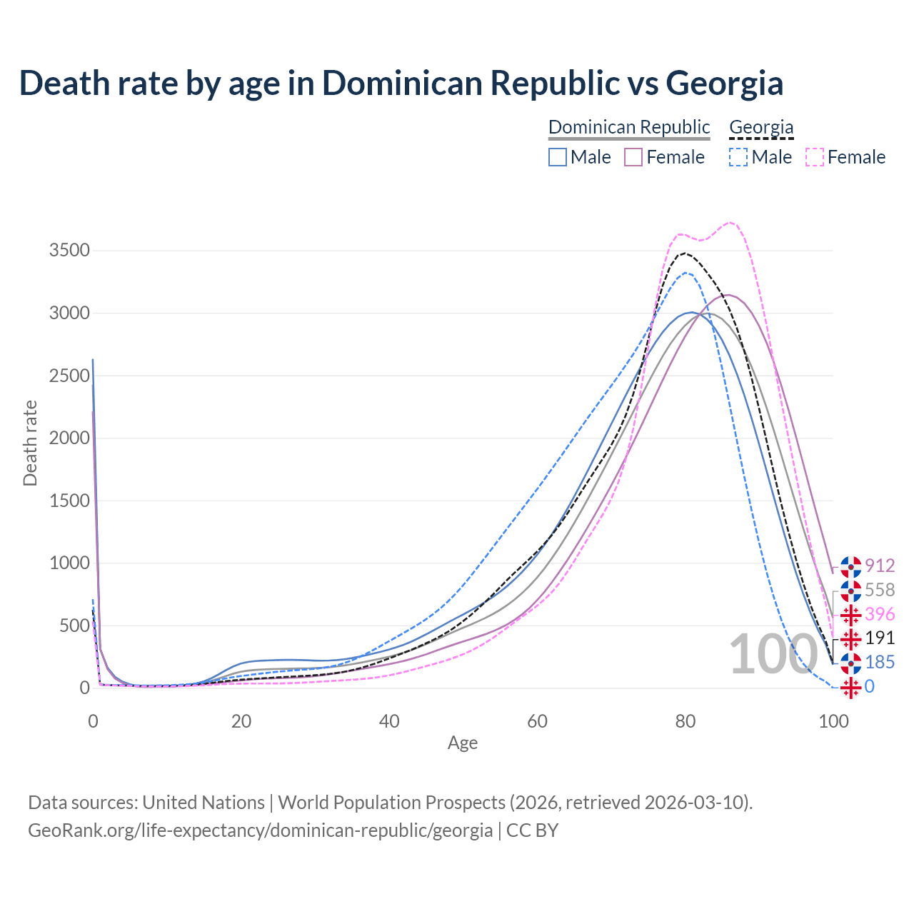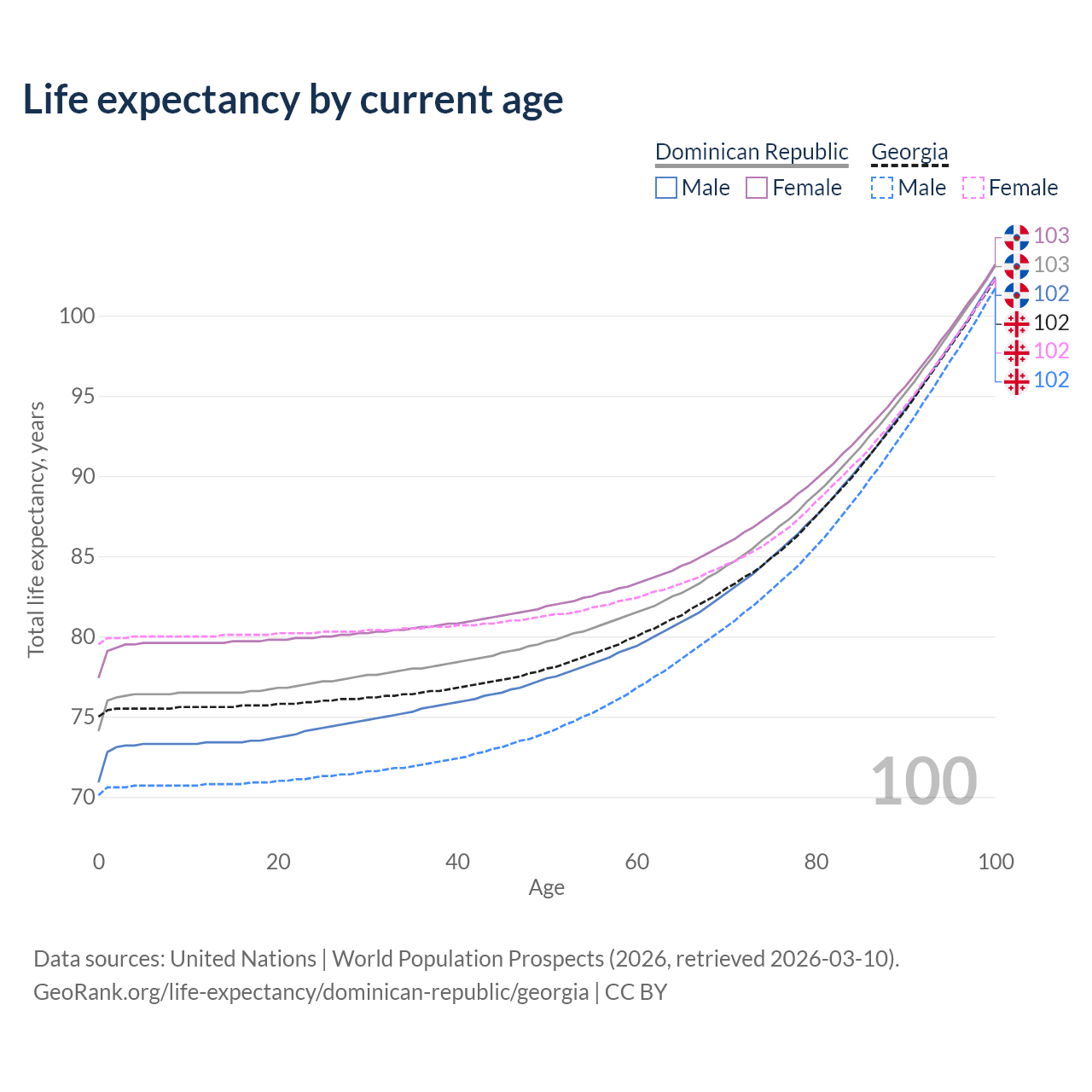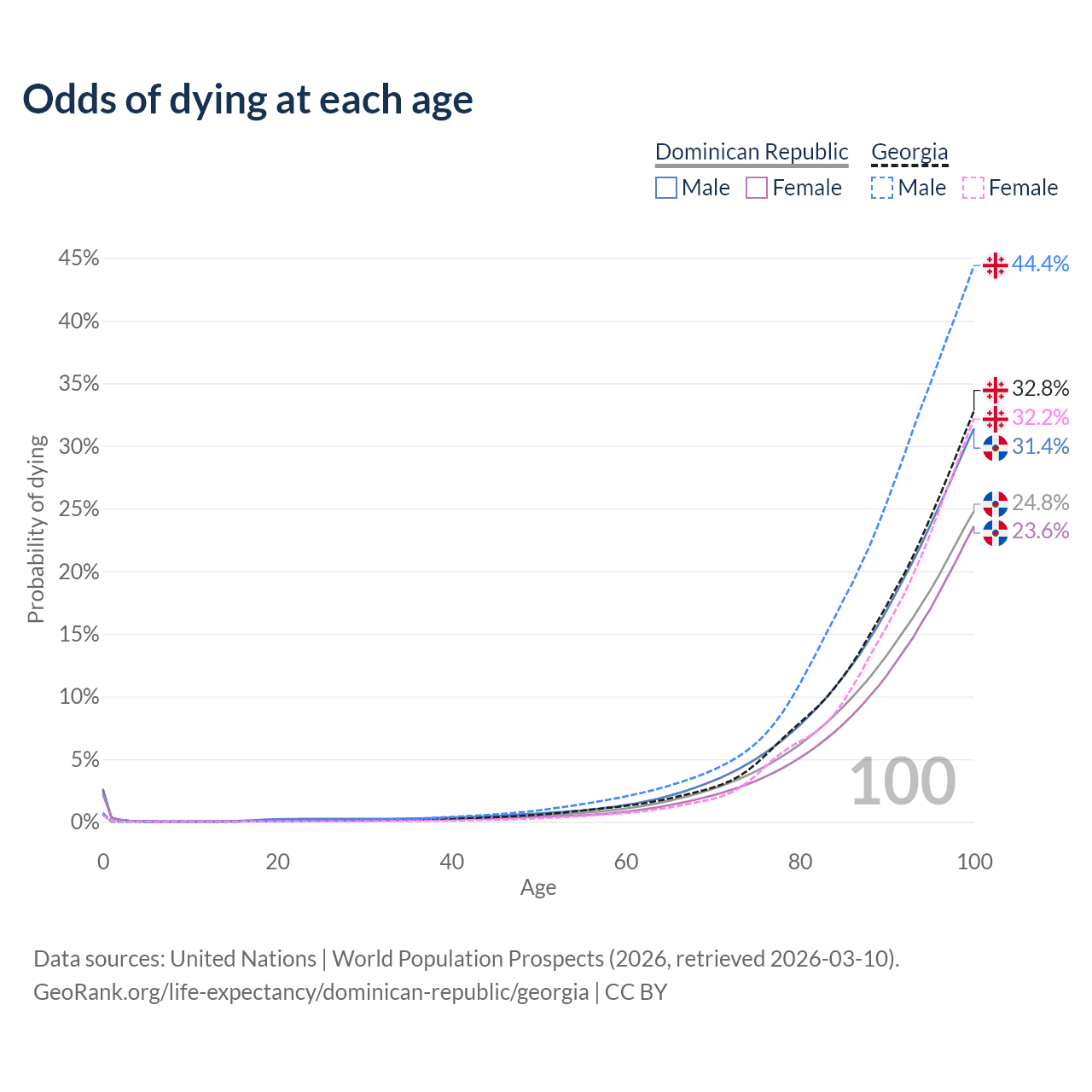 This life expectancy calculator shows the odds of living to 100, 95, 90, and below based on current age for both males and females in the Dominican Republic and Georgia, along with mean and median age of death. The calculations are based on the 2026 life tables (actuarial tables) from the UN World Population Prospects.