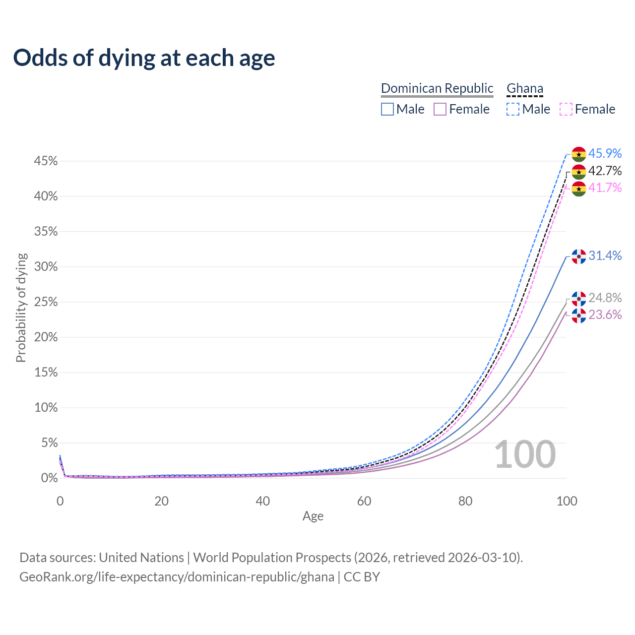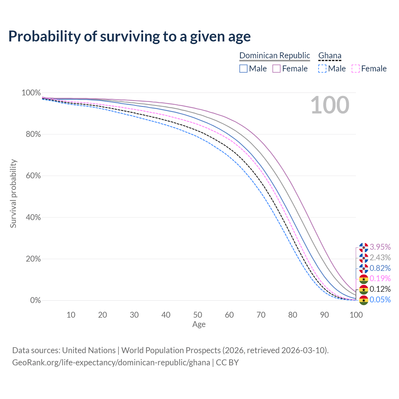 This life expectancy calculator shows the odds of living to 100, 95, 90, and below based on current age for both males and females in the Dominican Republic and Ghana, along with mean and median age of death. The calculations are based on the 2026 life tables (actuarial tables) from the UN World Population Prospects.