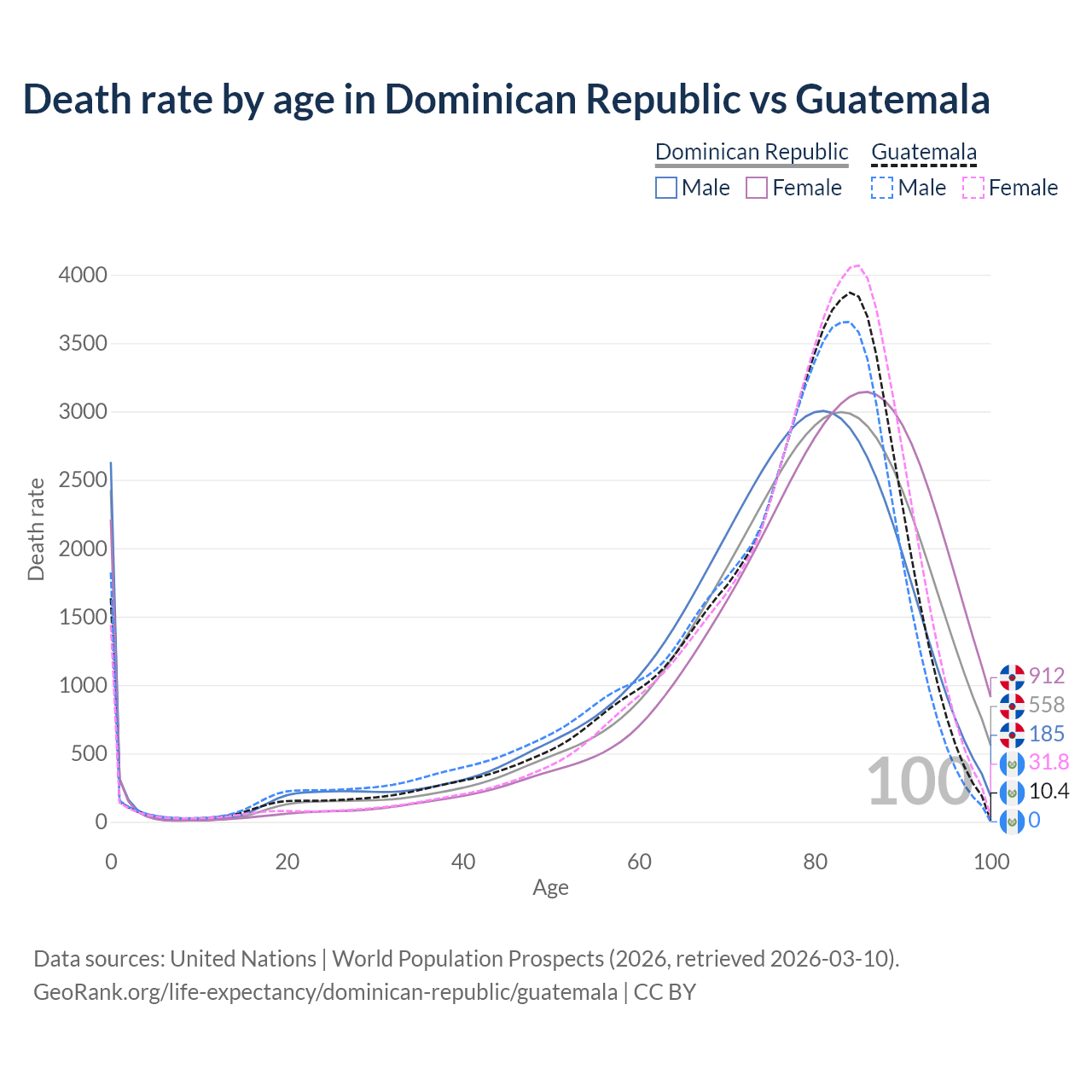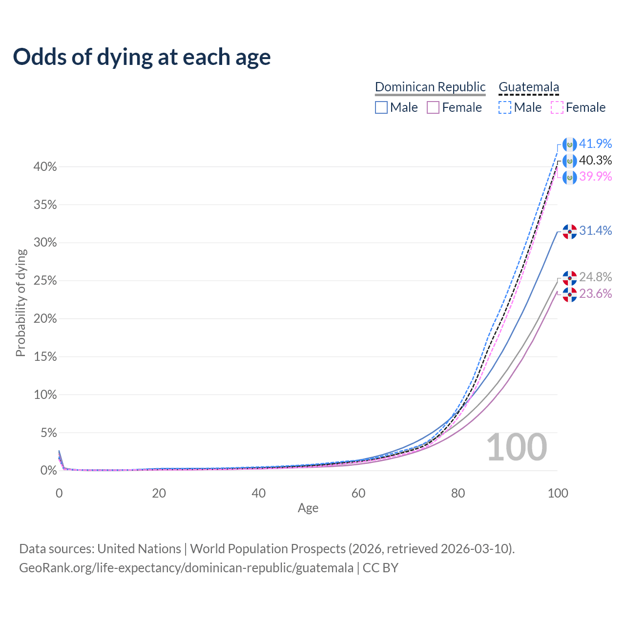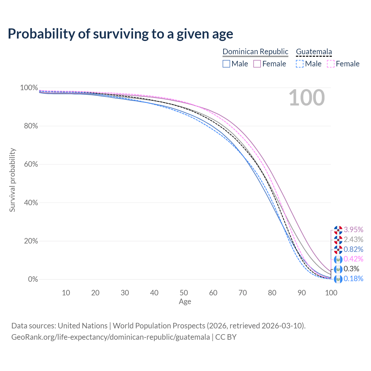 This life expectancy calculator shows the odds of living to 100, 95, 90, and below based on current age for both males and females in the Dominican Republic and Guatemala, along with mean and median age of death. The calculations are based on the 2026 life tables (actuarial tables) from the UN World Population Prospects.