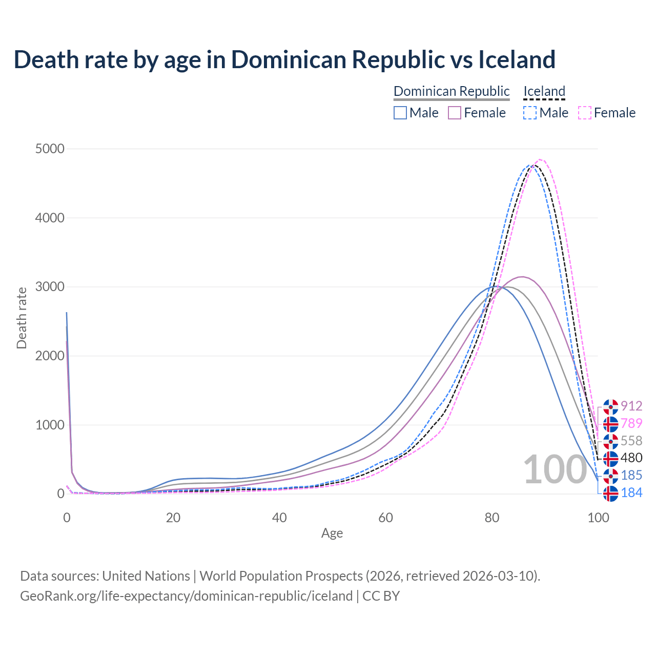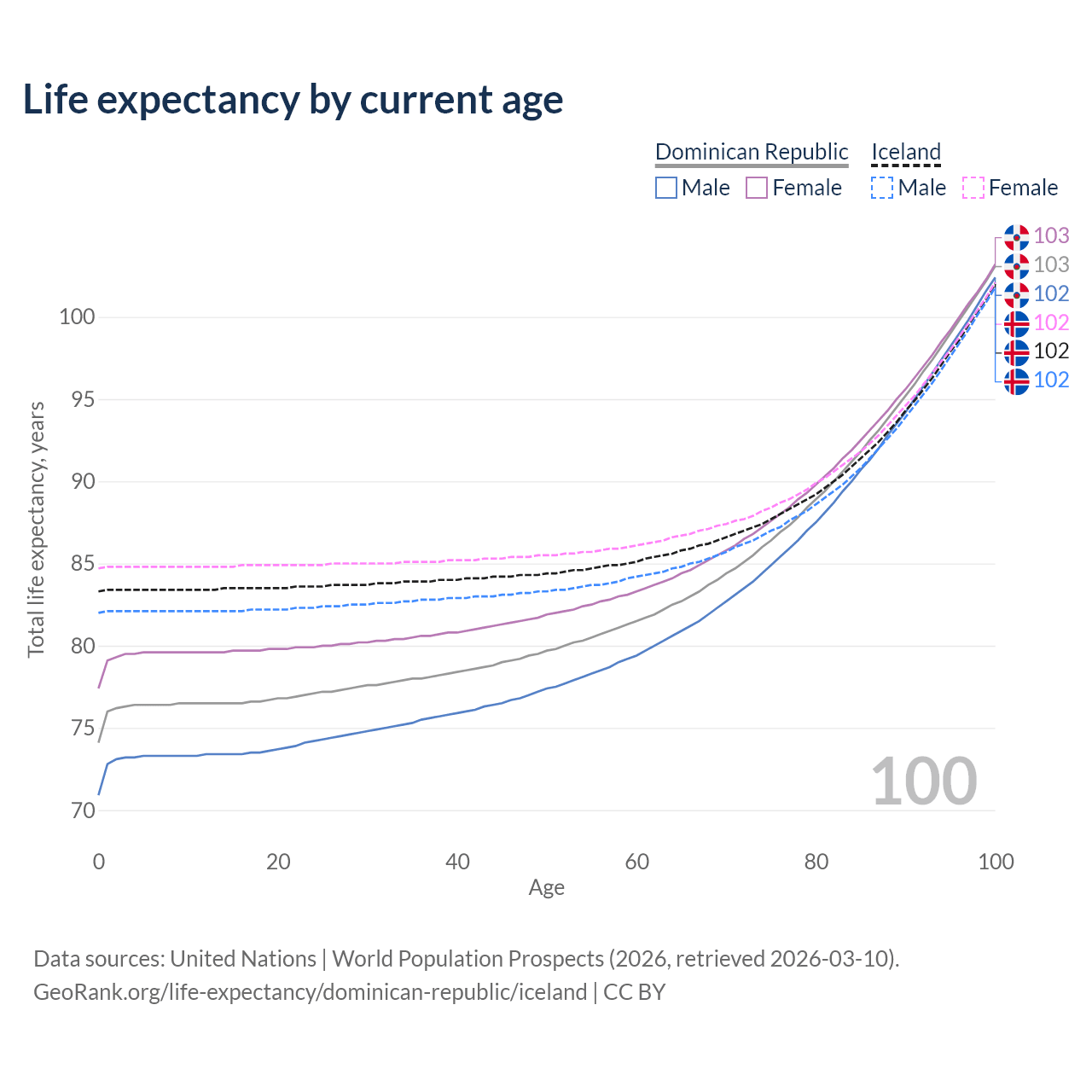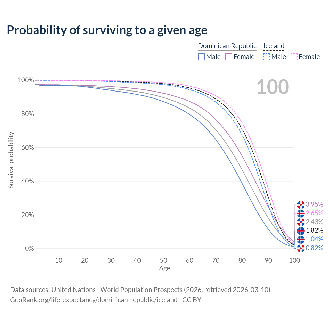 This life expectancy calculator shows the odds of living to 100, 95, 90, and below based on current age for both males and females in the Dominican Republic and Iceland, along with mean and median age of death. The calculations are based on the 2026 life tables (actuarial tables) from the UN World Population Prospects.