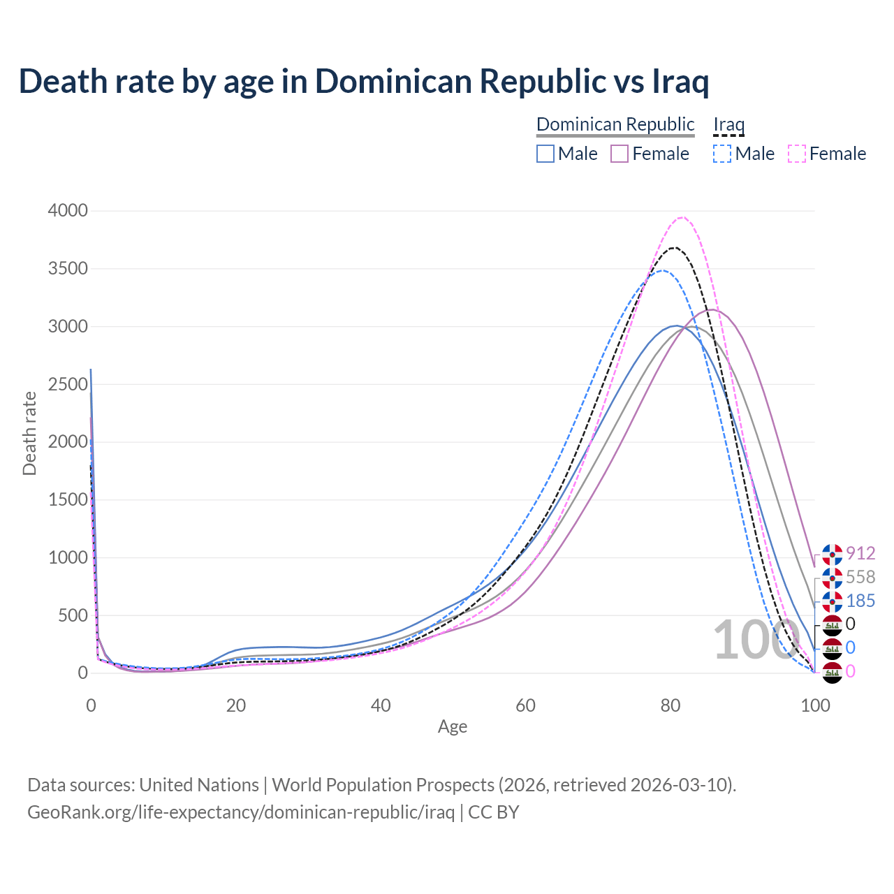 In the Dominican Republic, the most common age of death is 83, compared to 81 in Iraq. The median age of death is 78.9 in the Dominican Republic and 76.7 in Iraq, meaning only half of each cohort is expected to live past that age.