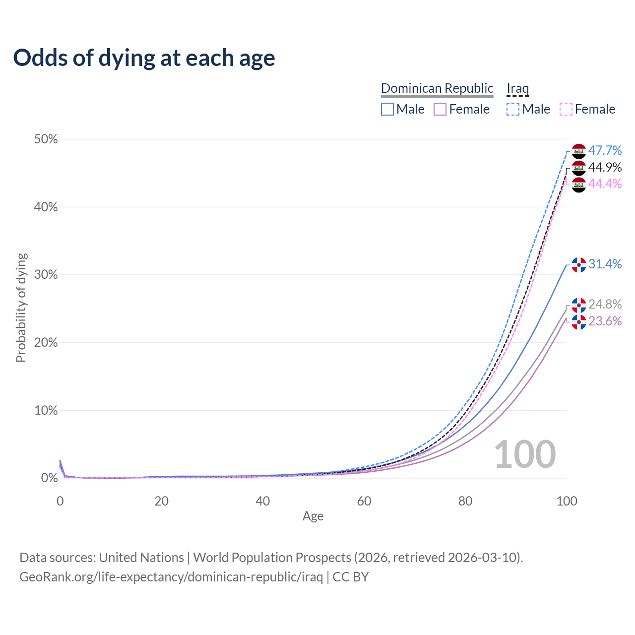This life expectancy calculator shows the odds of living to 100, 95, 90, and below based on current age for both males and females in the Dominican Republic and Iraq, along with mean and median age of death. The calculations are based on the 2026 life tables (actuarial tables) from the UN World Population Prospects.