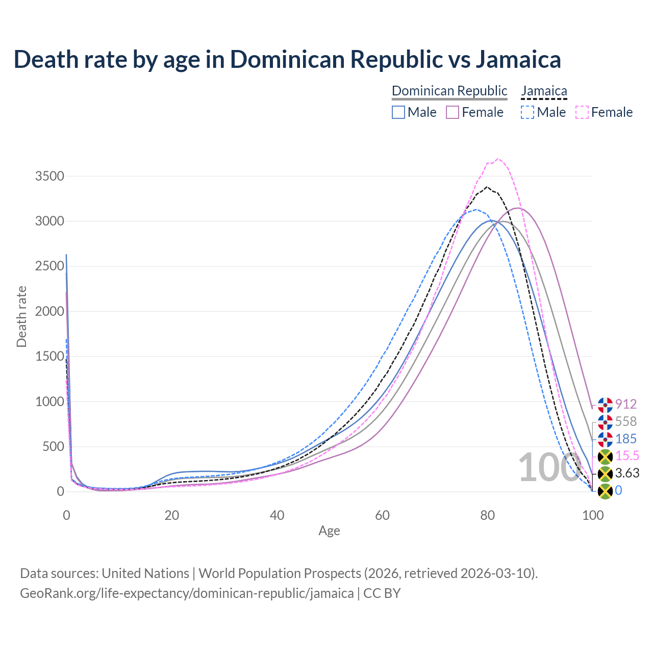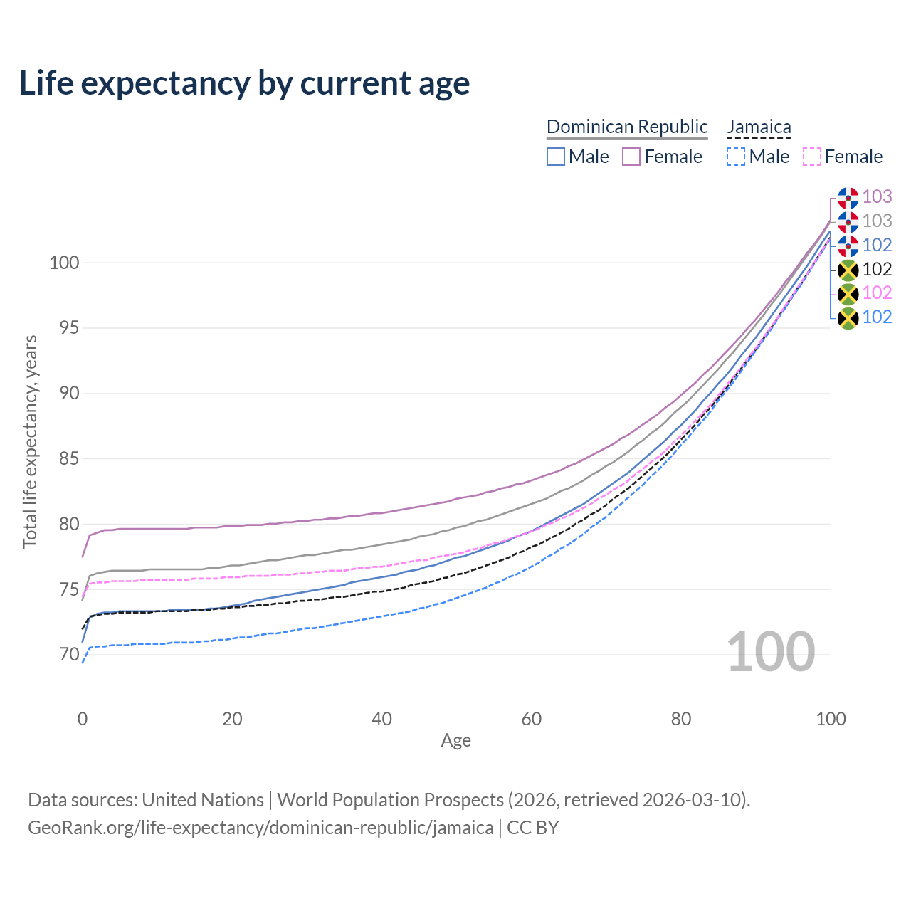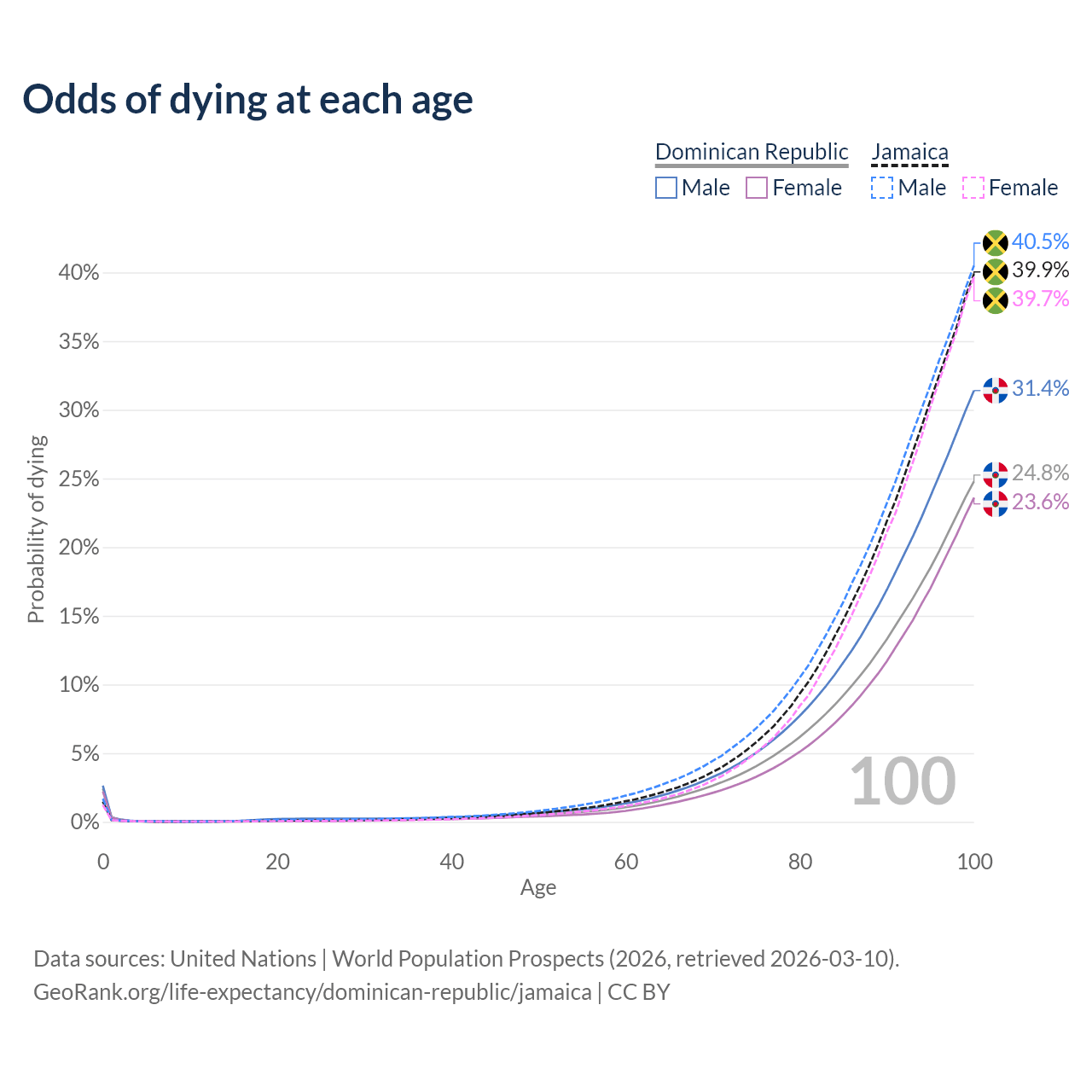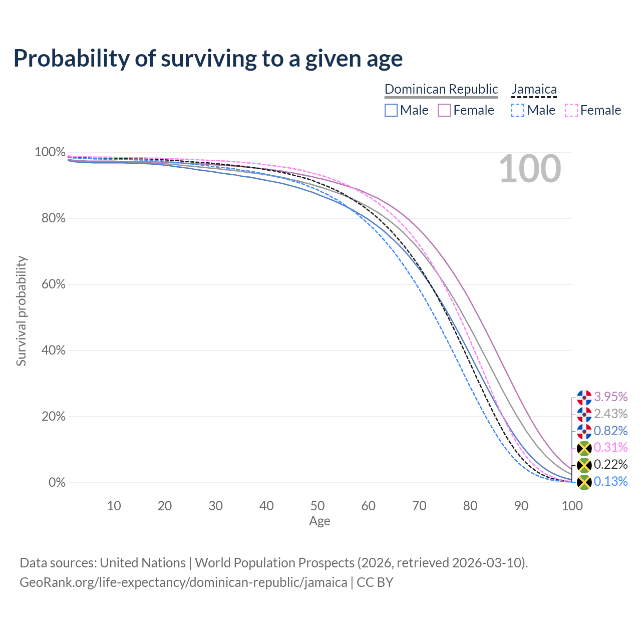 This life expectancy calculator shows the odds of living to 100, 95, 90, and below based on current age for both males and females in the Dominican Republic and Jamaica, along with mean and median age of death. The calculations are based on the 2026 life tables (actuarial tables) from the UN World Population Prospects.