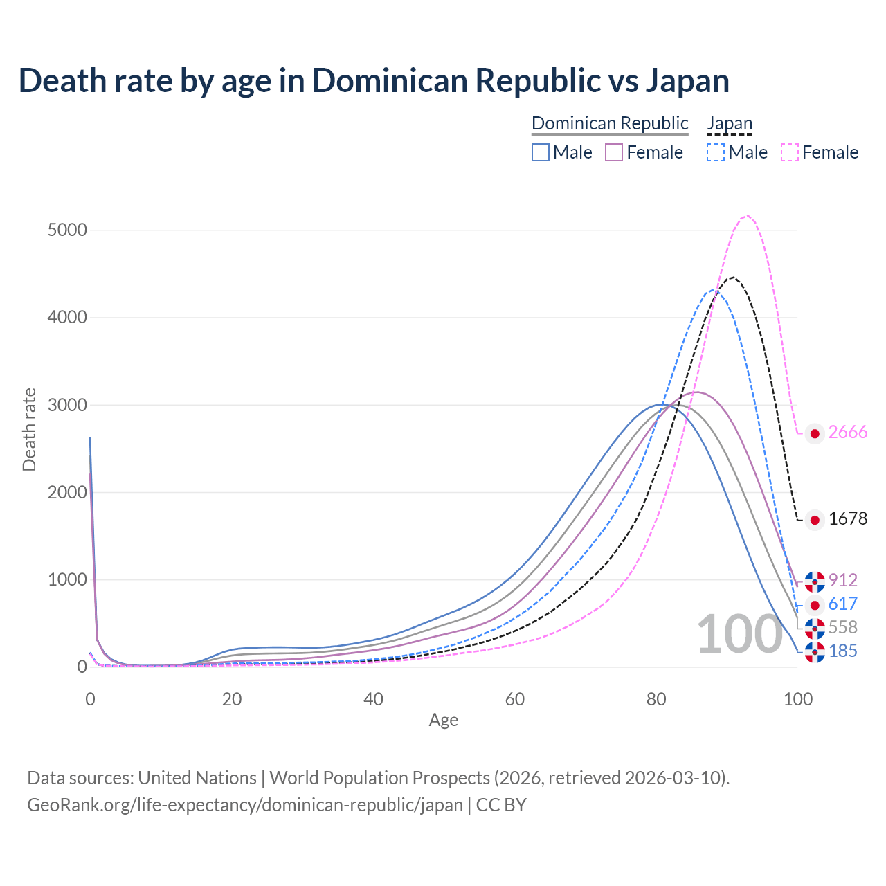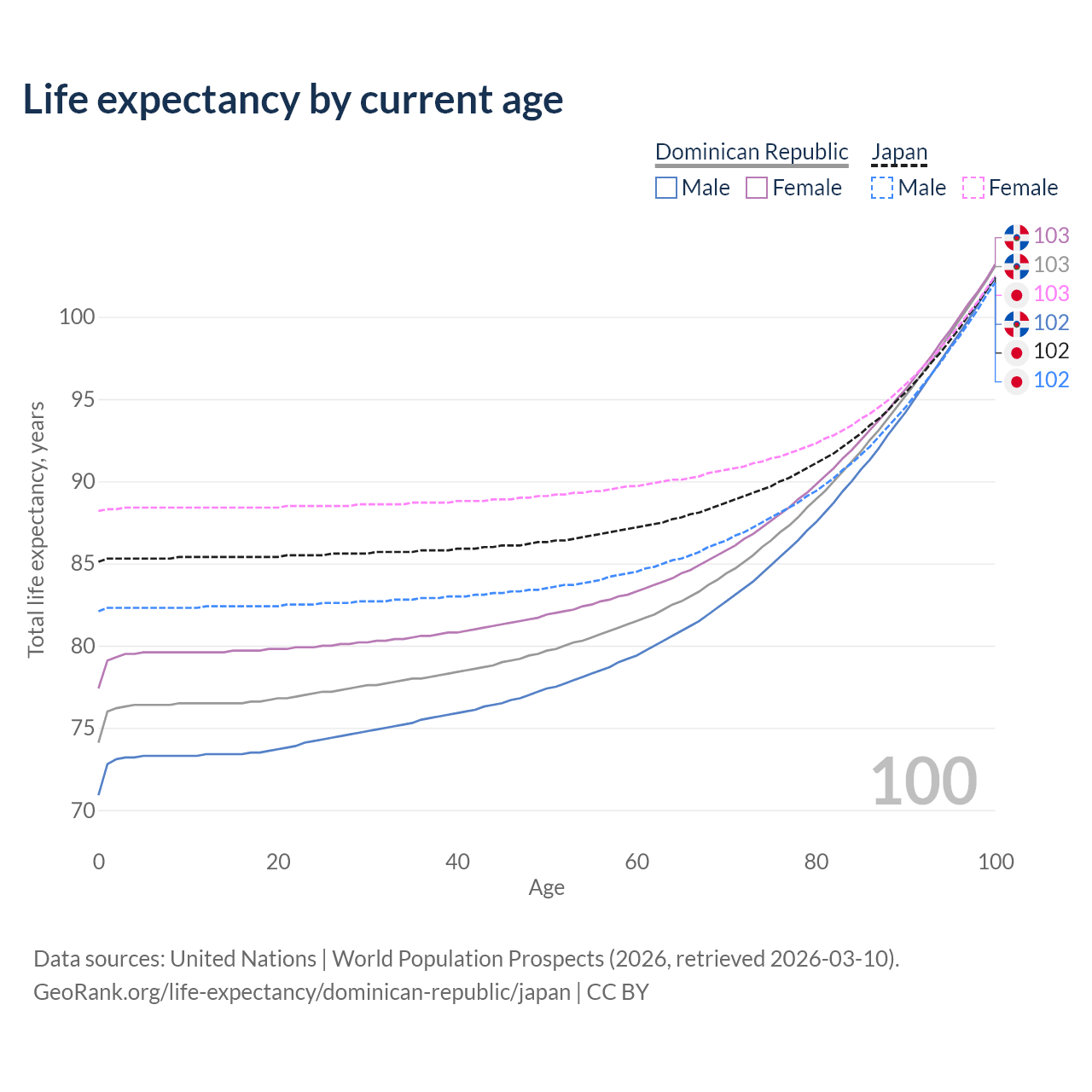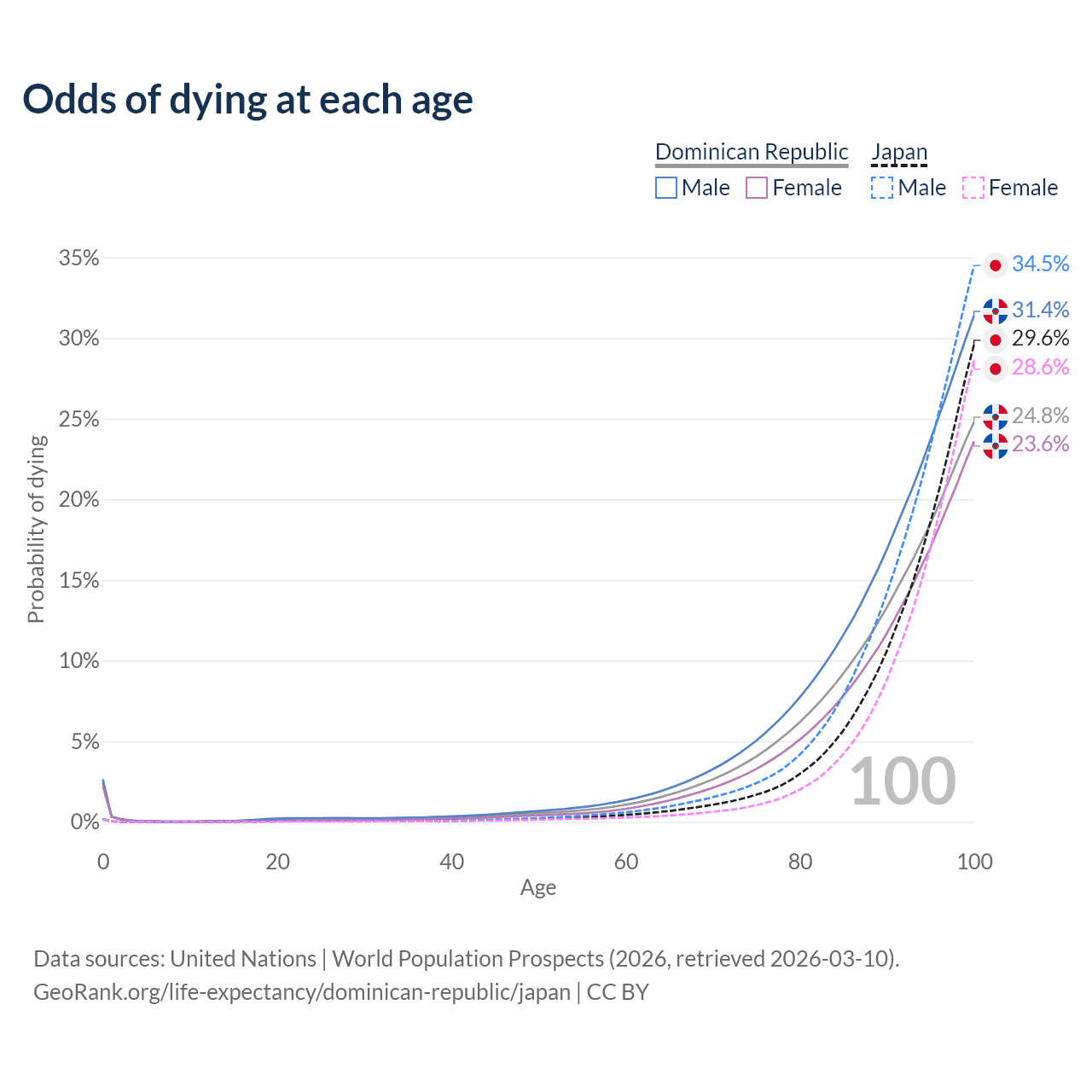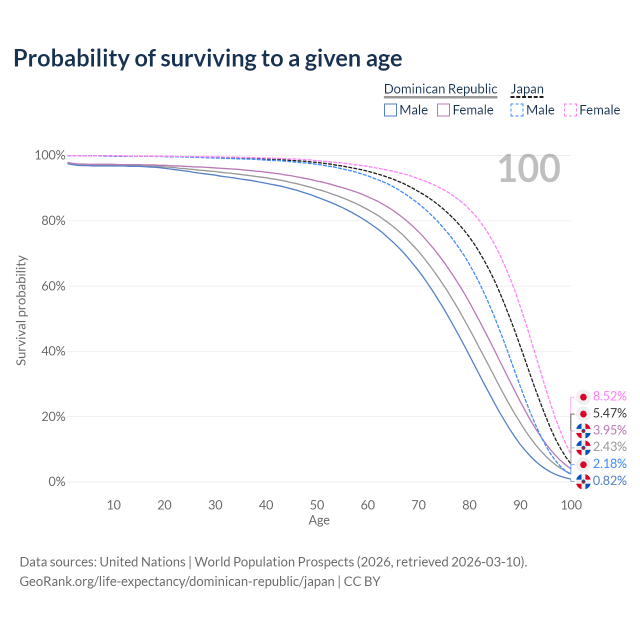 This life expectancy calculator shows the odds of living to 100, 95, 90, and below based on current age for both males and females in the Dominican Republic and Japan, along with mean and median age of death. The calculations are based on the 2026 life tables (actuarial tables) from the UN World Population Prospects.