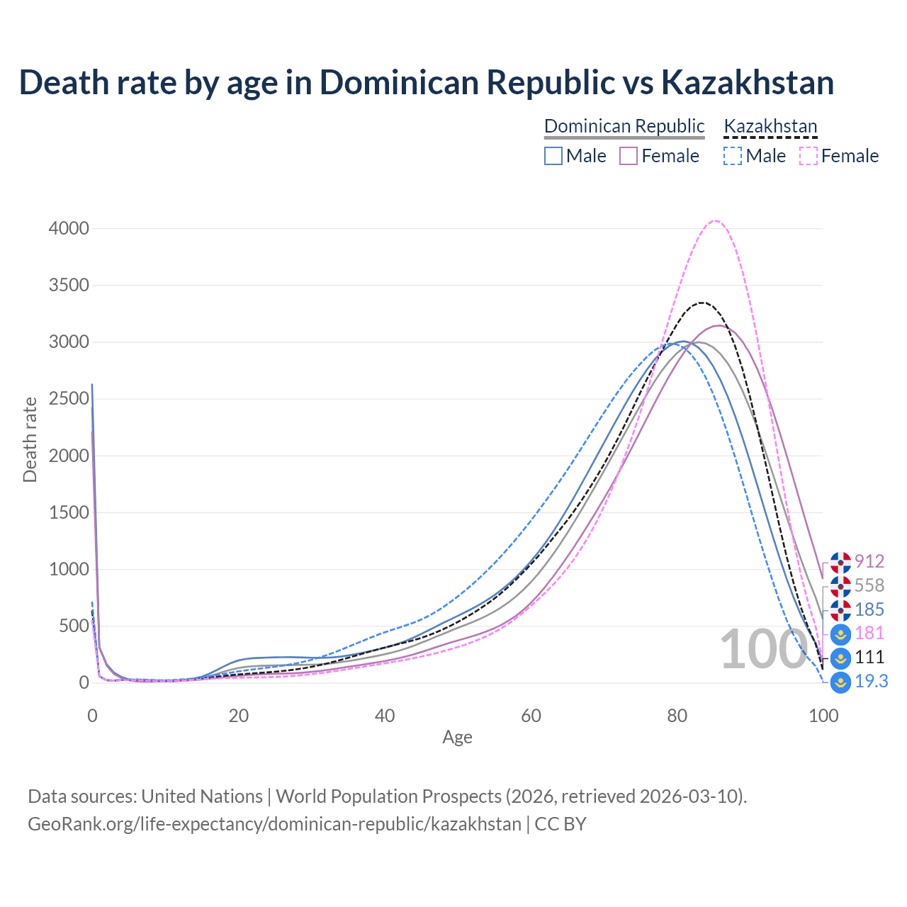 In the Dominican Republic, the most common age of death is 83, compared to 84 in Kazakhstan. The median age of death is 78.9 in the Dominican Republic and 78.6 in Kazakhstan, meaning only half of each cohort is expected to live past that age.
