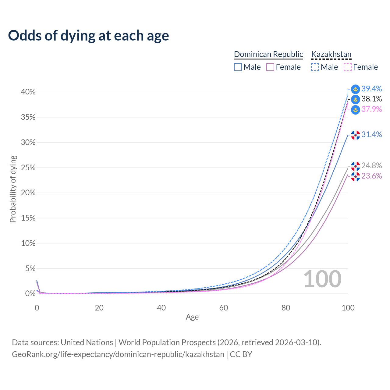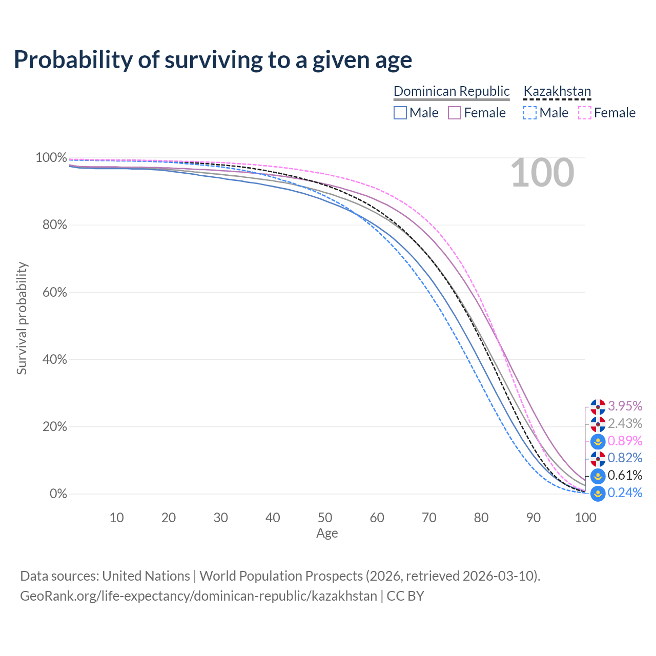 This life expectancy calculator shows the odds of living to 100, 95, 90, and below based on current age for both males and females in the Dominican Republic and Kazakhstan, along with mean and median age of death. The calculations are based on the 2026 life tables (actuarial tables) from the UN World Population Prospects.