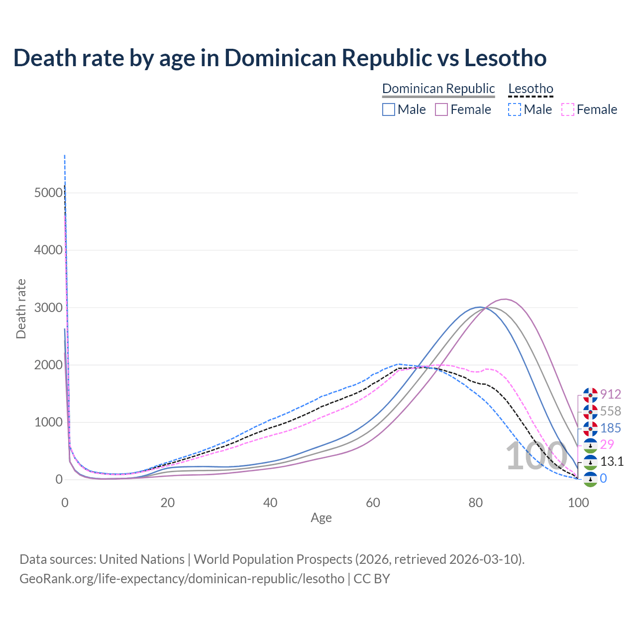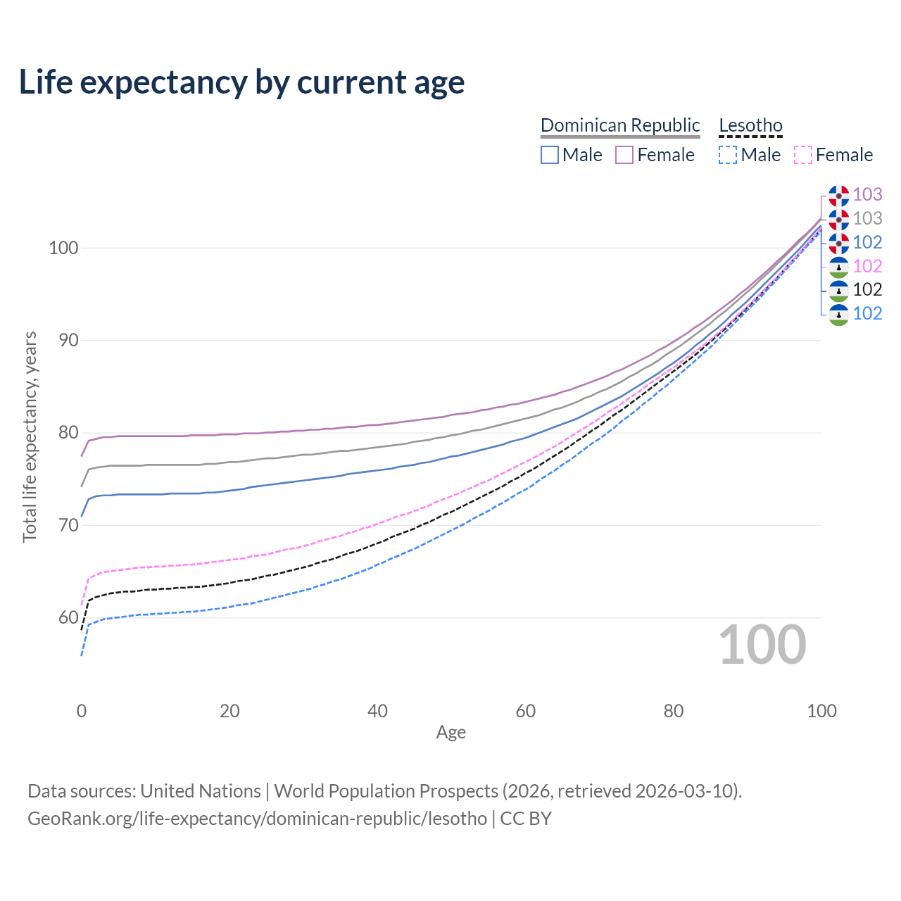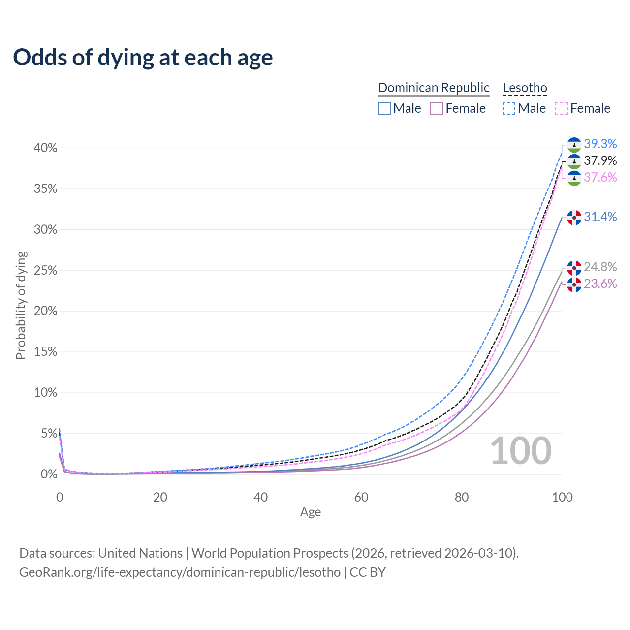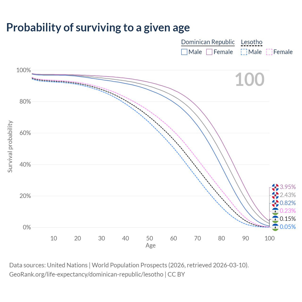 This life expectancy calculator shows the odds of living to 100, 95, 90, and below based on current age for both males and females in the Dominican Republic and Lesotho, along with mean and median age of death. The calculations are based on the 2026 life tables (actuarial tables) from the UN World Population Prospects.