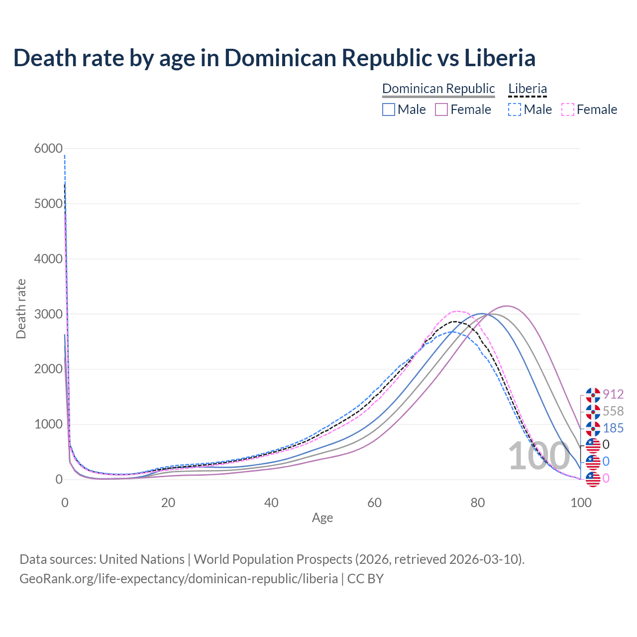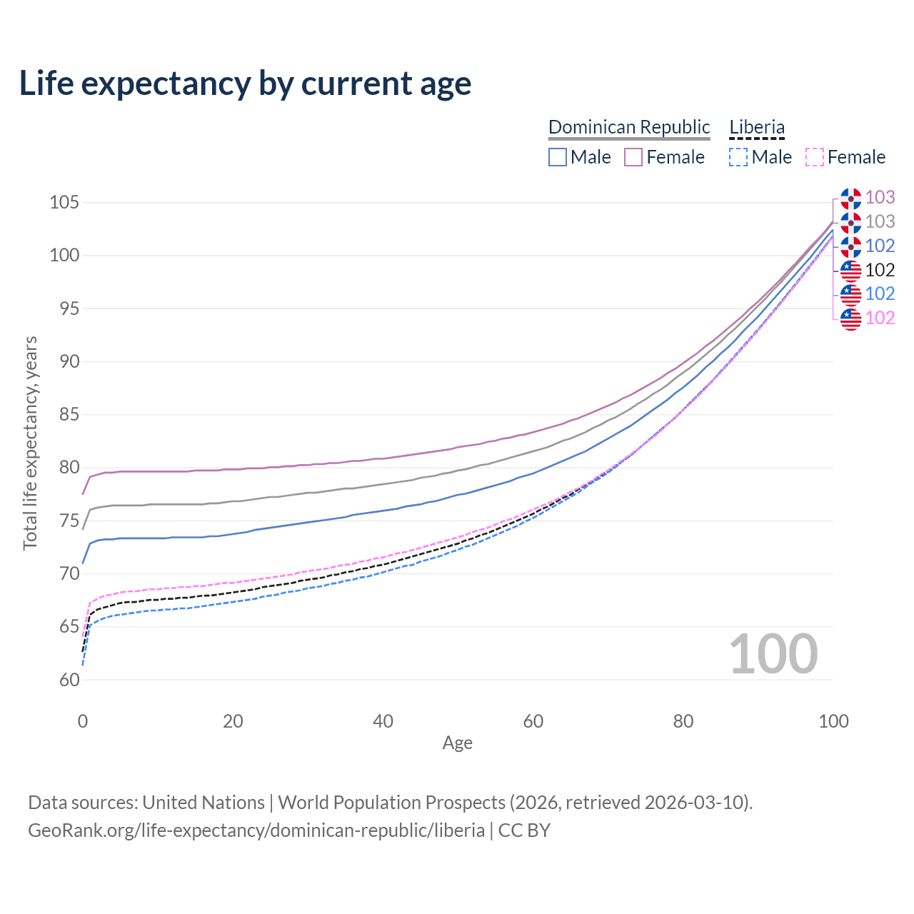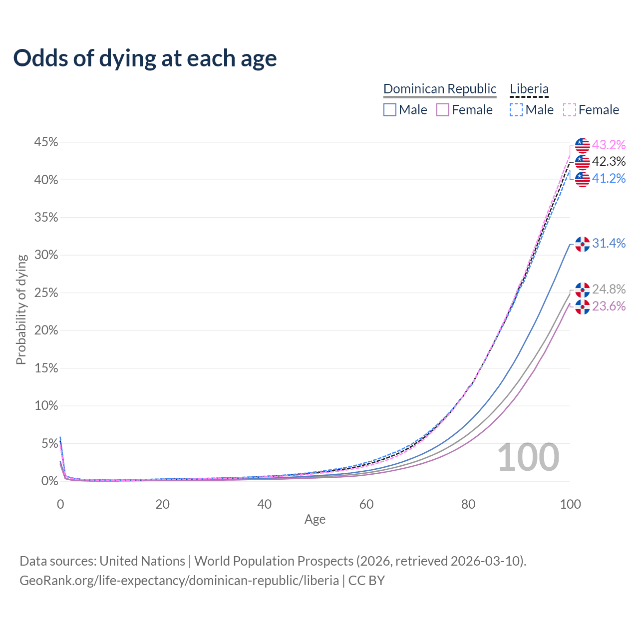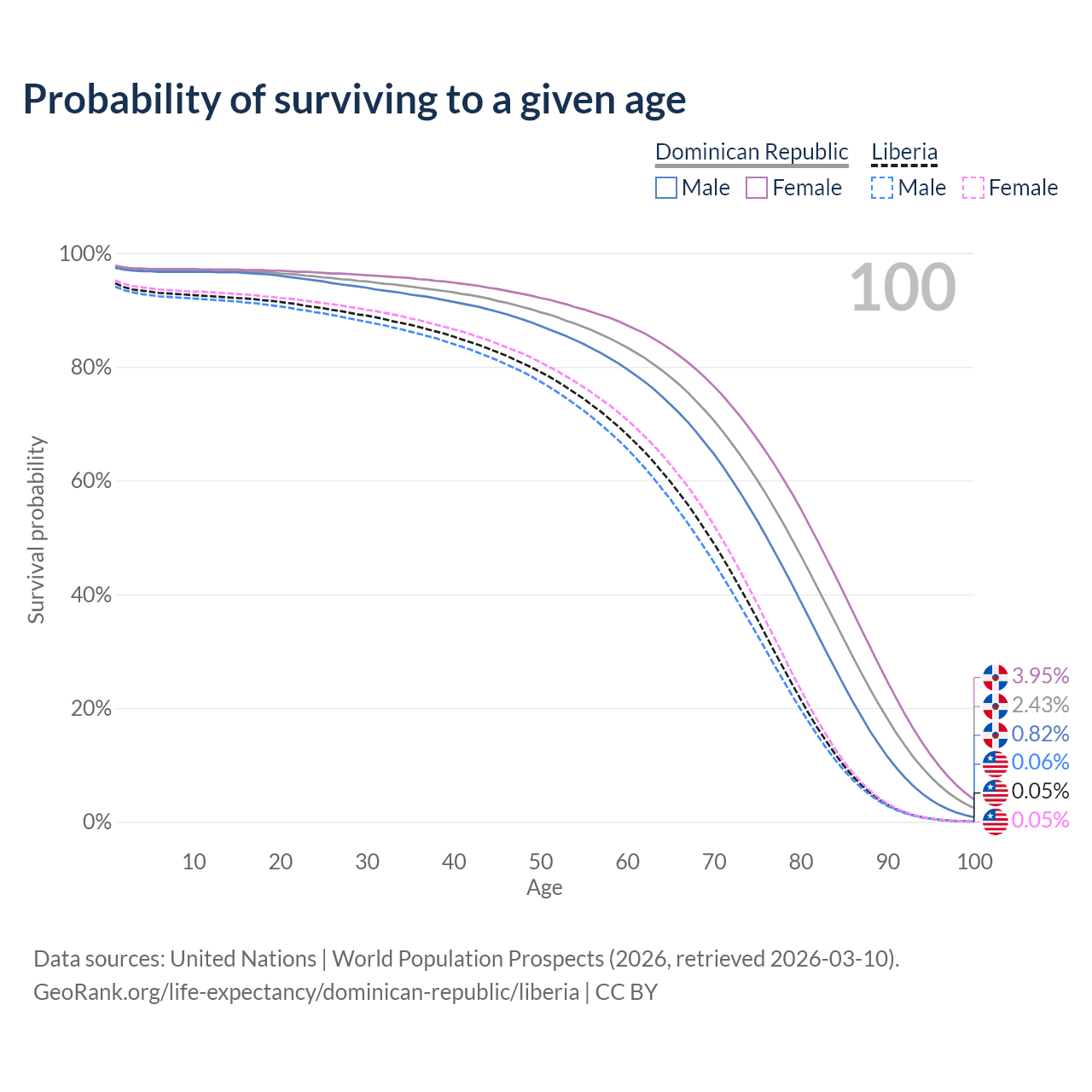 This life expectancy calculator shows the odds of living to 100, 95, 90, and below based on current age for both males and females in the Dominican Republic and Liberia, along with mean and median age of death. The calculations are based on the 2026 life tables (actuarial tables) from the UN World Population Prospects.