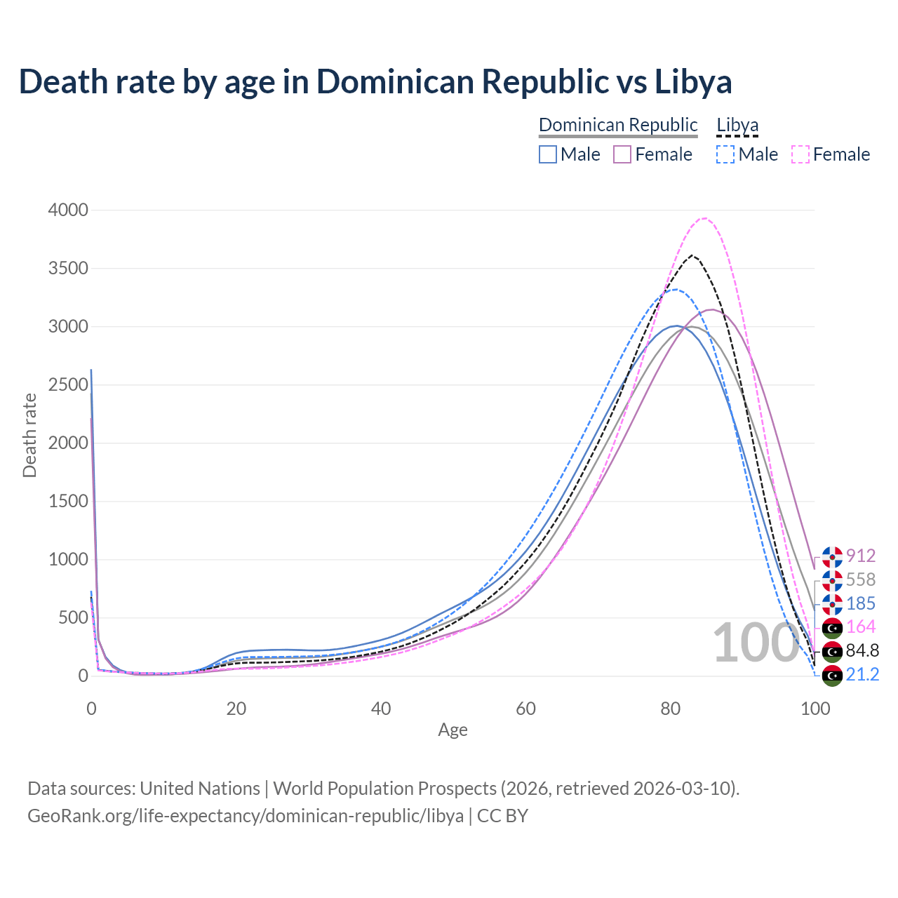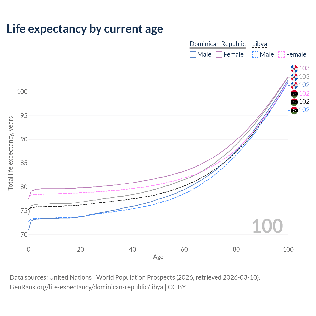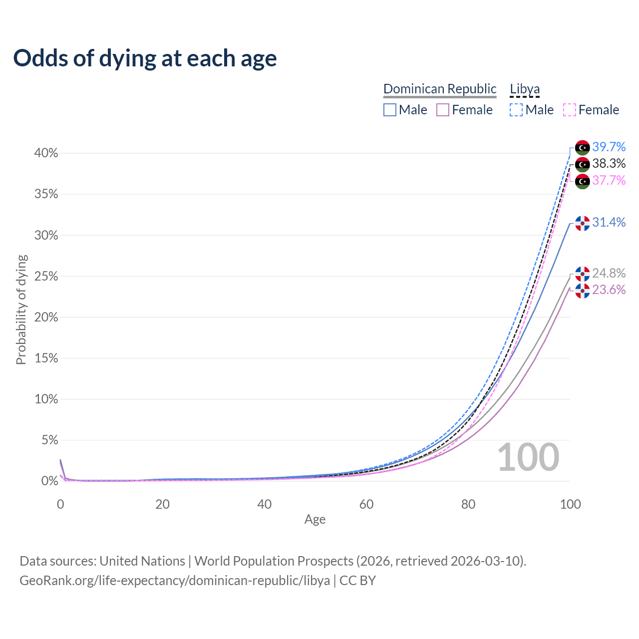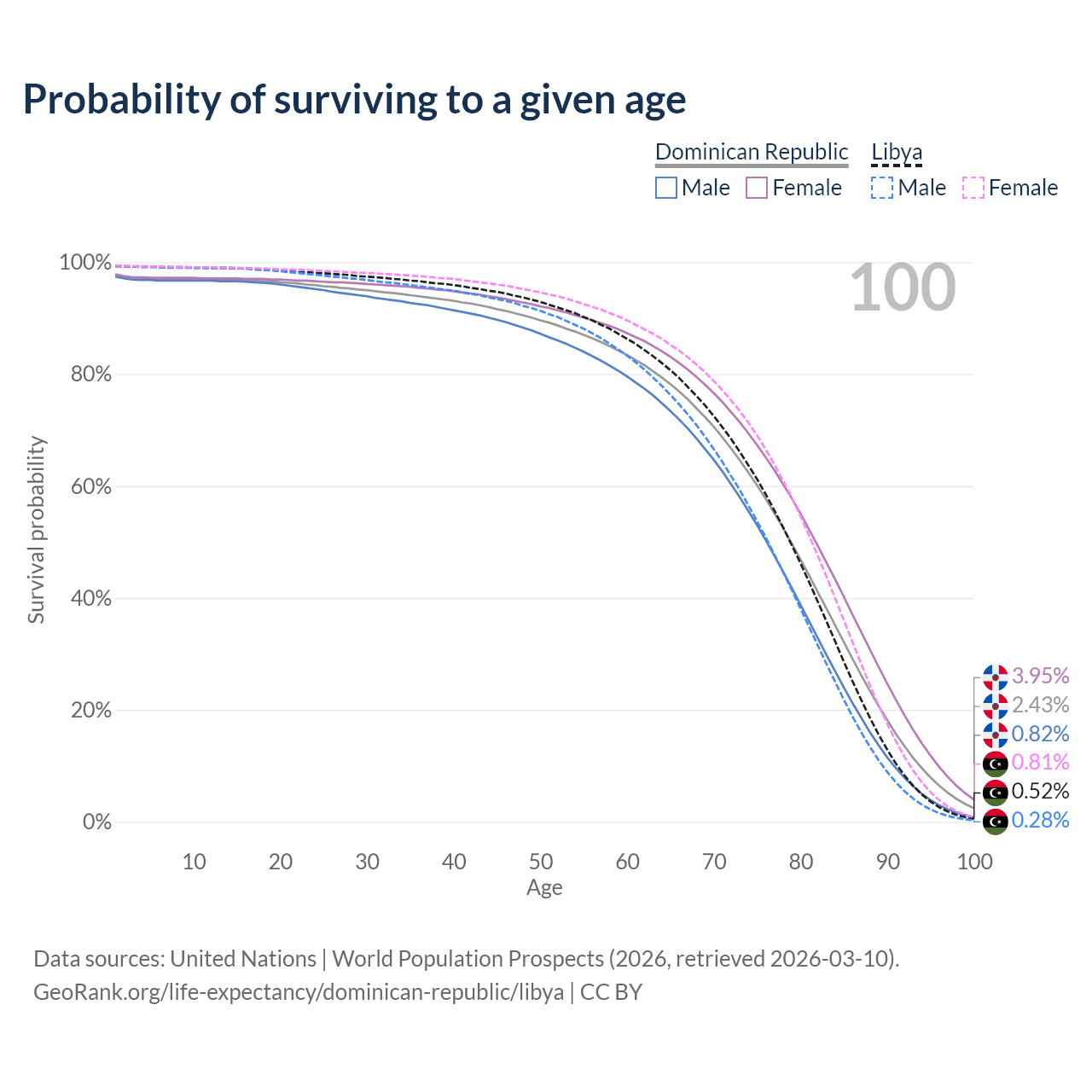 This life expectancy calculator shows the odds of living to 100, 95, 90, and below based on current age for both males and females in the Dominican Republic and Libya, along with mean and median age of death. The calculations are based on the 2026 life tables (actuarial tables) from the UN World Population Prospects.
