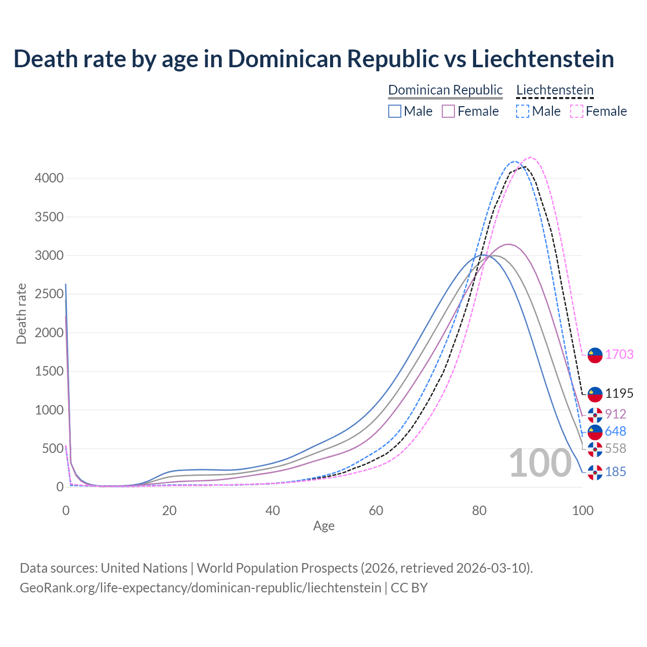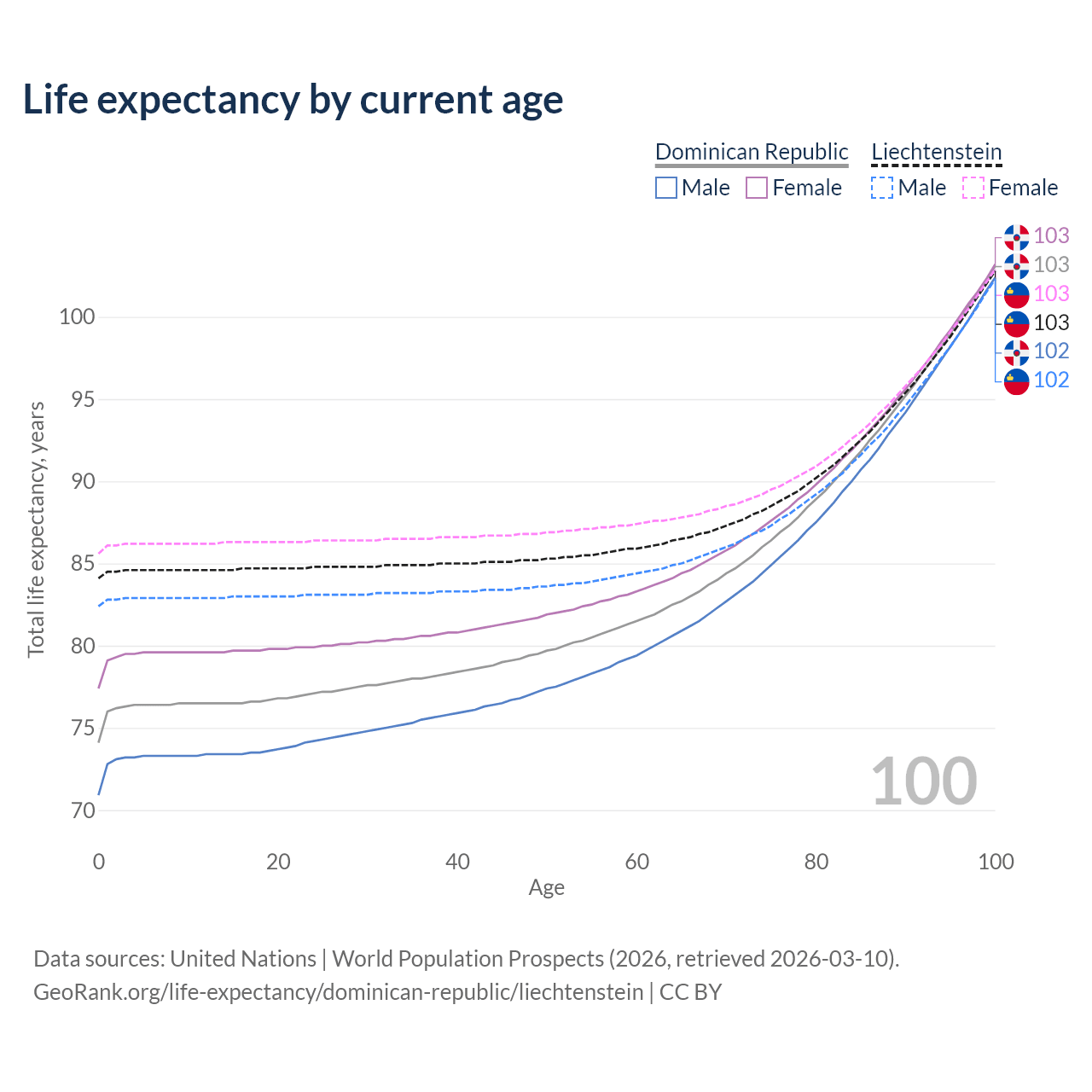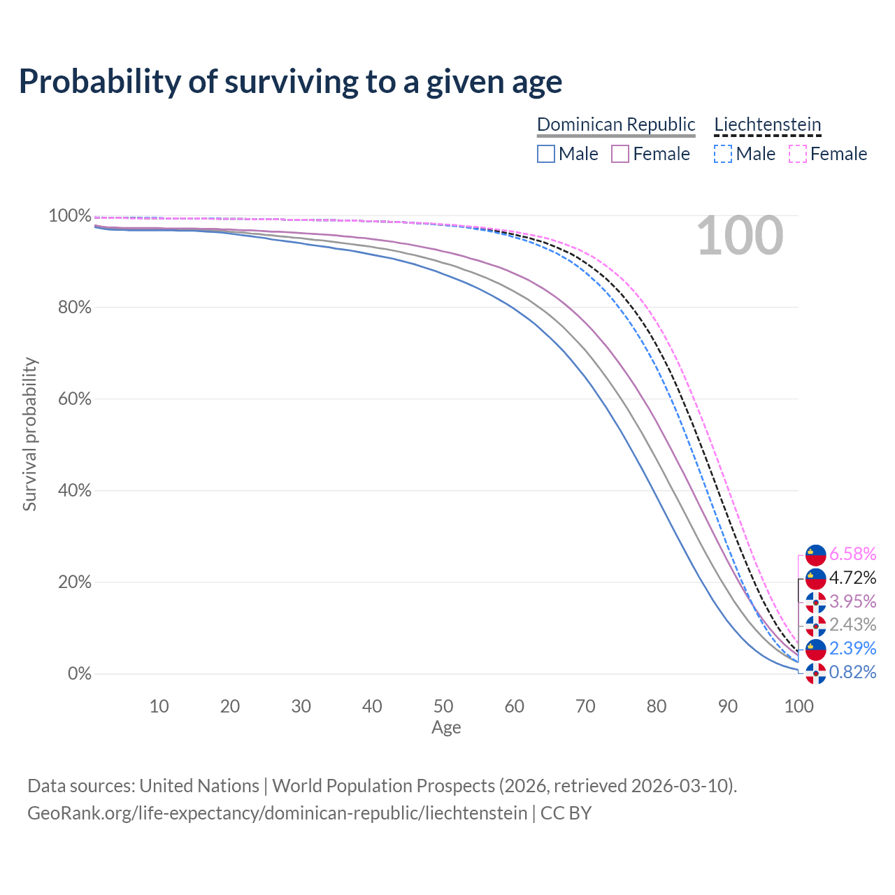This life expectancy calculator shows the odds of living to 100, 95, 90, and below based on current age for both males and females in the Dominican Republic and Liechtenstein, along with mean and median age of death. The calculations are based on the 2026 life tables (actuarial tables) from the UN World Population Prospects.