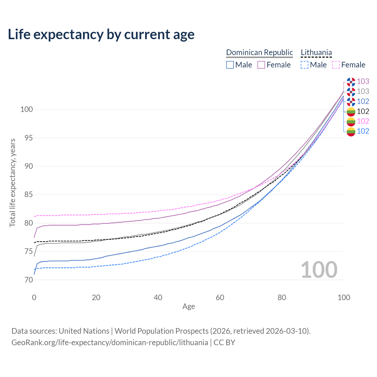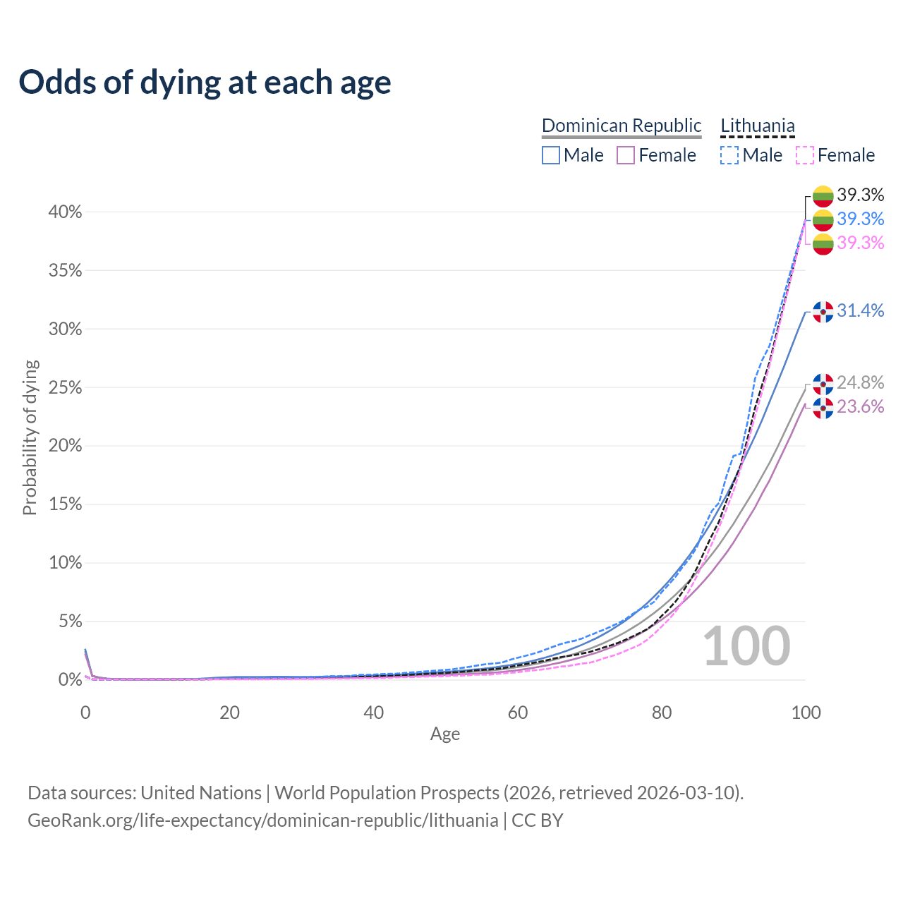 This life expectancy calculator shows the odds of living to 100, 95, 90, and below based on current age for both males and females in the Dominican Republic and Lithuania, along with mean and median age of death. The calculations are based on the 2026 life tables (actuarial tables) from the UN World Population Prospects.