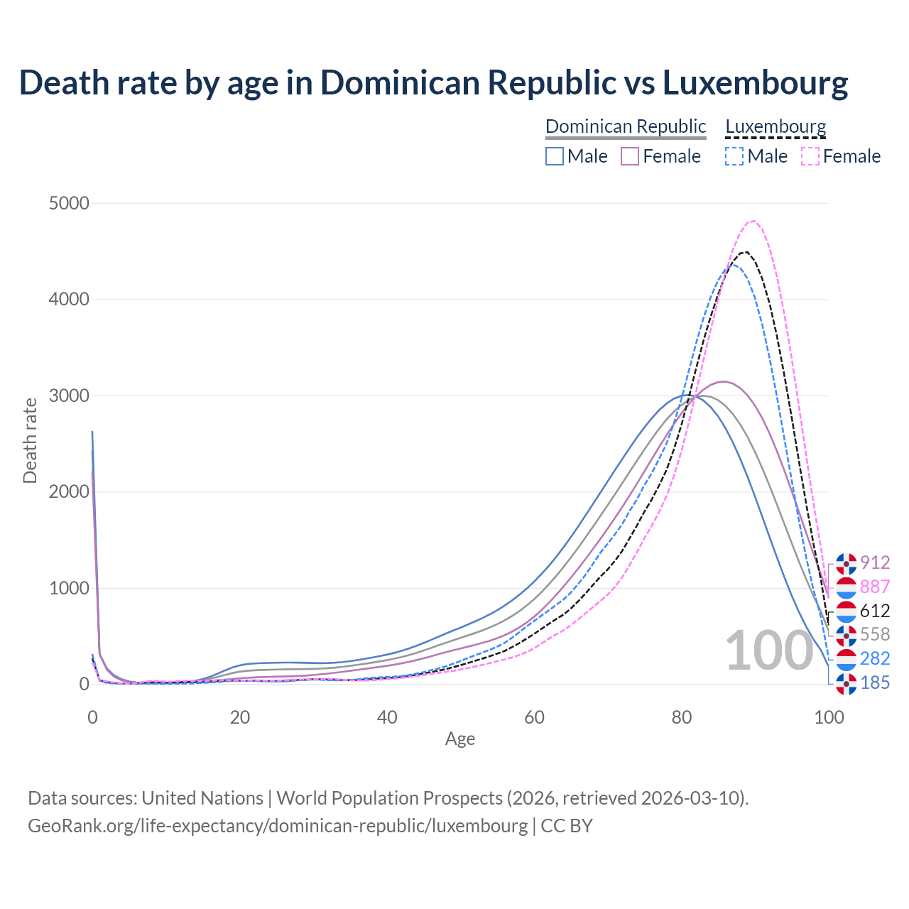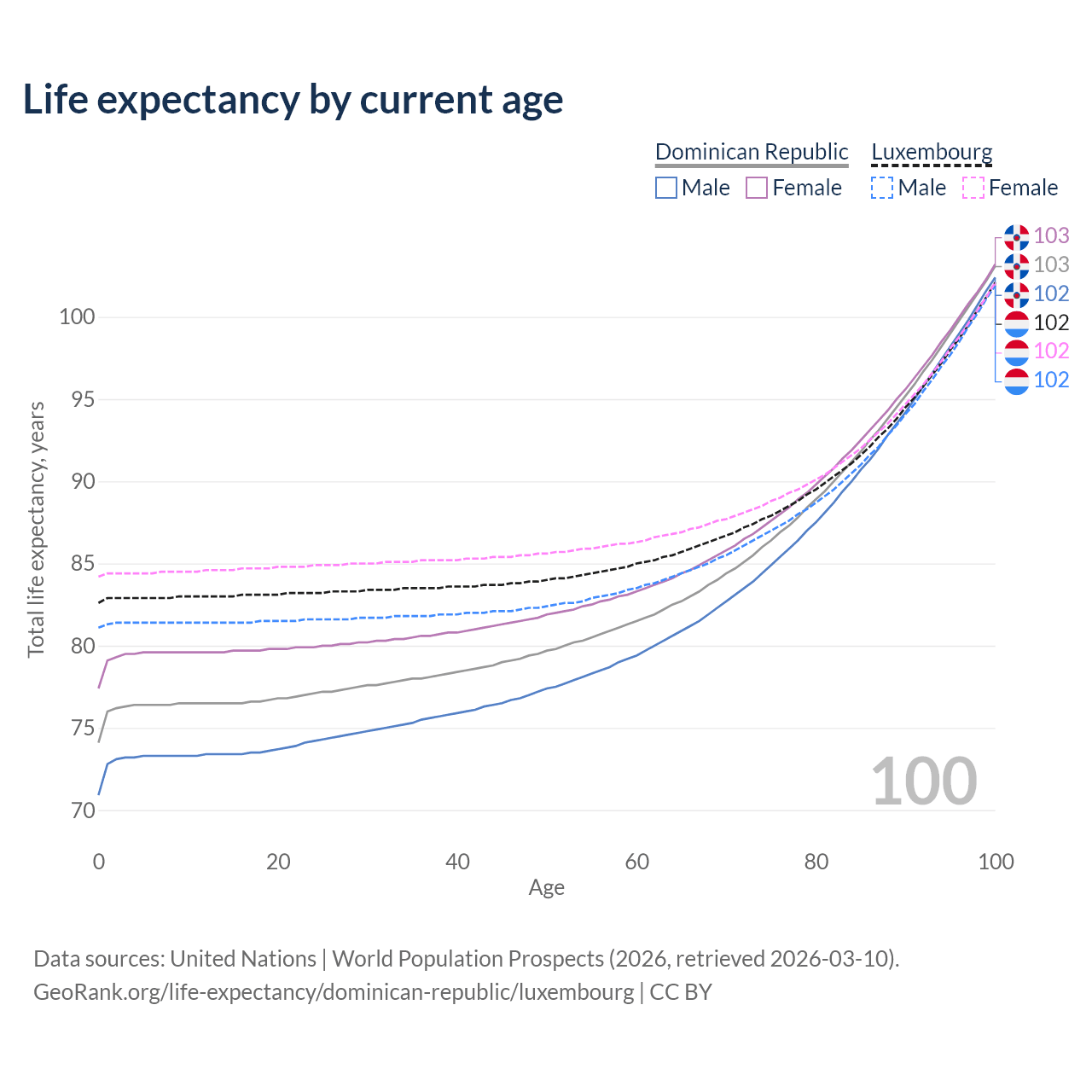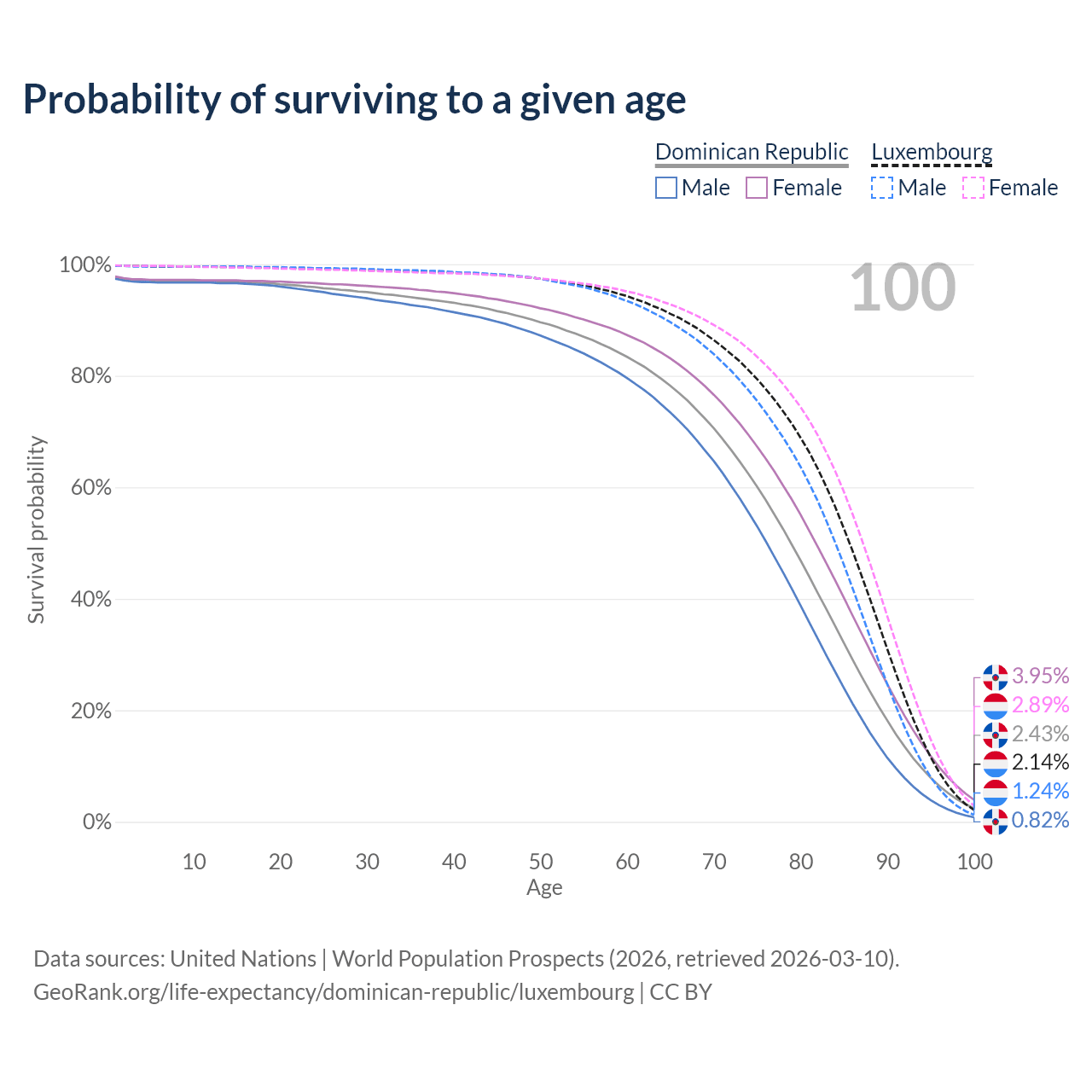 This life expectancy calculator shows the odds of living to 100, 95, 90, and below based on current age for both males and females in the Dominican Republic and Luxembourg, along with mean and median age of death. The calculations are based on the 2026 life tables (actuarial tables) from the UN World Population Prospects.