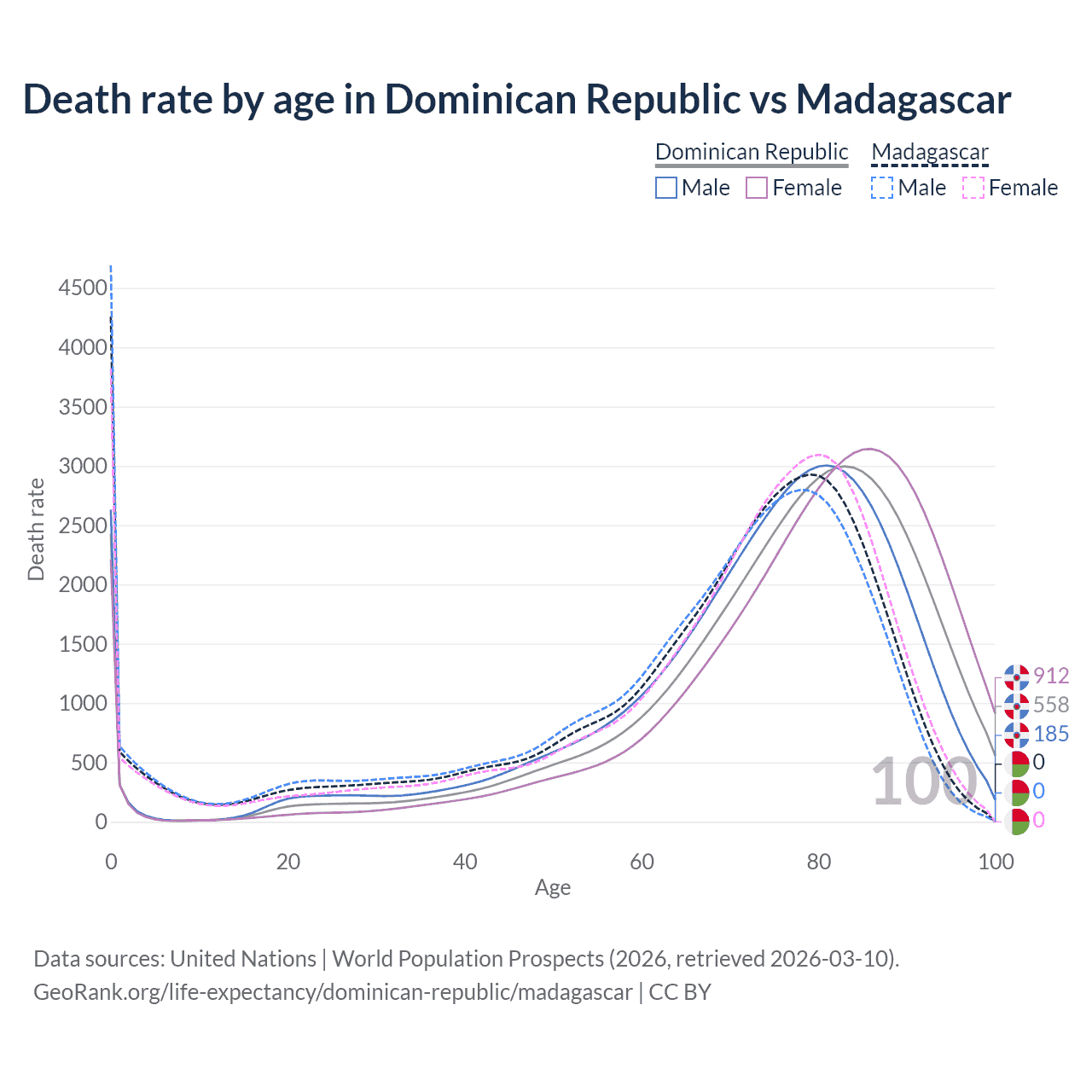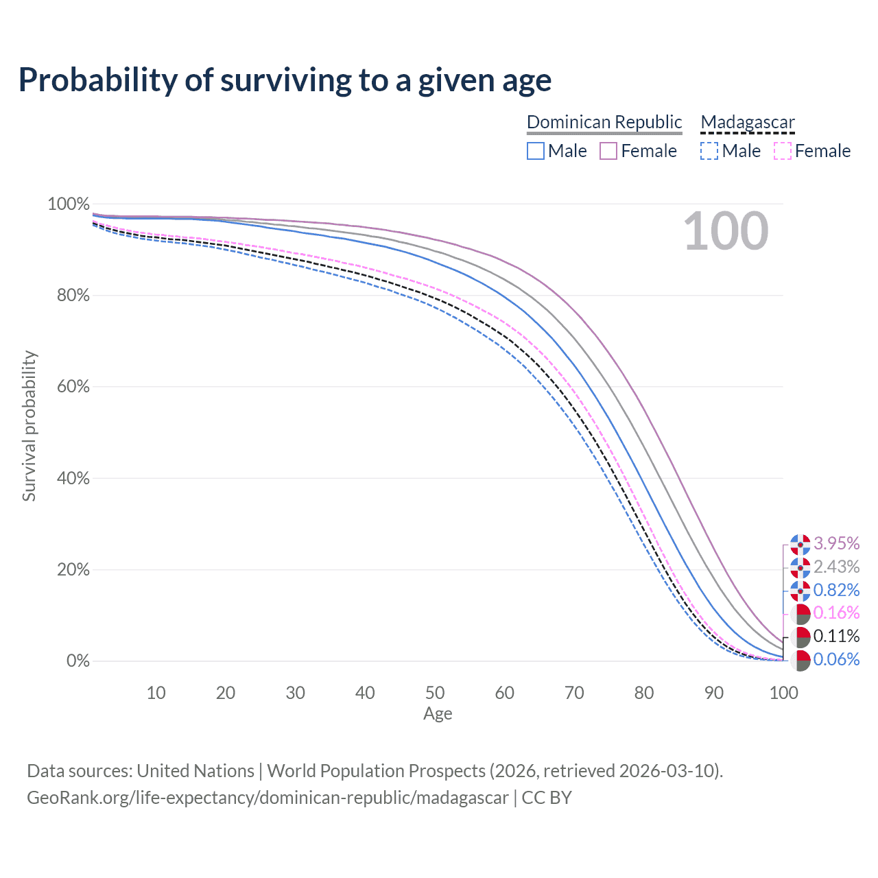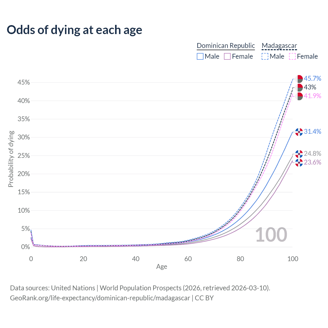 This life expectancy calculator shows the odds of living to 100, 95, 90, and below based on current age for both males and females in the Dominican Republic and Madagascar, along with mean and median age of death. The calculations are based on the 2026 life tables (actuarial tables) from the UN World Population Prospects.