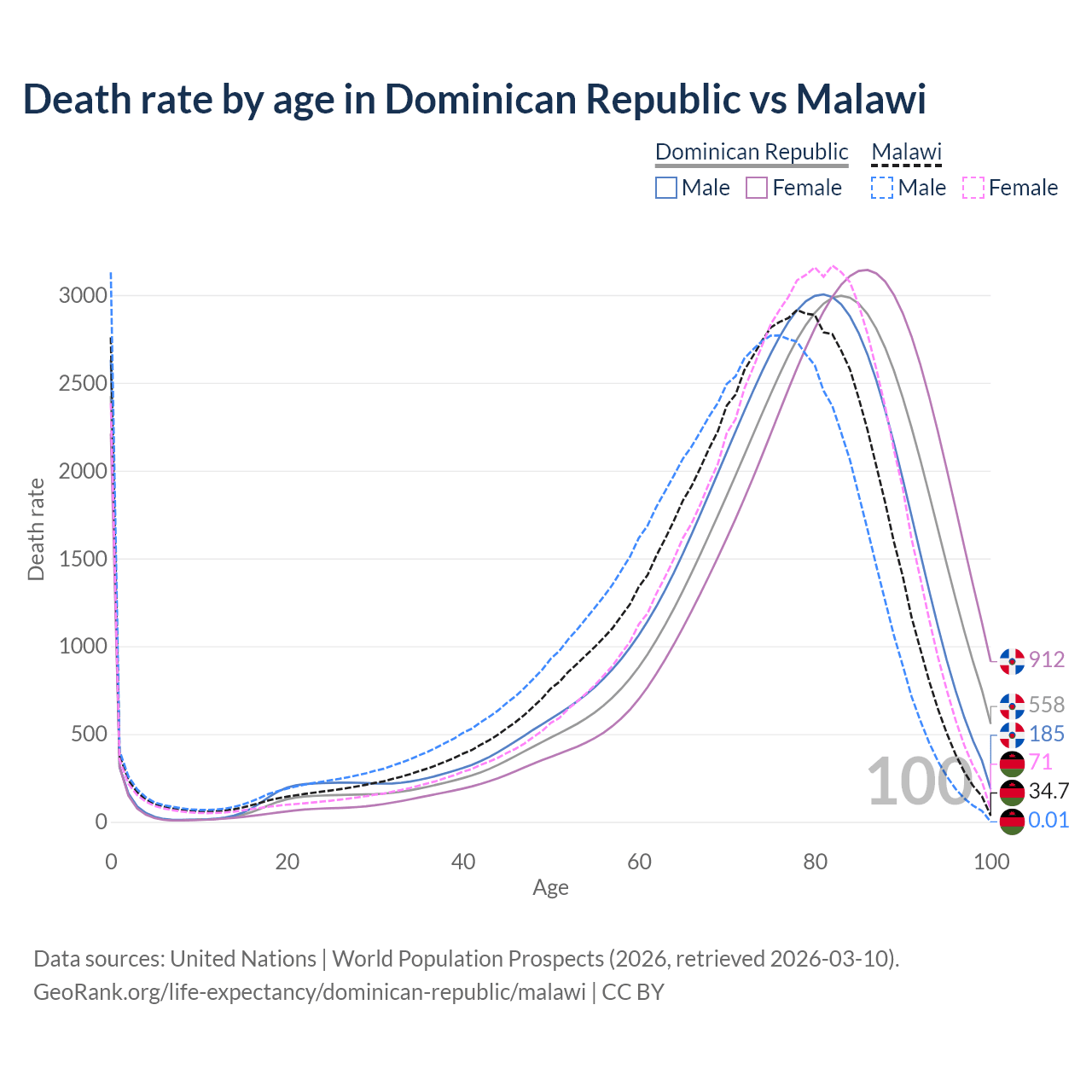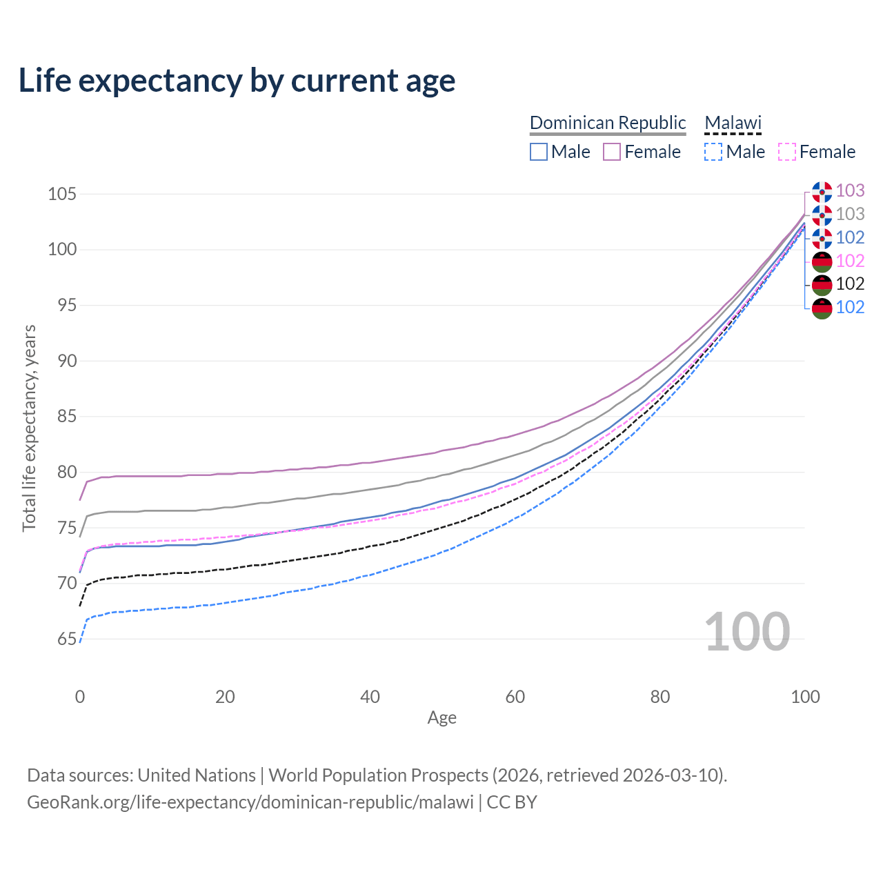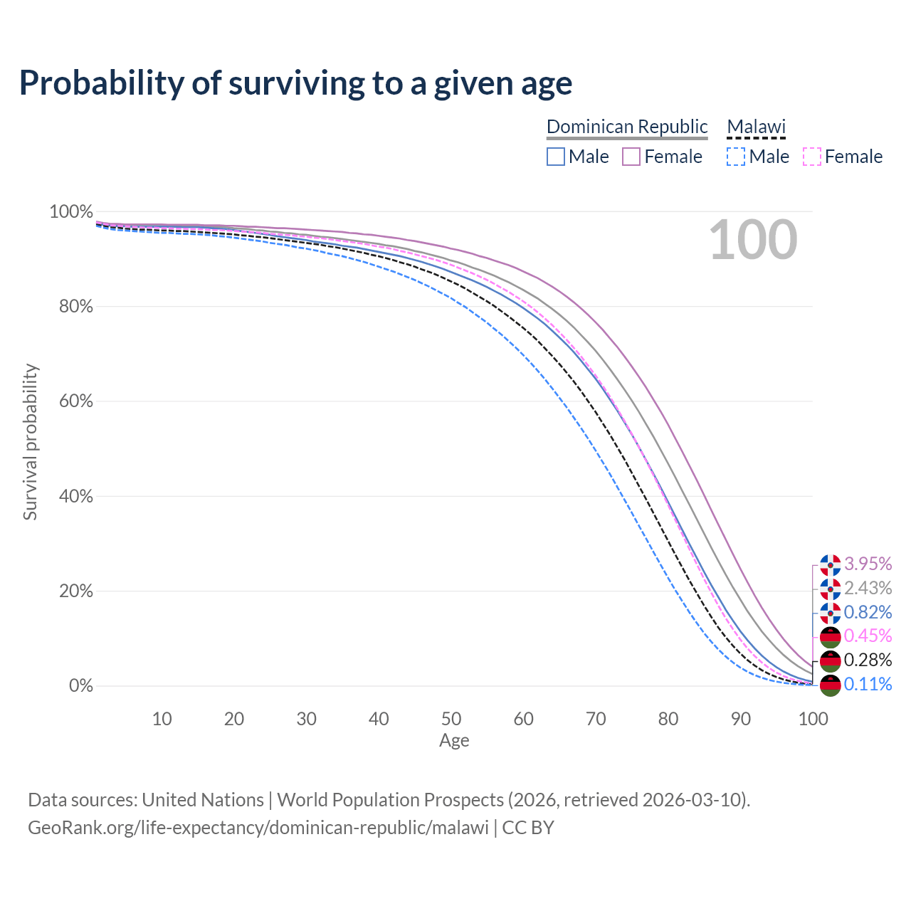 This life expectancy calculator shows the odds of living to 100, 95, 90, and below based on current age for both males and females in the Dominican Republic and Malawi, along with mean and median age of death. The calculations are based on the 2026 life tables (actuarial tables) from the UN World Population Prospects.