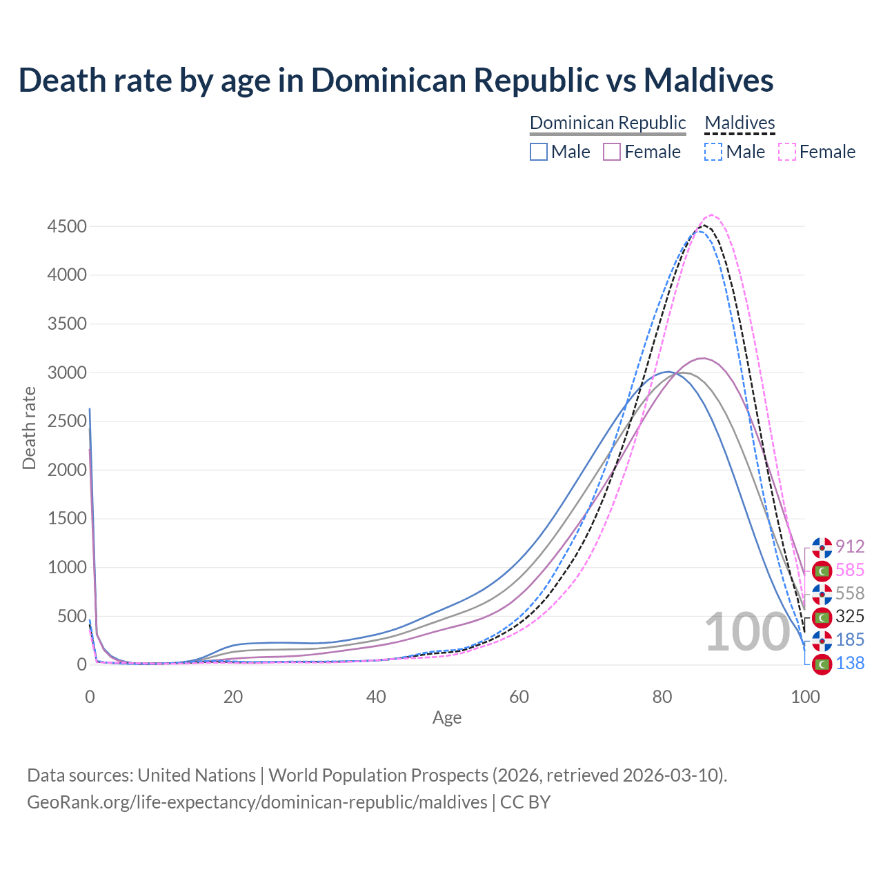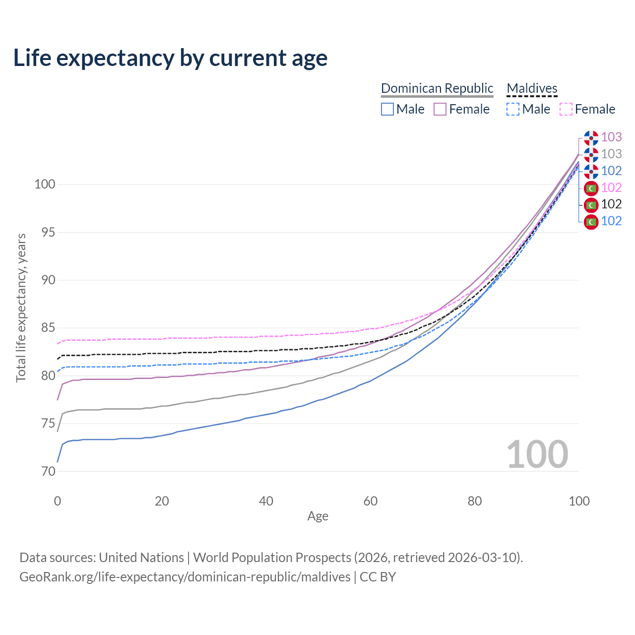 This life expectancy calculator shows the odds of living to 100, 95, 90, and below based on current age for both males and females in the Dominican Republic and Maldives, along with mean and median age of death. The calculations are based on the 2026 life tables (actuarial tables) from the UN World Population Prospects.