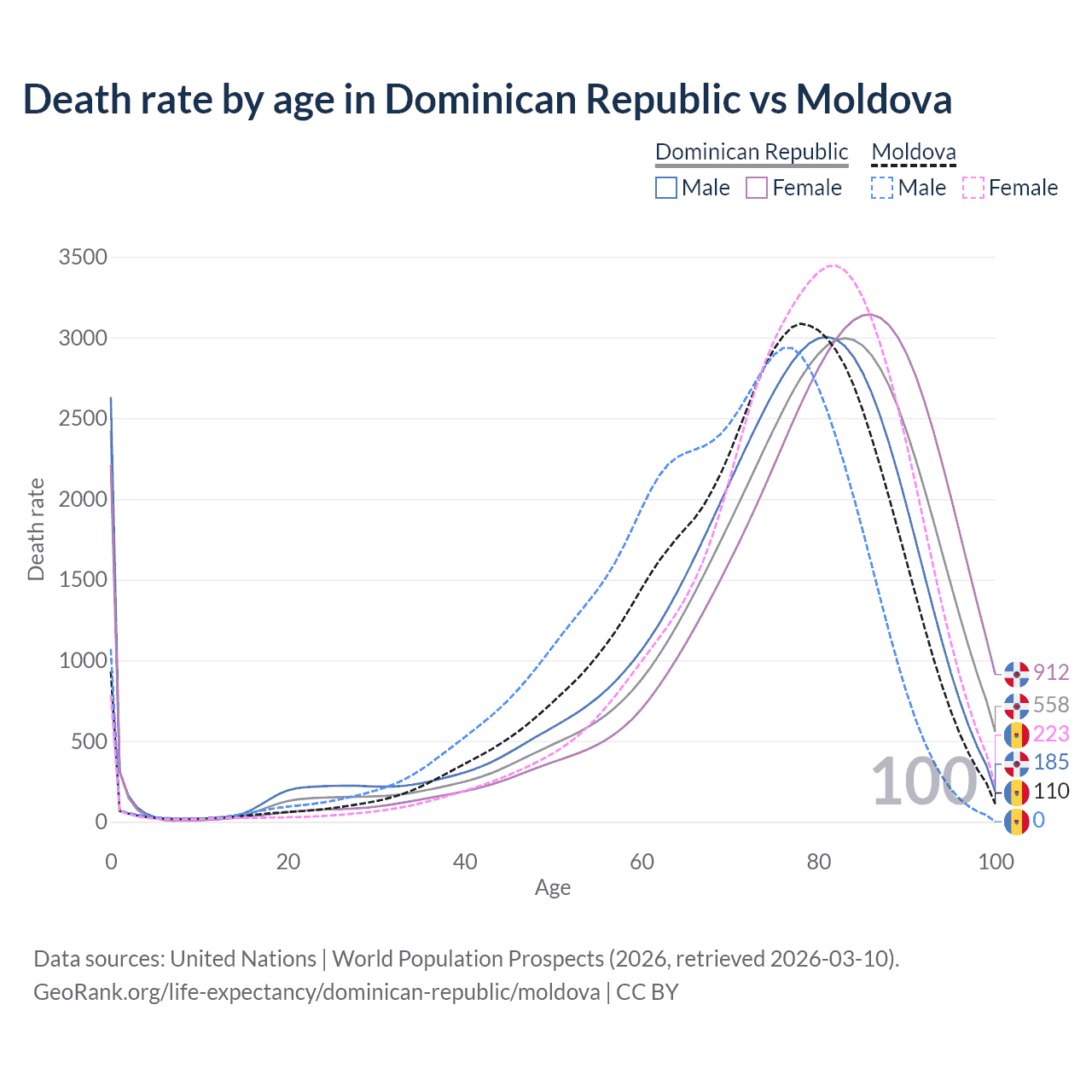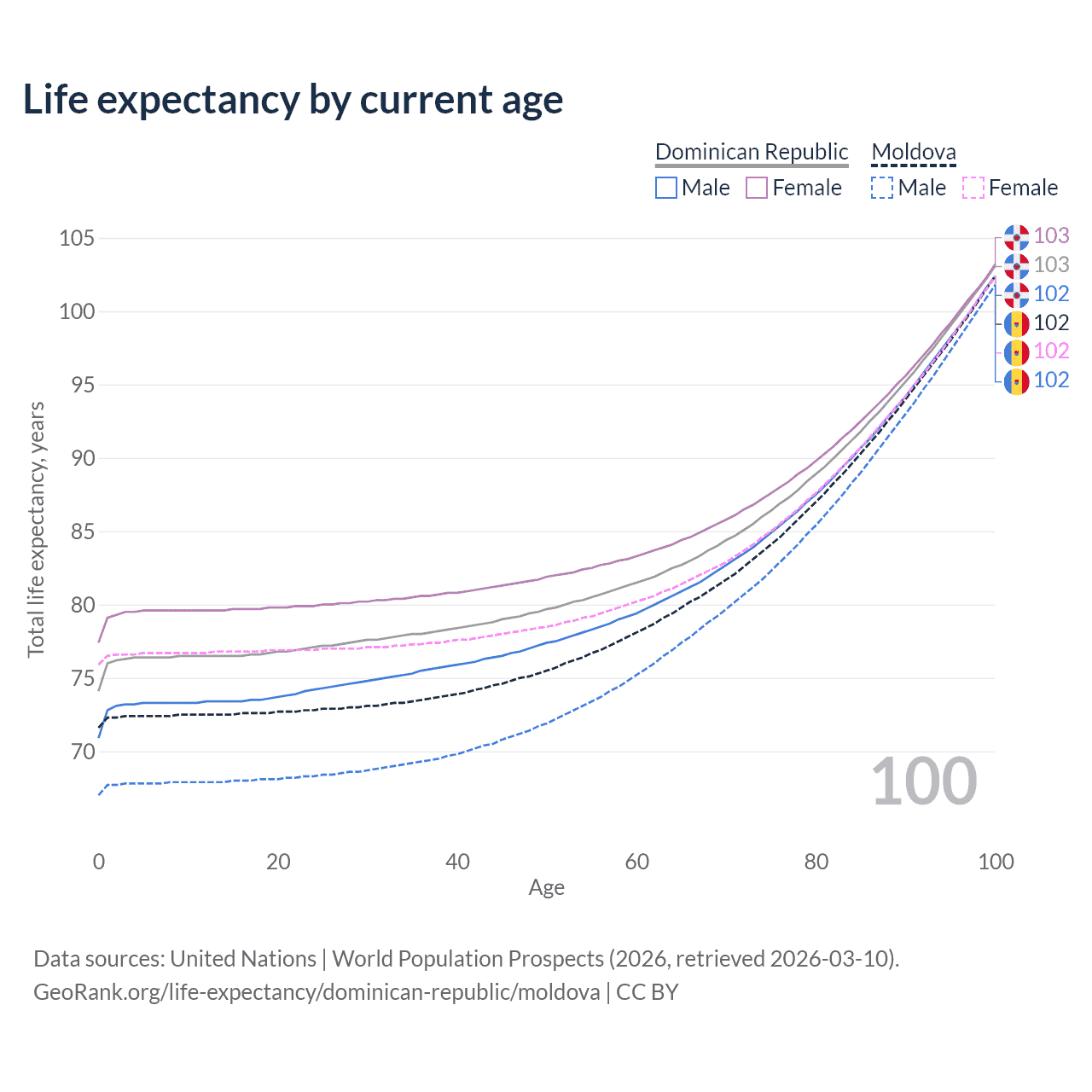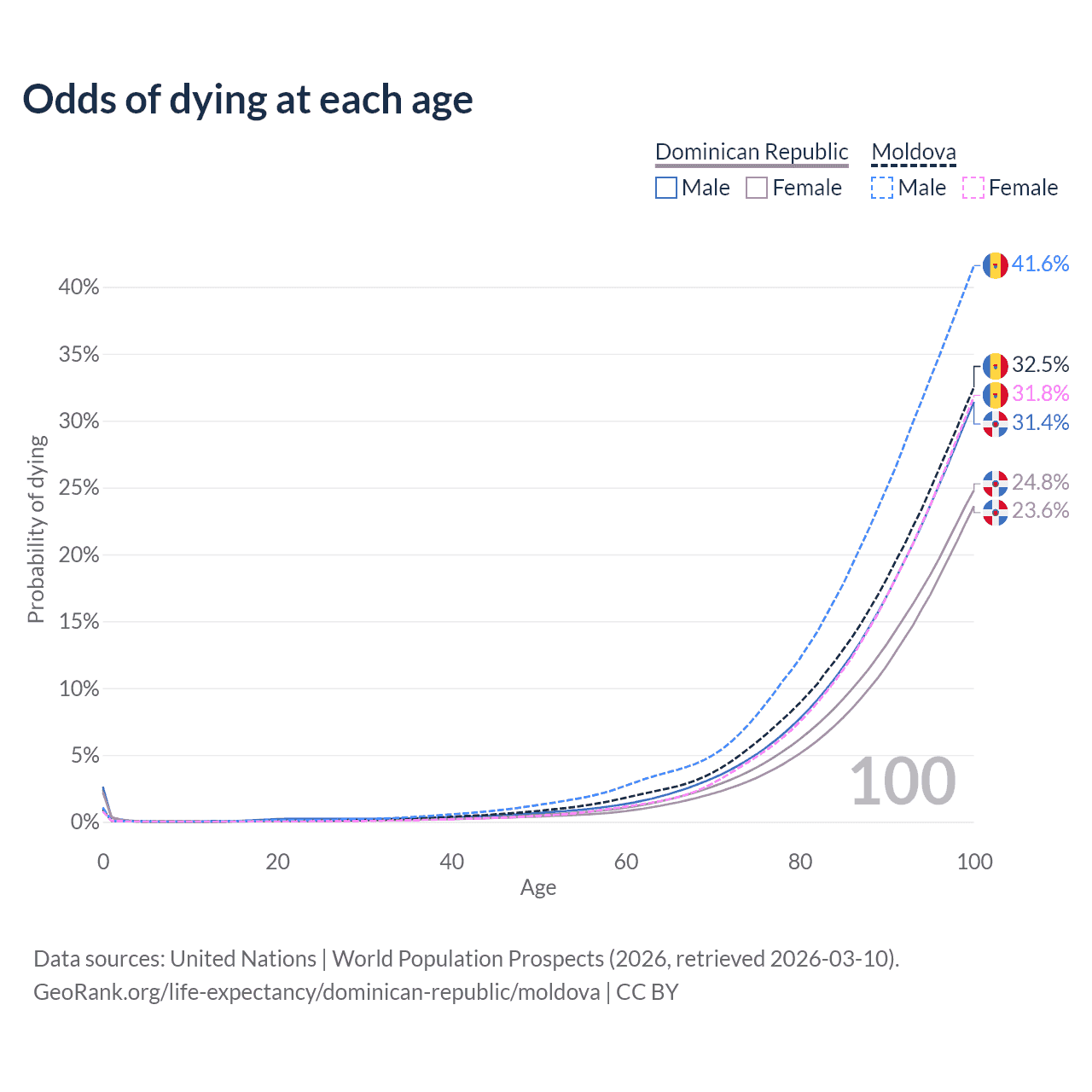 This life expectancy calculator shows the odds of living to 100, 95, 90, and below based on current age for both males and females in the Dominican Republic and Moldova, along with mean and median age of death. The calculations are based on the 2026 life tables (actuarial tables) from the UN World Population Prospects.