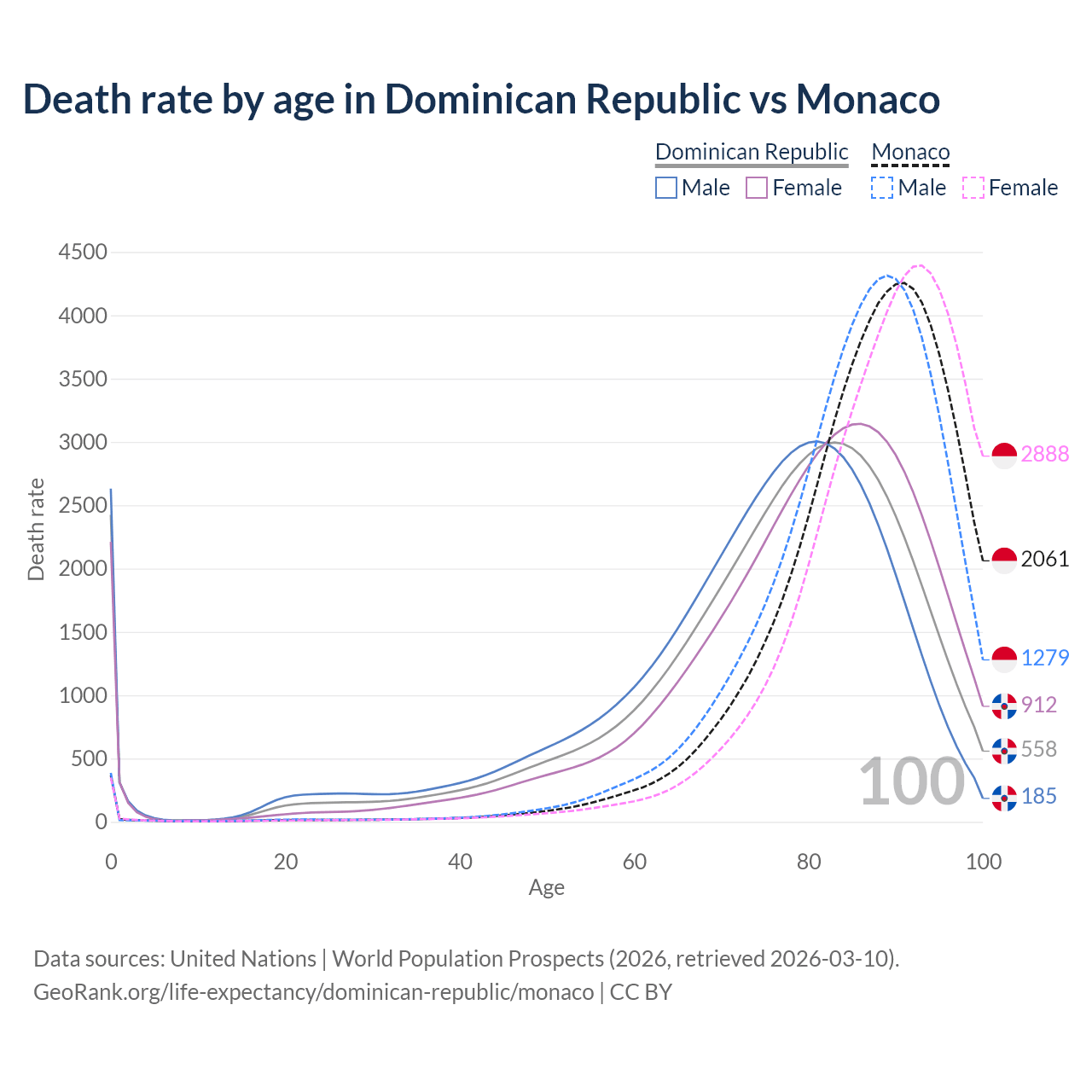 This life expectancy calculator shows the odds of living to 100, 95, 90, and below based on current age for both males and females in the Dominican Republic and Monaco, along with mean and median age of death. The calculations are based on the 2026 life tables (actuarial tables) from the UN World Population Prospects.