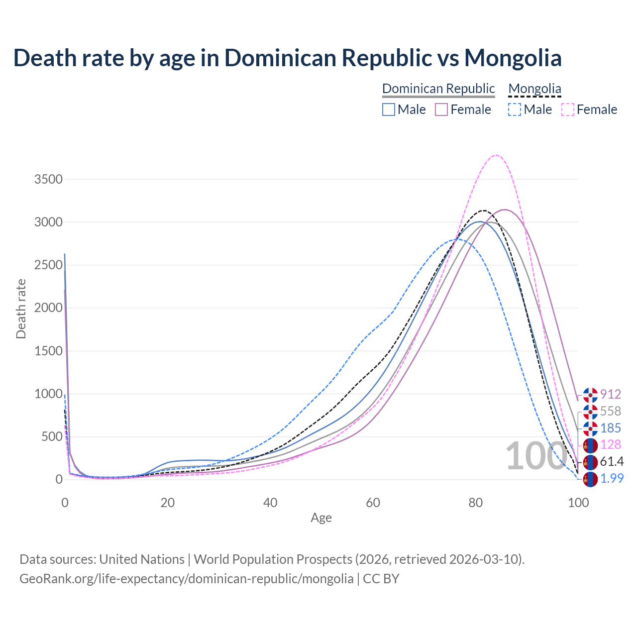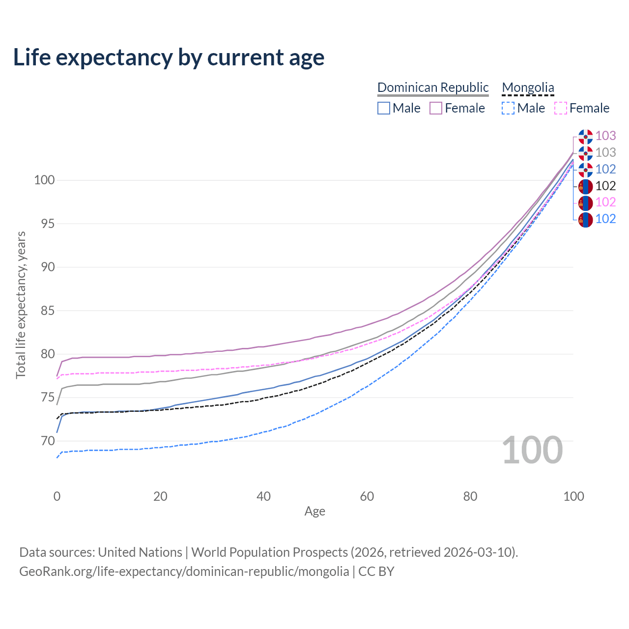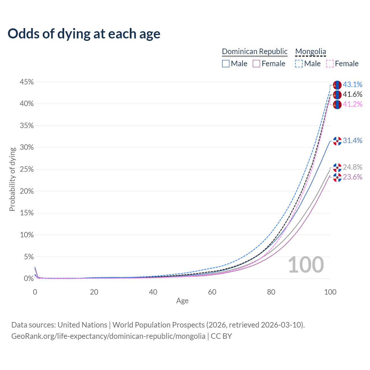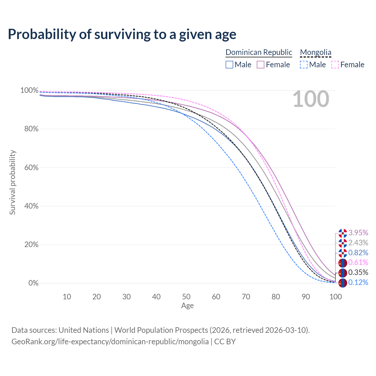 This life expectancy calculator shows the odds of living to 100, 95, 90, and below based on current age for both males and females in the Dominican Republic and Mongolia, along with mean and median age of death. The calculations are based on the 2026 life tables (actuarial tables) from the UN World Population Prospects.