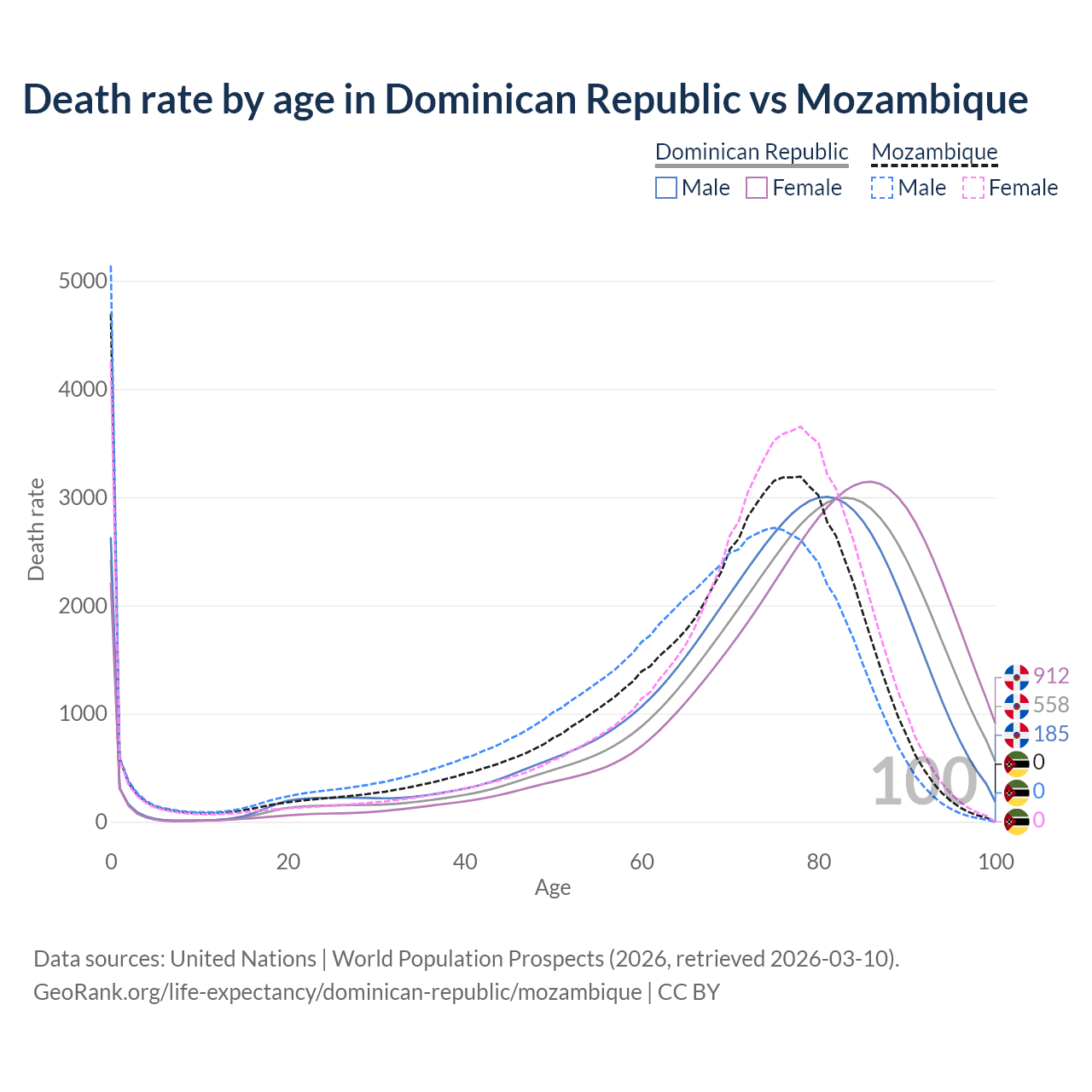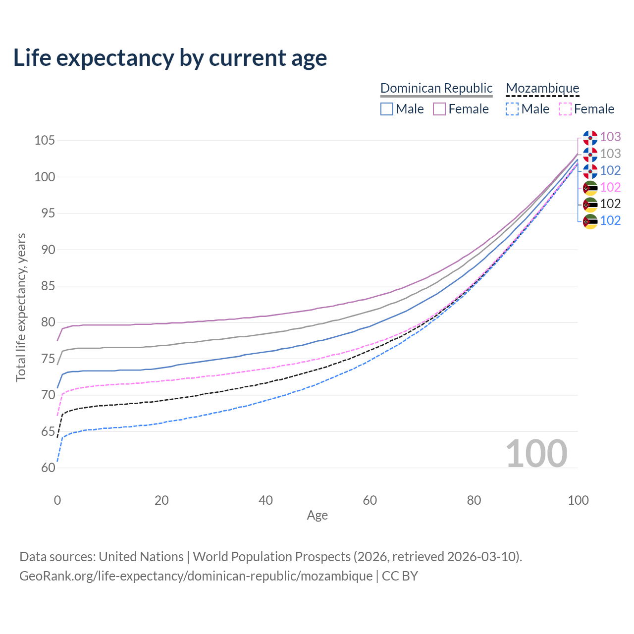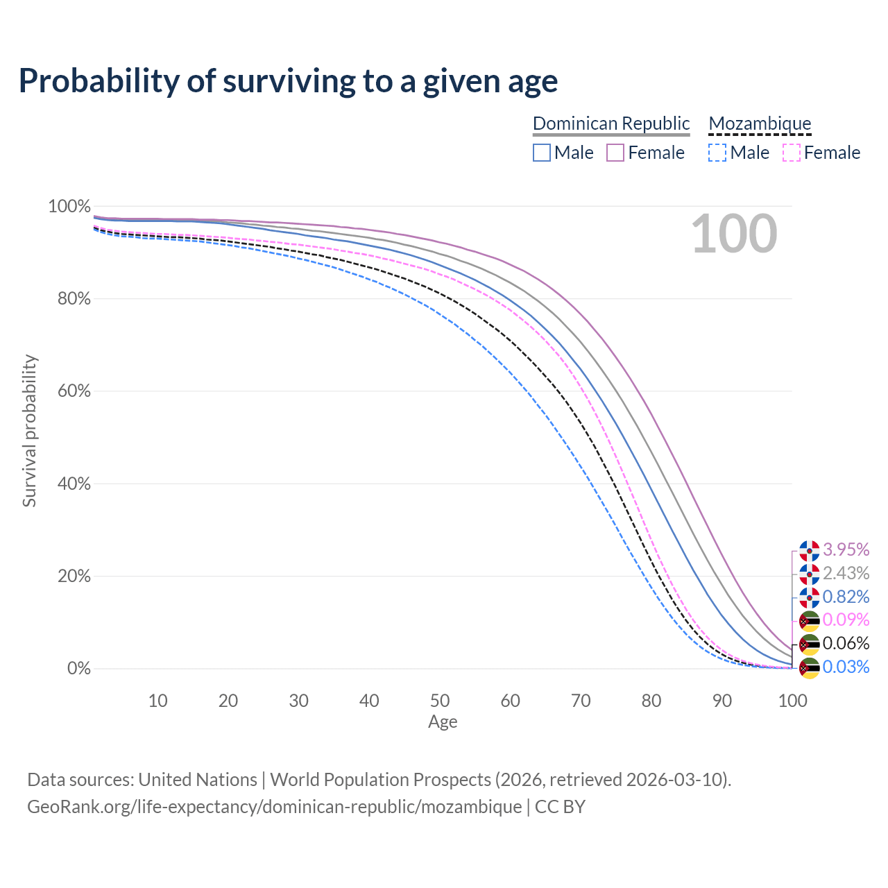This life expectancy calculator shows the odds of living to 100, 95, 90, and below based on current age for both males and females in the Dominican Republic and Mozambique, along with mean and median age of death. The calculations are based on the 2026 life tables (actuarial tables) from the UN World Population Prospects.