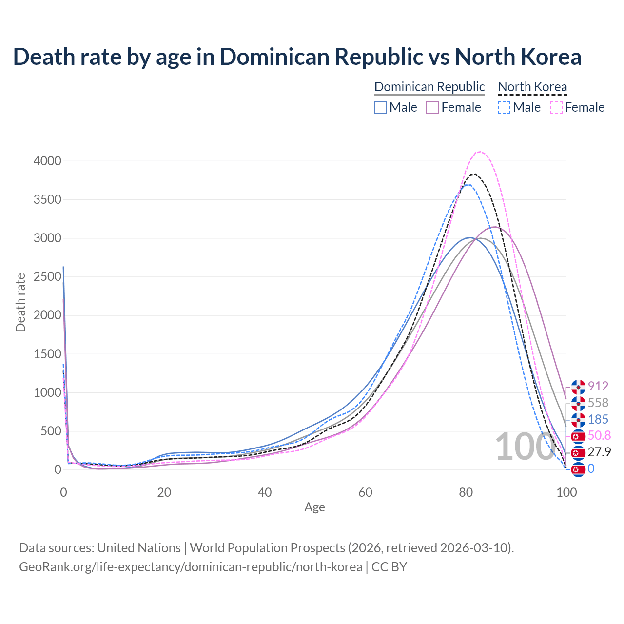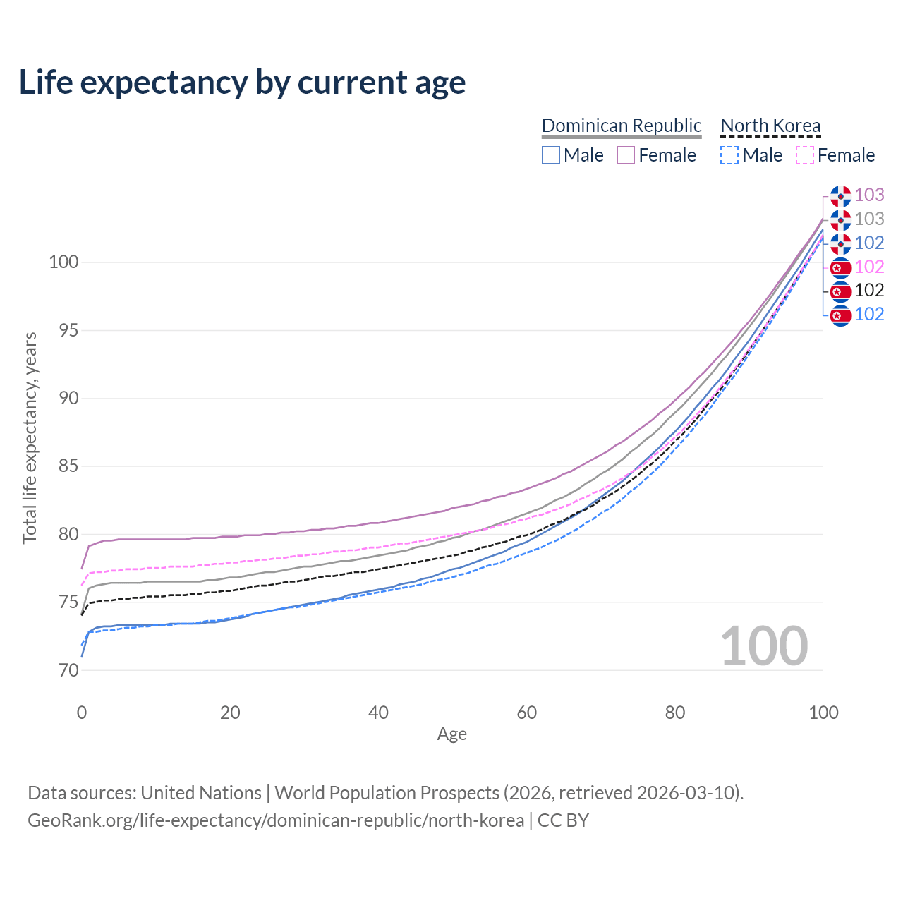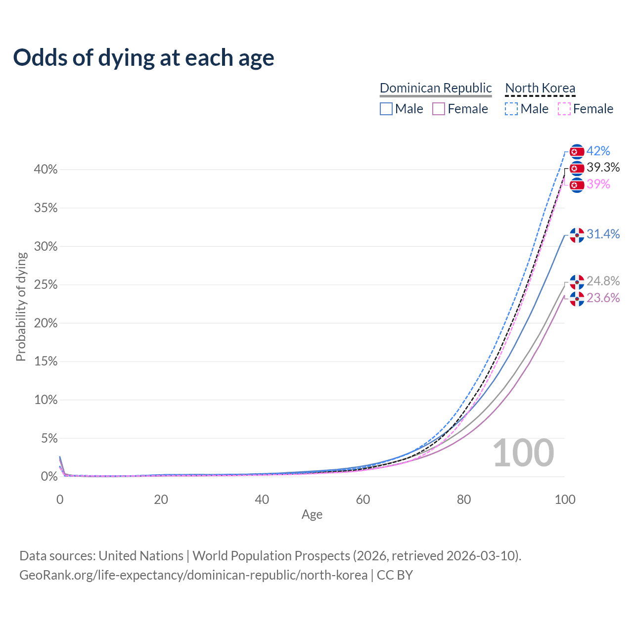 This life expectancy calculator shows the odds of living to 100, 95, 90, and below based on current age for both males and females in the Dominican Republic and North Korea, along with mean and median age of death. The calculations are based on the 2026 life tables (actuarial tables) from the UN World Population Prospects.