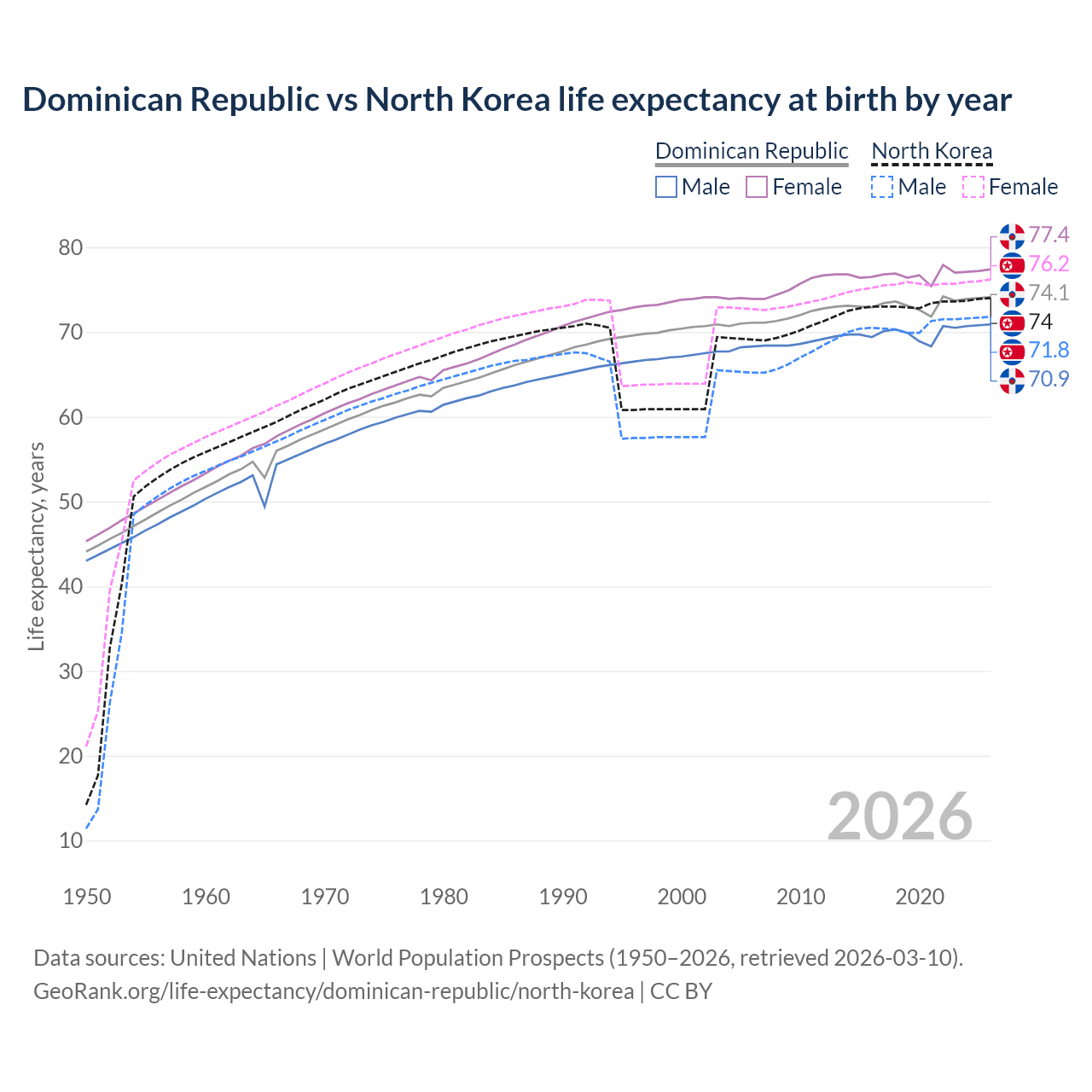 The average life expectancy at birth is 74.1 years in the Dominican Republic vs 74 in North Korea. The Dominican Republic is ranked 101/197 by life expectancy, and North Korea is 104/197. In the Dominican Republic, the life expectancy is 70.9 years for males and 77.4 years for females. In North Korea, it's 71.8 years for males and 76.2 years for females.