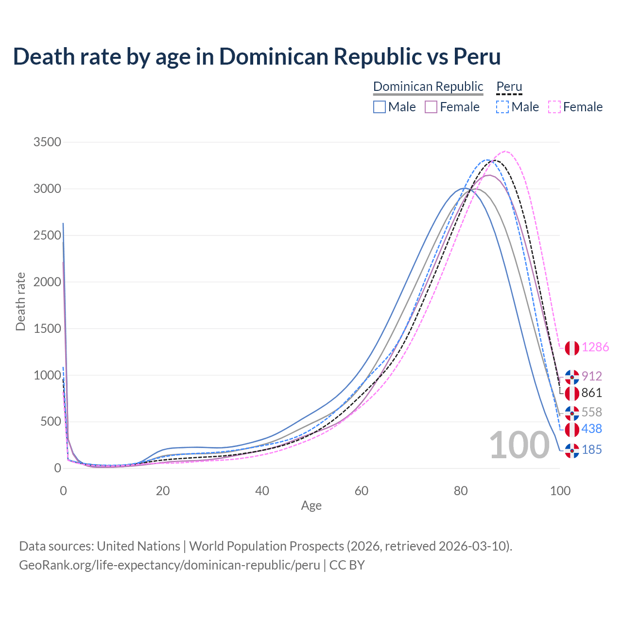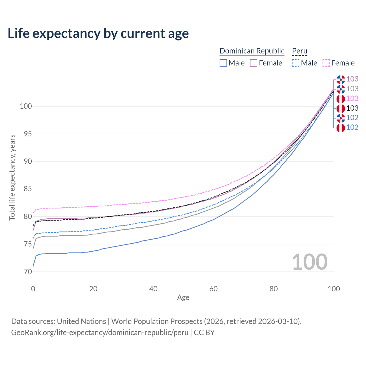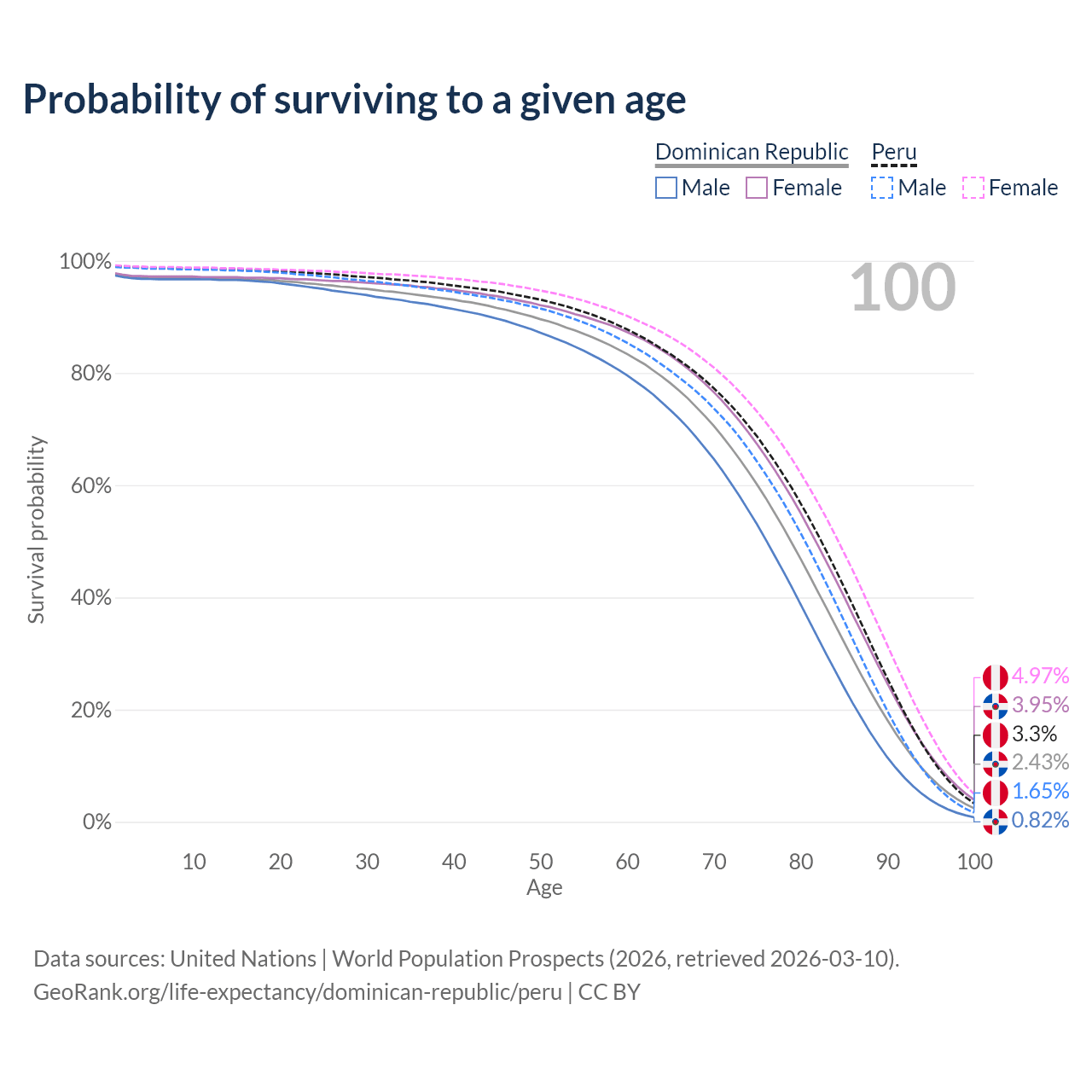 This life expectancy calculator shows the odds of living to 100, 95, 90, and below based on current age for both males and females in the Dominican Republic and Peru, along with mean and median age of death. The calculations are based on the 2026 life tables (actuarial tables) from the UN World Population Prospects.