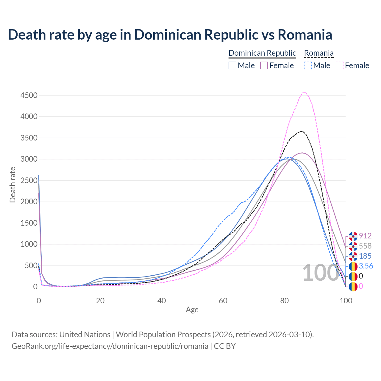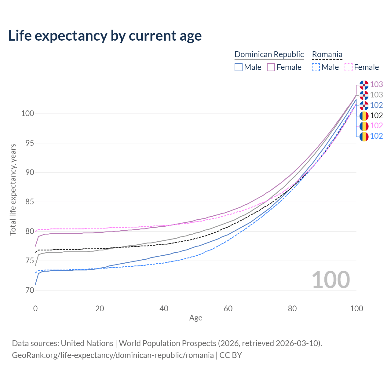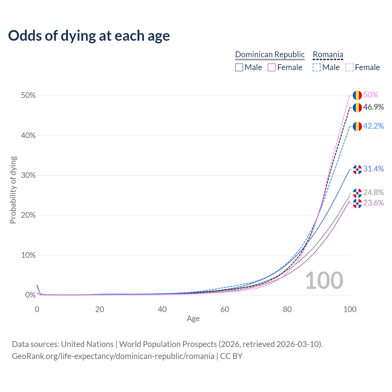 This life expectancy calculator shows the odds of living to 100, 95, 90, and below based on current age for both males and females in the Dominican Republic and Romania, along with mean and median age of death. The calculations are based on the 2026 life tables (actuarial tables) from the UN World Population Prospects.