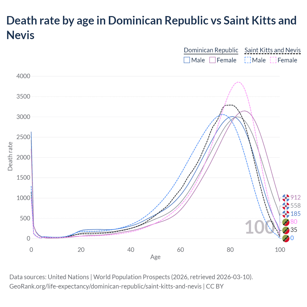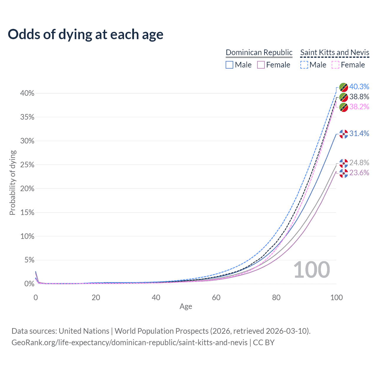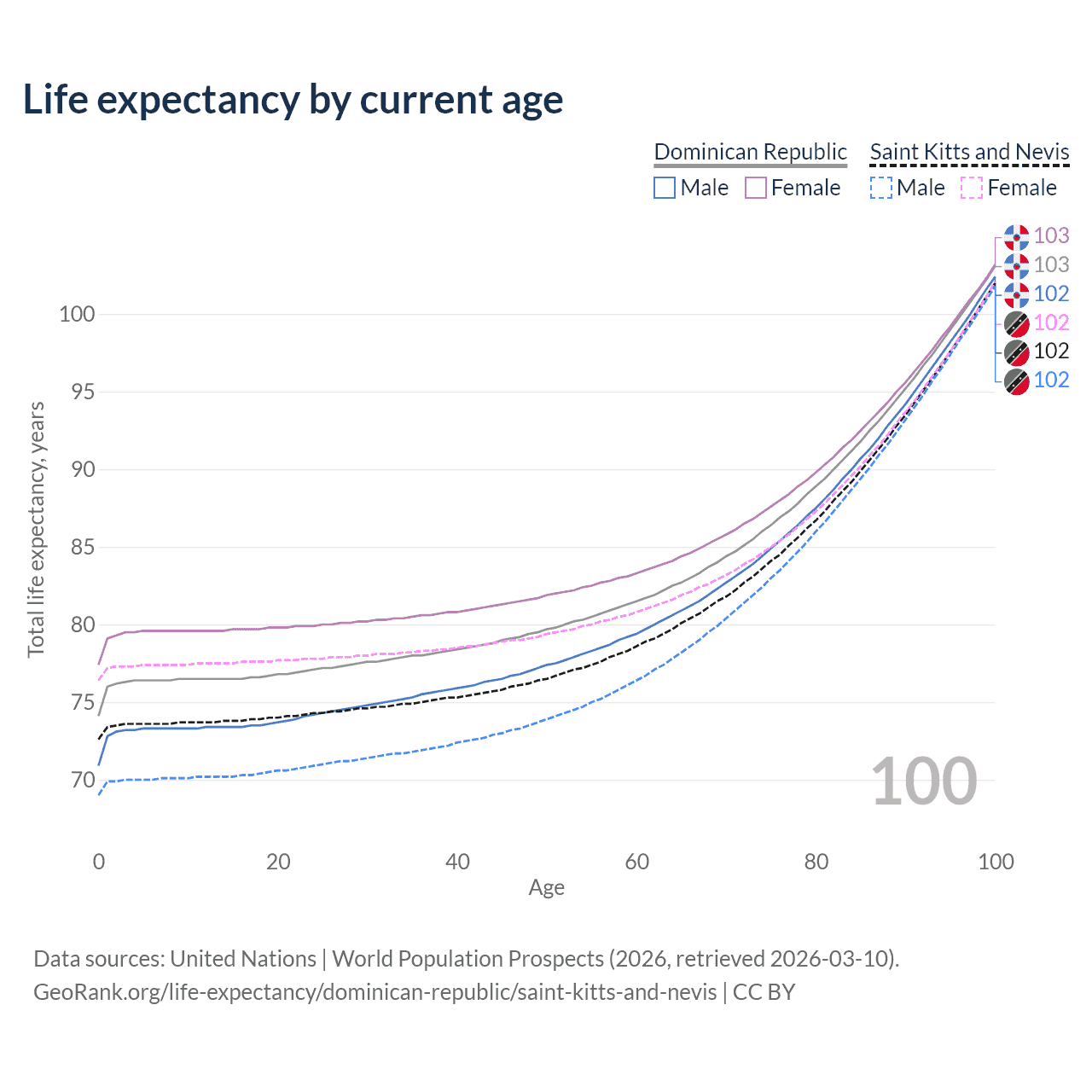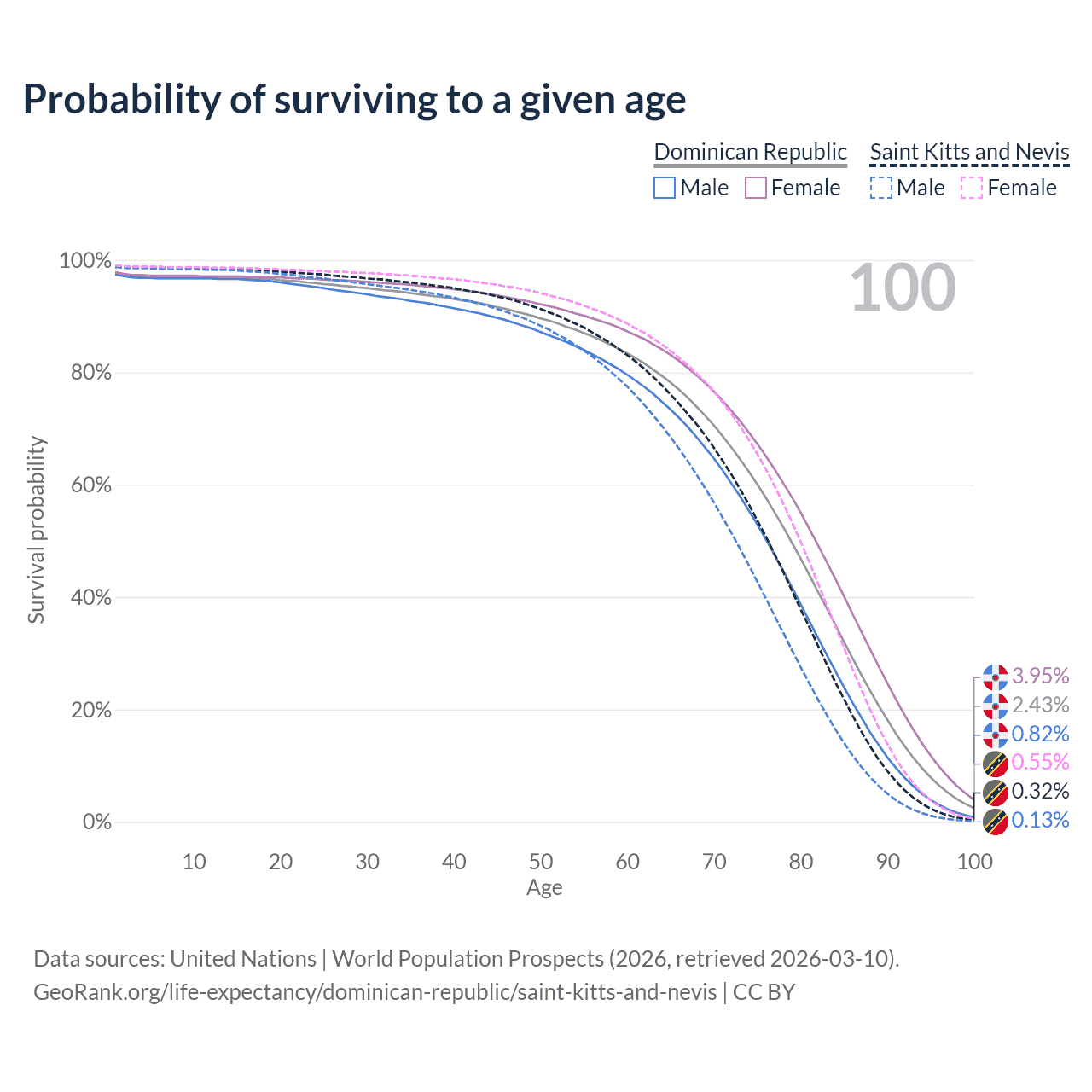 This life expectancy calculator shows the odds of living to 100, 95, 90, and below based on current age for both males and females in the Dominican Republic and Saint Kitts and Nevis, along with mean and median age of death. The calculations are based on the 2026 life tables (actuarial tables) from the UN World Population Prospects.