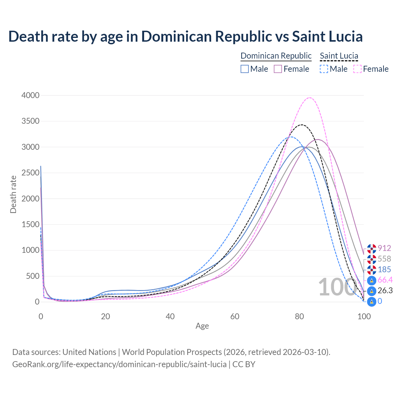 In the Dominican Republic, the most common age of death is 83, compared to 81 in Saint Lucia. The median age of death is 78.9 in the Dominican Republic and 76.8 in Saint Lucia, meaning only half of each cohort is expected to live past that age.