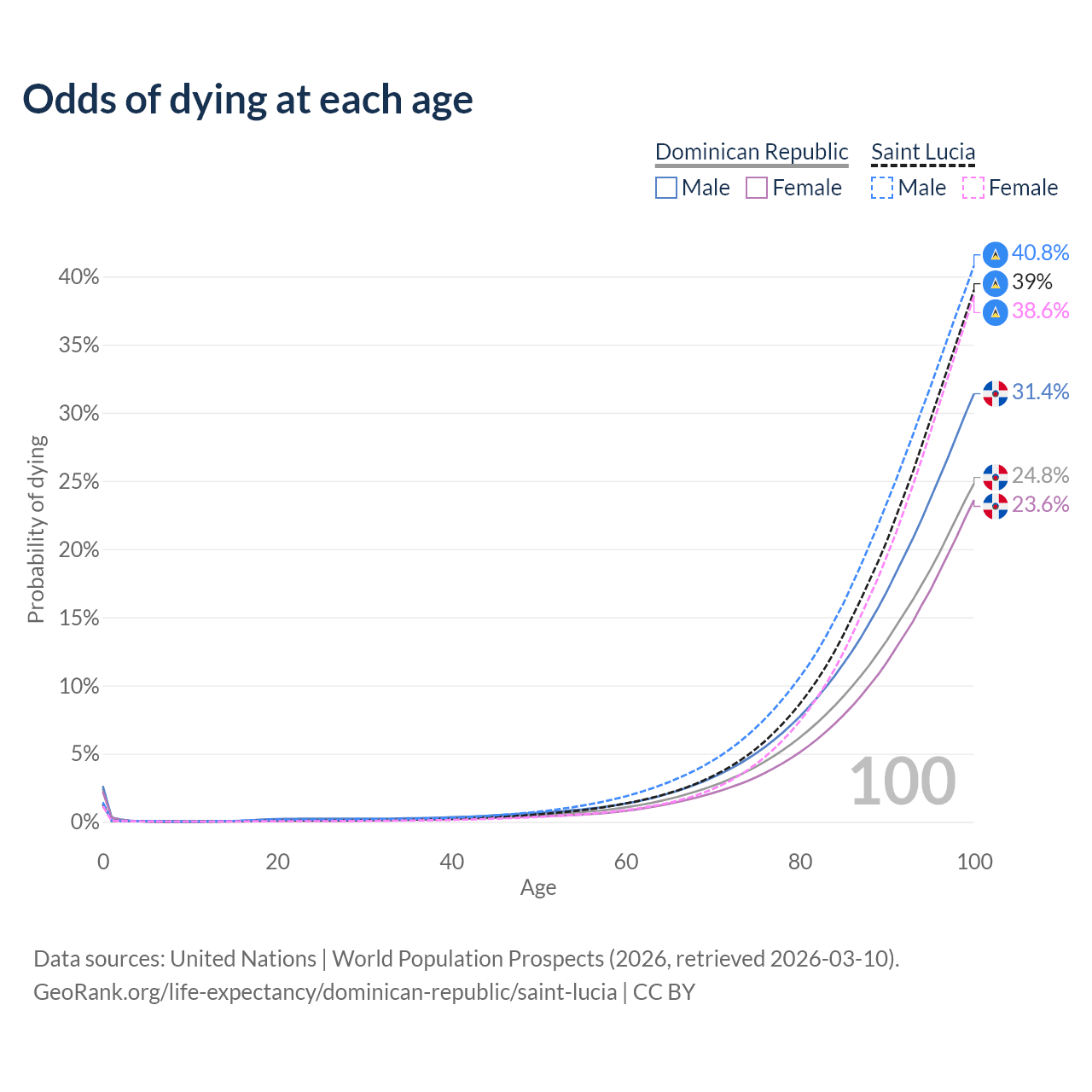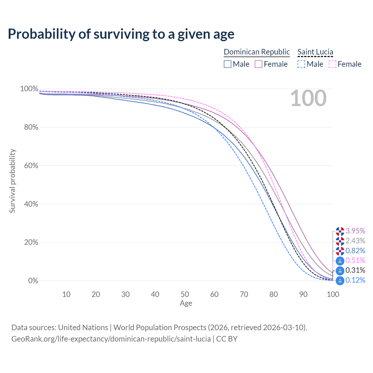 This life expectancy calculator shows the odds of living to 100, 95, 90, and below based on current age for both males and females in the Dominican Republic and Saint Lucia, along with mean and median age of death. The calculations are based on the 2026 life tables (actuarial tables) from the UN World Population Prospects.
