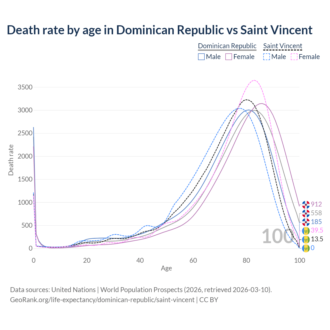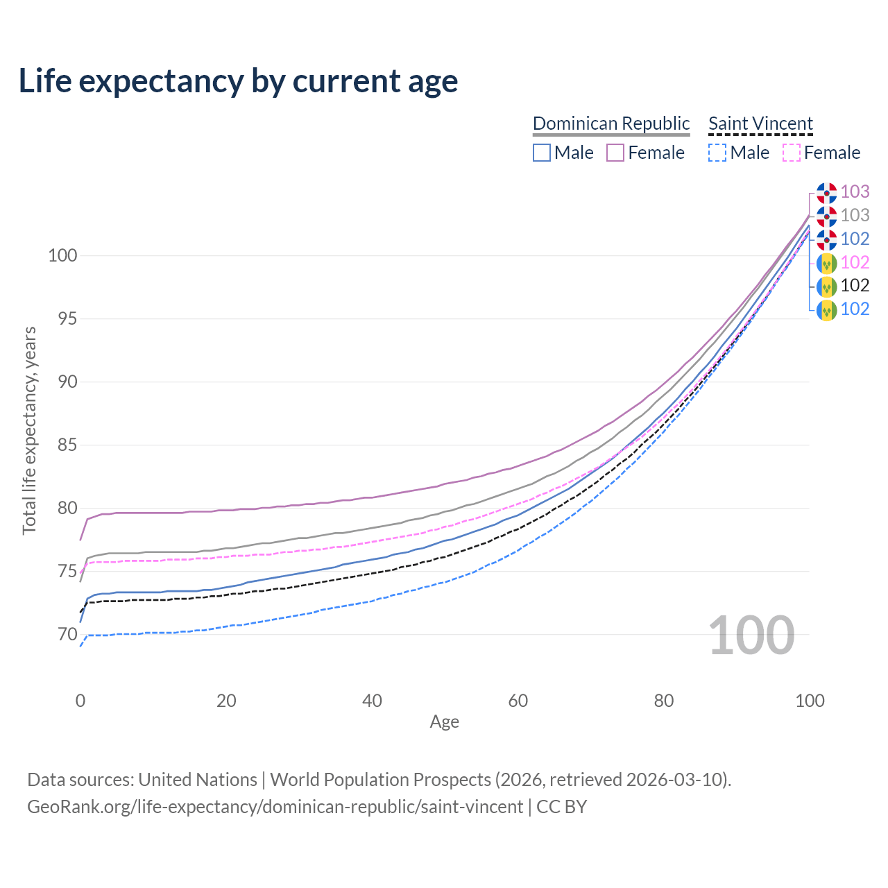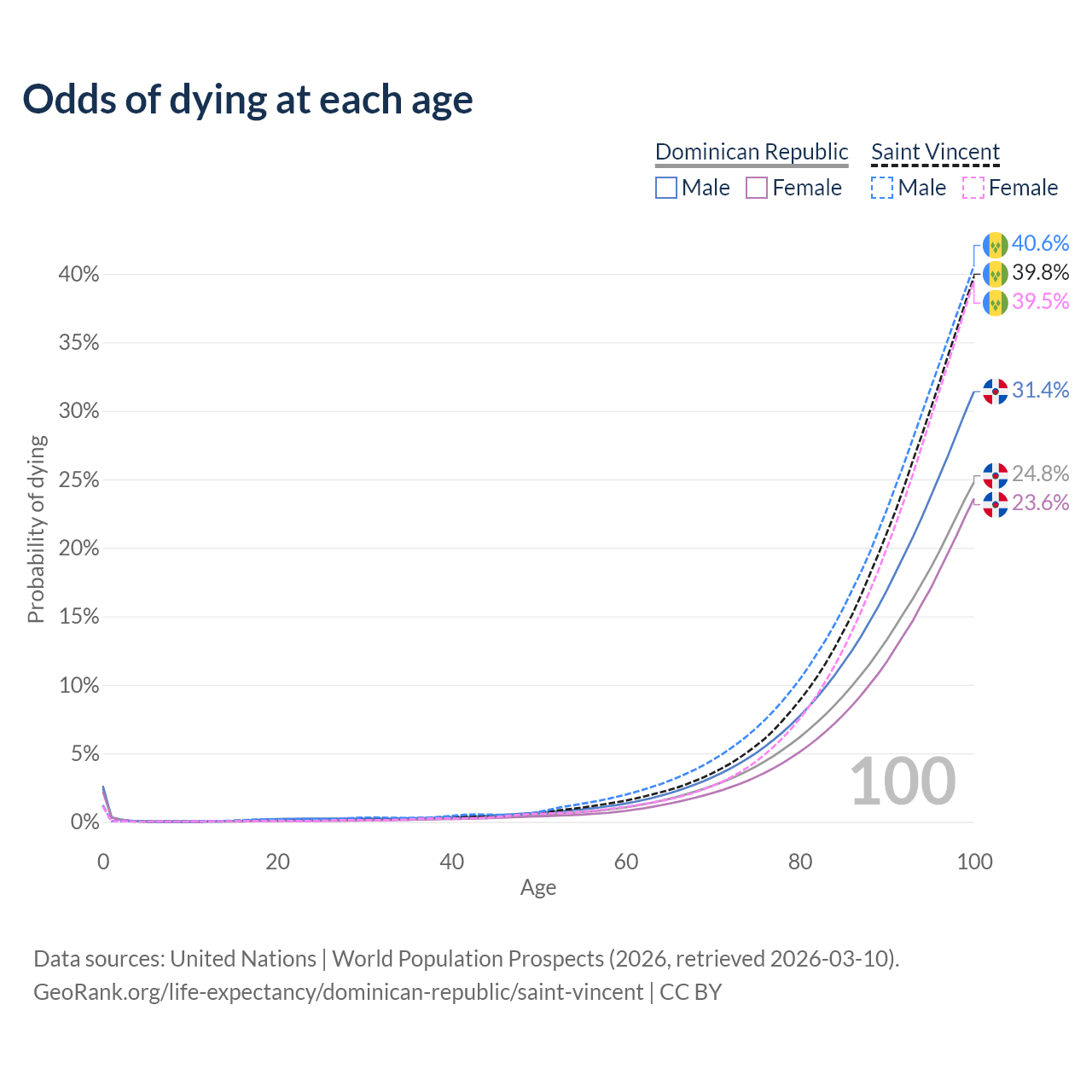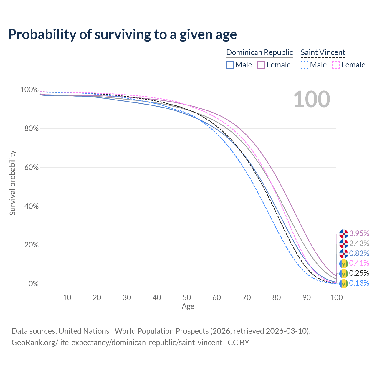 This life expectancy calculator shows the odds of living to 100, 95, 90, and below based on current age for both males and females in the Dominican Republic and Saint Vincent, along with mean and median age of death. The calculations are based on the 2026 life tables (actuarial tables) from the UN World Population Prospects.
