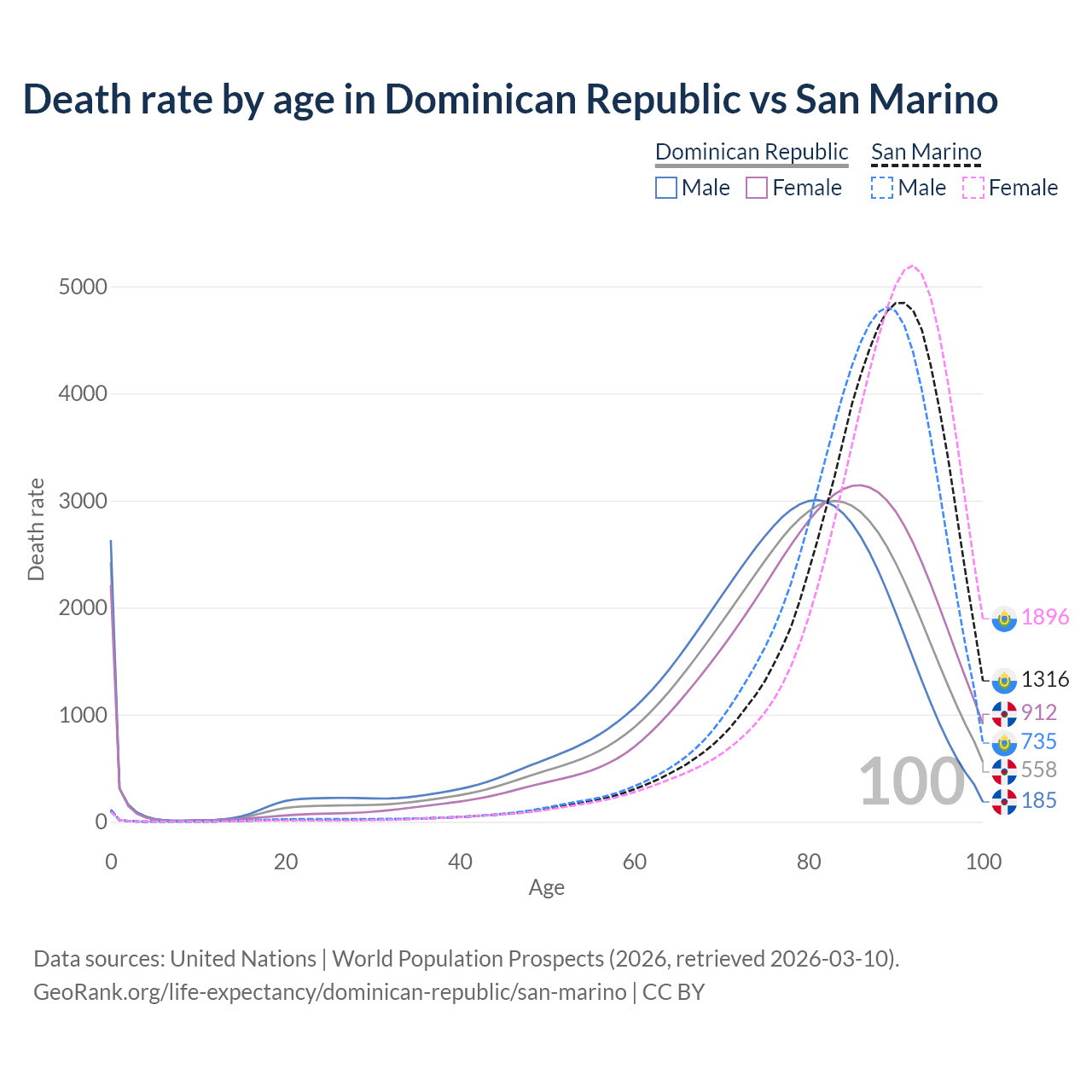 In the Dominican Republic, the most common age of death is 83, compared to 91 in San Marino. The median age of death is 78.9 in the Dominican Republic and 88.3 in San Marino, meaning only half of each cohort is expected to live past that age.