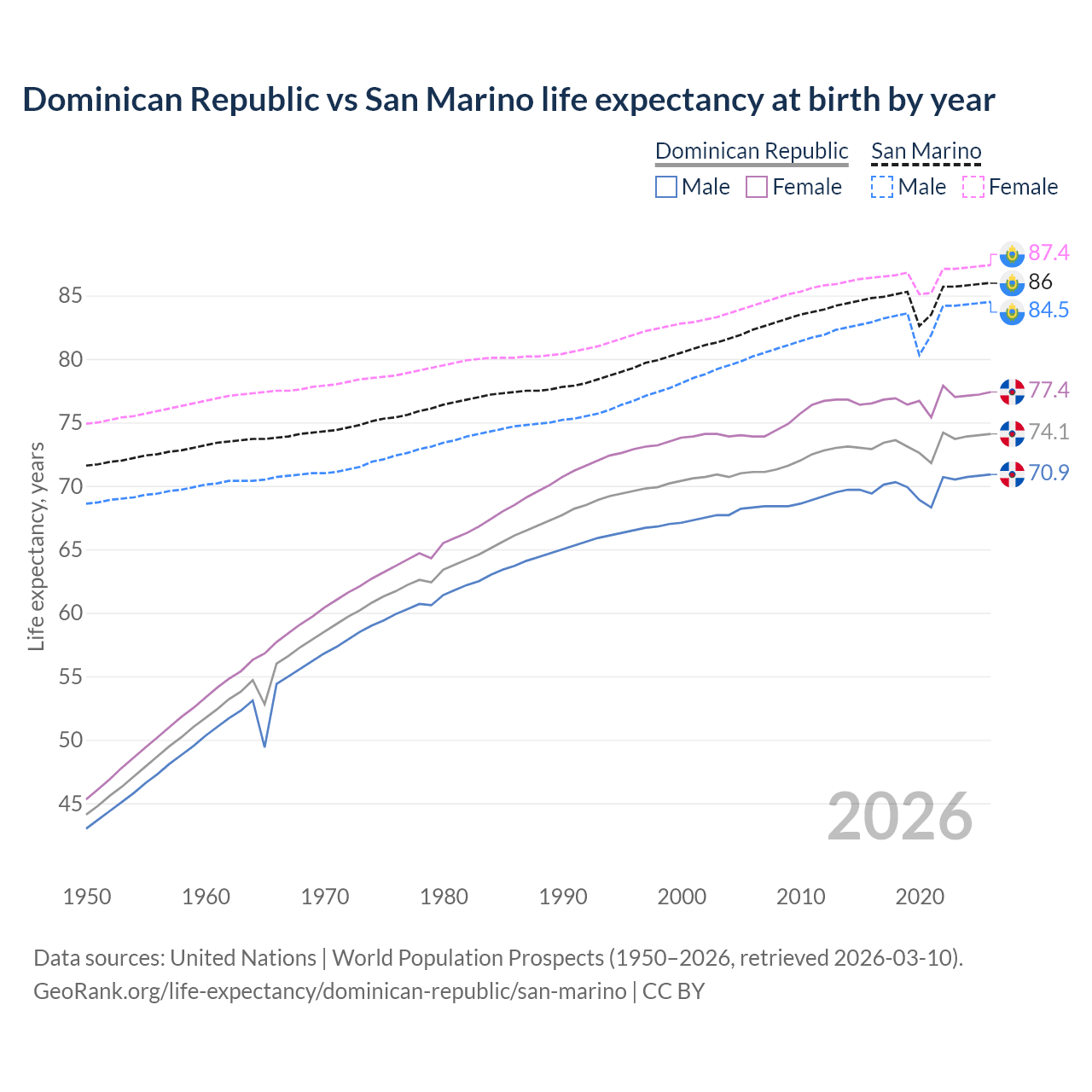The average life expectancy at birth is 74.1 years in the Dominican Republic vs 86 in San Marino. The Dominican Republic is ranked 101/197 by life expectancy, and San Marino is 2/197. In the Dominican Republic, the life expectancy is 70.9 years for males and 77.4 years for females. In San Marino, it's 84.5 years for males and 87.4 years for females.