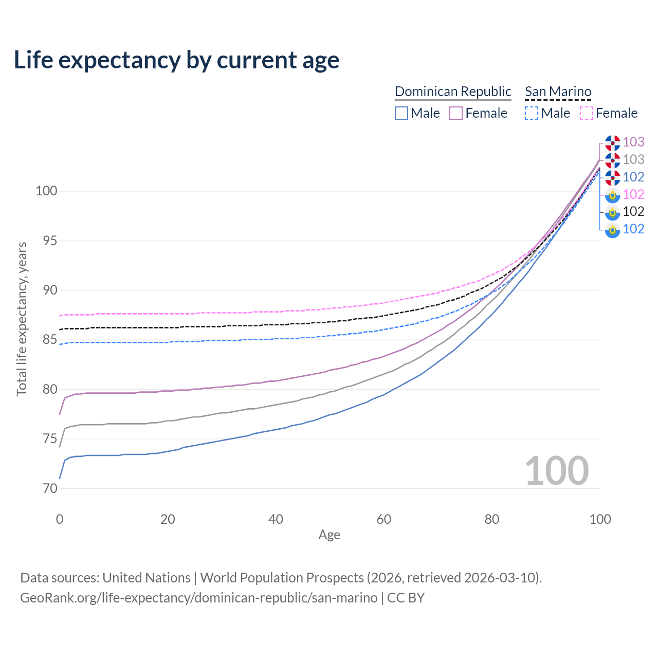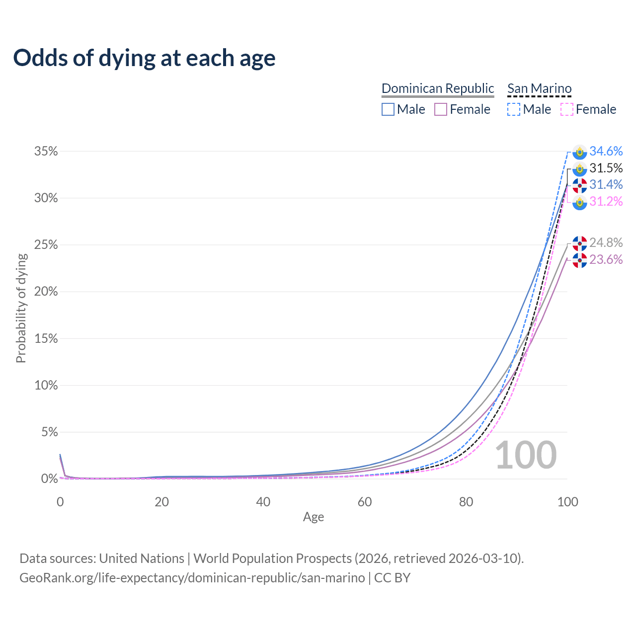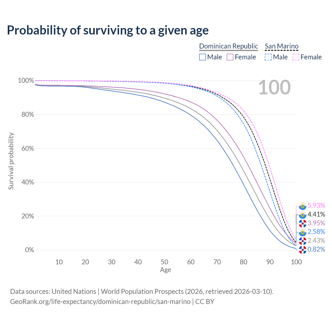 This life expectancy calculator shows the odds of living to 100, 95, 90, and below based on current age for both males and females in the Dominican Republic and San Marino, along with mean and median age of death. The calculations are based on the 2026 life tables (actuarial tables) from the UN World Population Prospects.