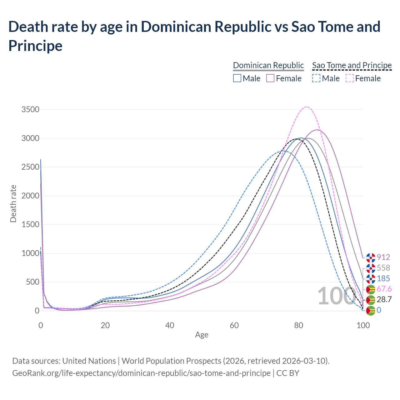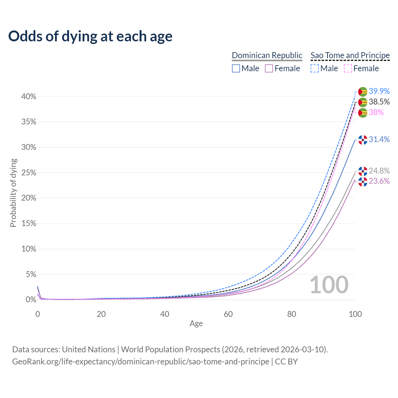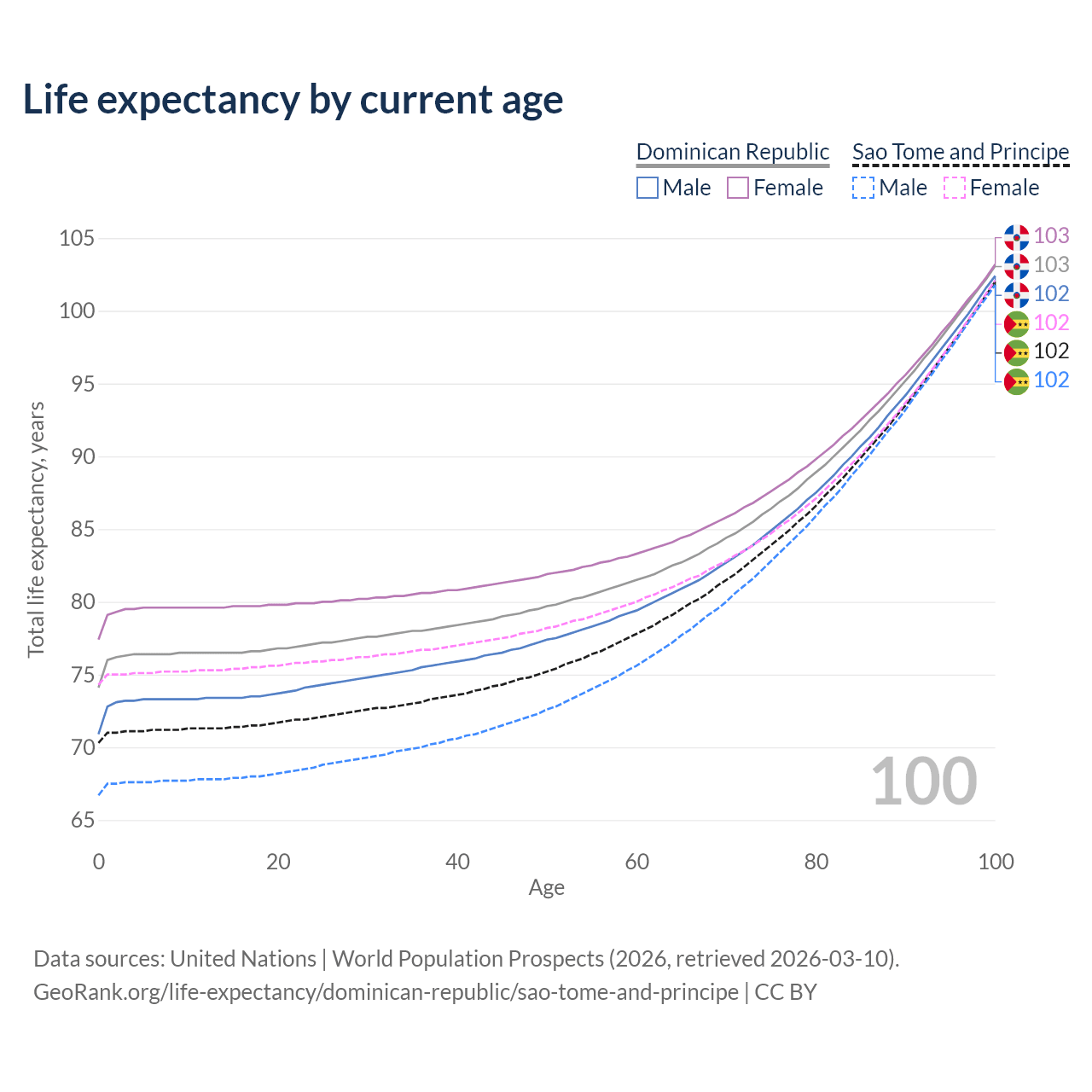 This life expectancy calculator shows the odds of living to 100, 95, 90, and below based on current age for both males and females in the Dominican Republic and Sao Tome and Principe, along with mean and median age of death. The calculations are based on the 2026 life tables (actuarial tables) from the UN World Population Prospects.