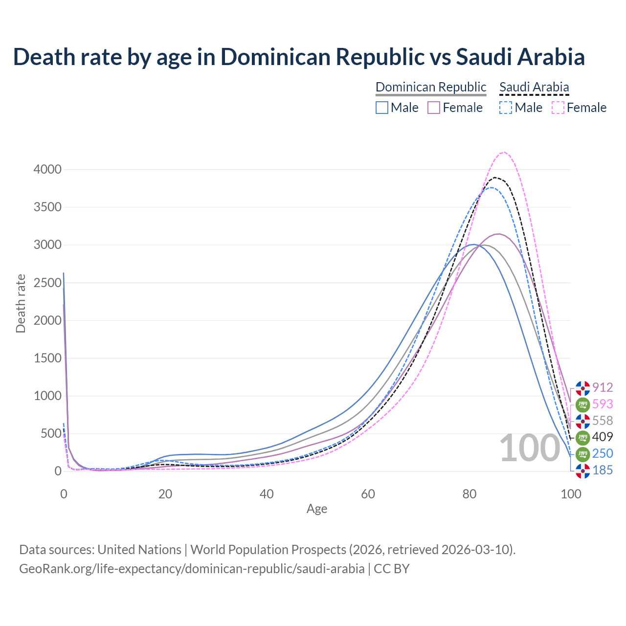 In the Dominican Republic, the most common age of death is 83, compared to 85 in Saudi Arabia. The median age of death is 78.9 in the Dominican Republic and 82.5 in Saudi Arabia, meaning only half of each cohort is expected to live past that age.