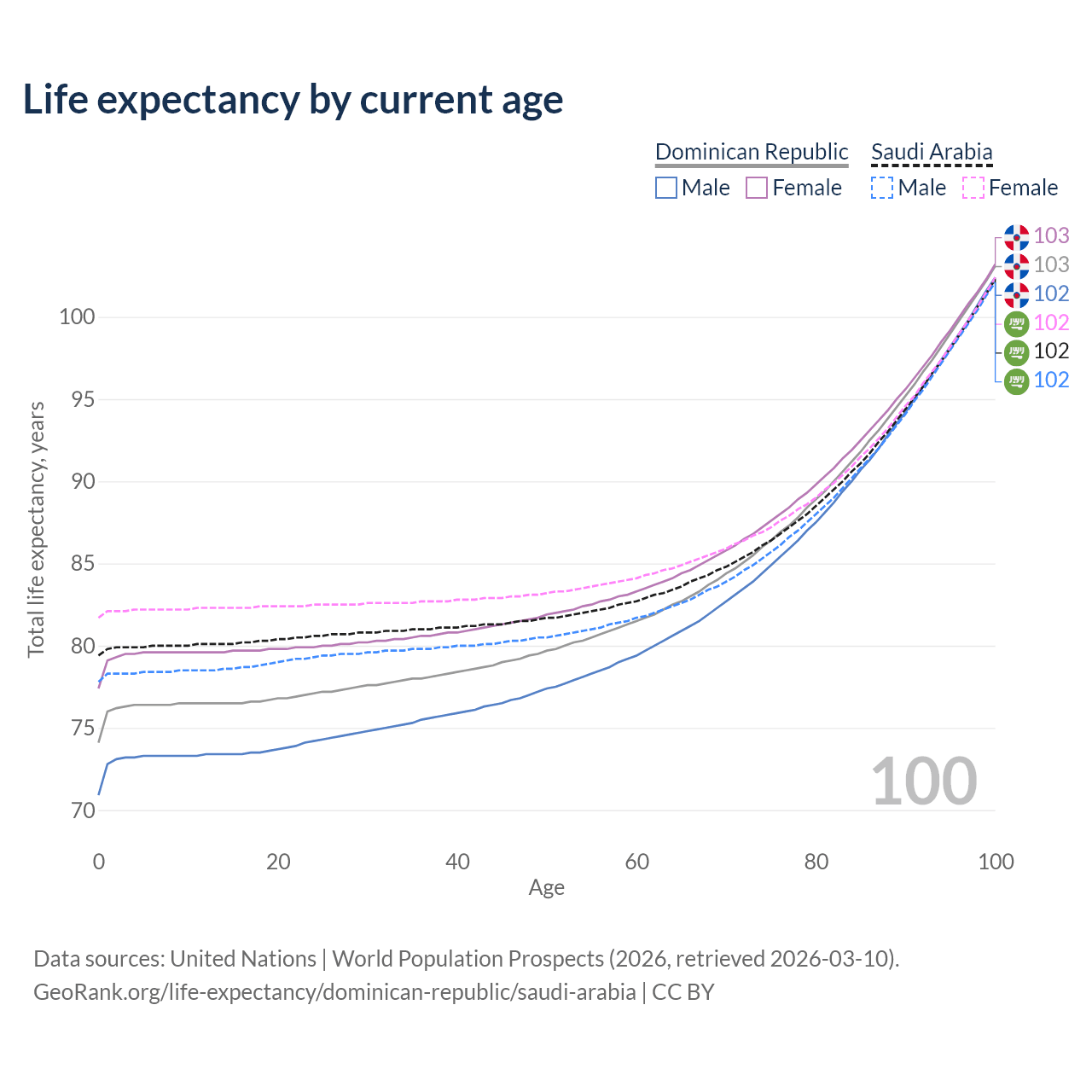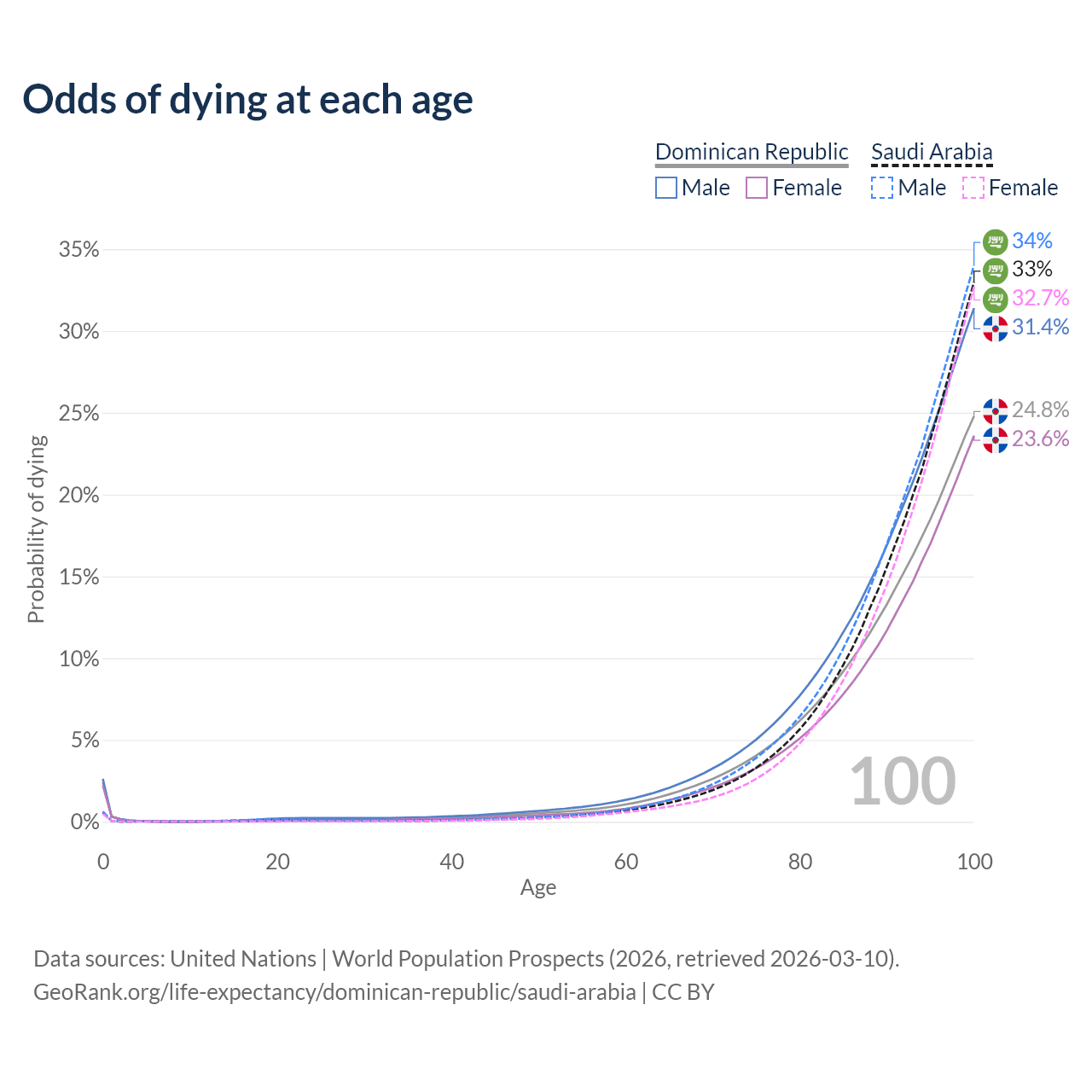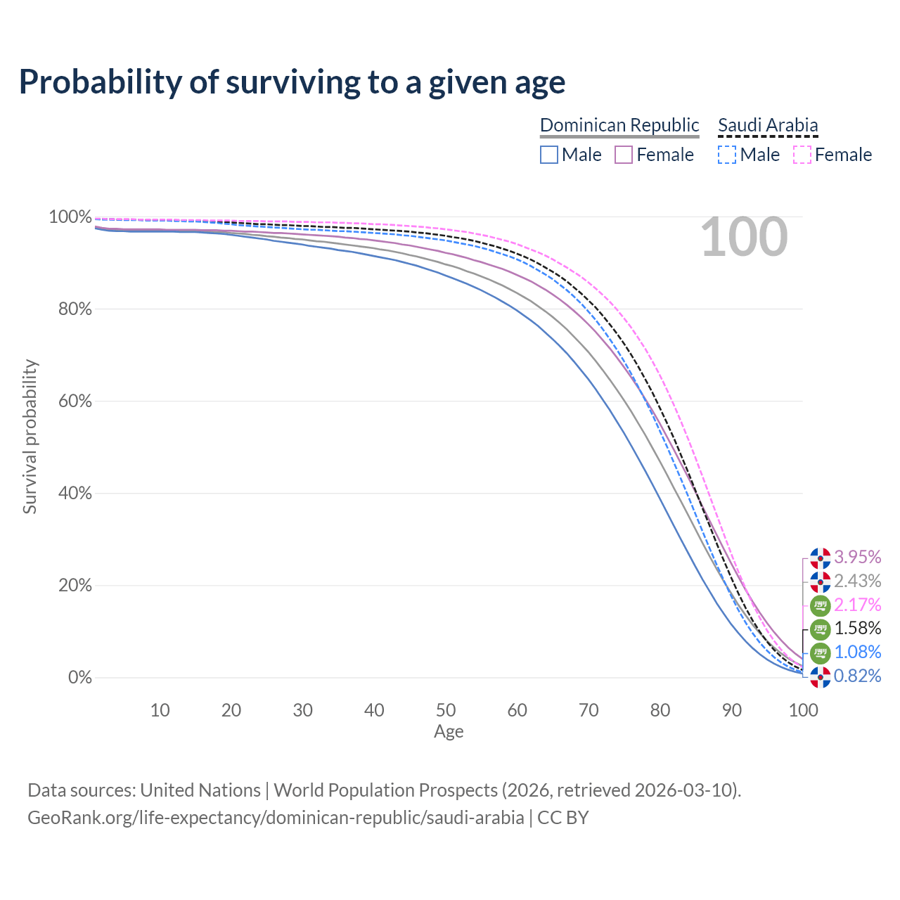This life expectancy calculator shows the odds of living to 100, 95, 90, and below based on current age for both males and females in the Dominican Republic and Saudi Arabia, along with mean and median age of death. The calculations are based on the 2026 life tables (actuarial tables) from the UN World Population Prospects.