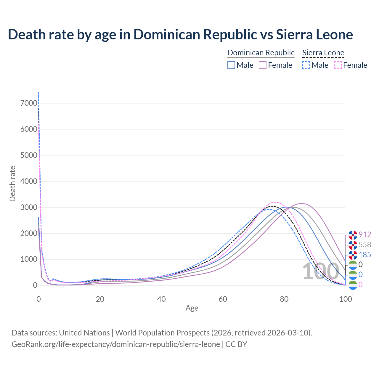 In the Dominican Republic, the most common age of death is 83, compared to 0 in Sierra Leone. The median age of death is 78.9 in the Dominican Republic and 70.8 in Sierra Leone, meaning only half of each cohort is expected to live past that age.