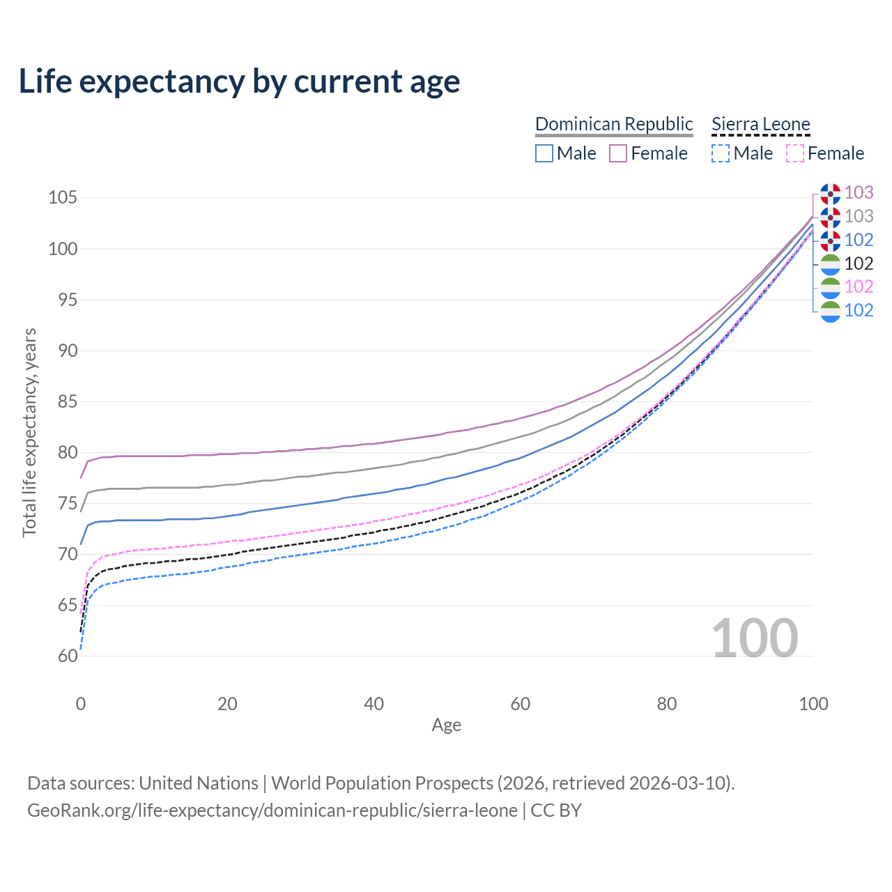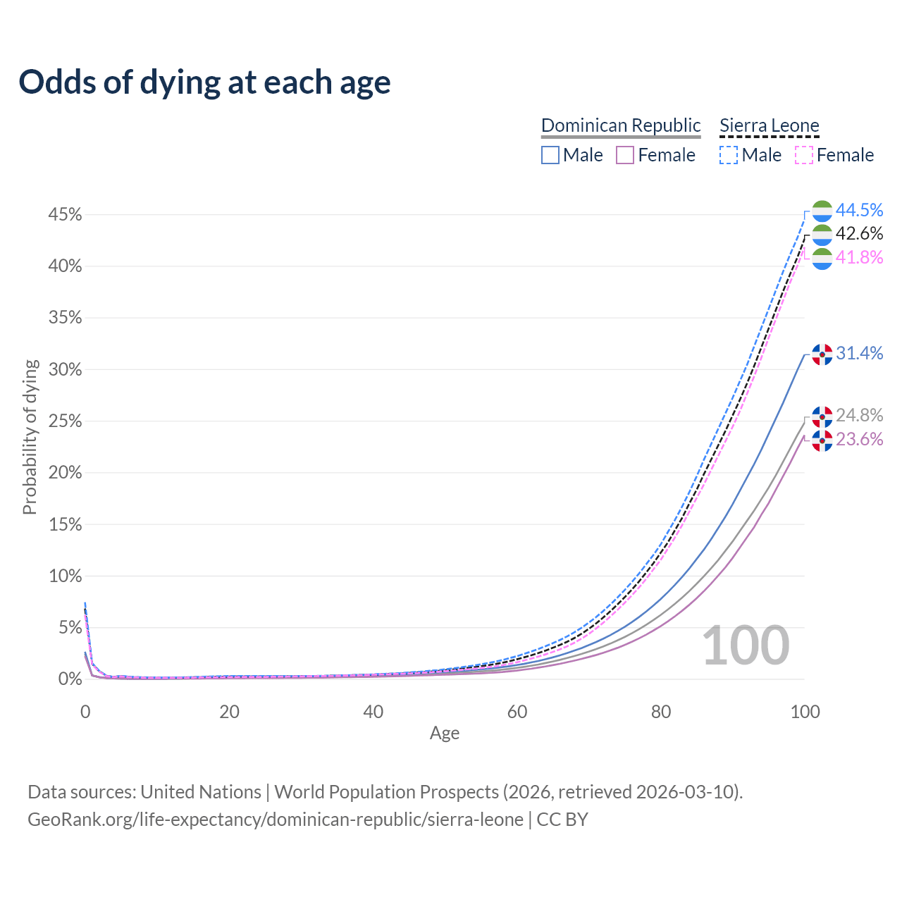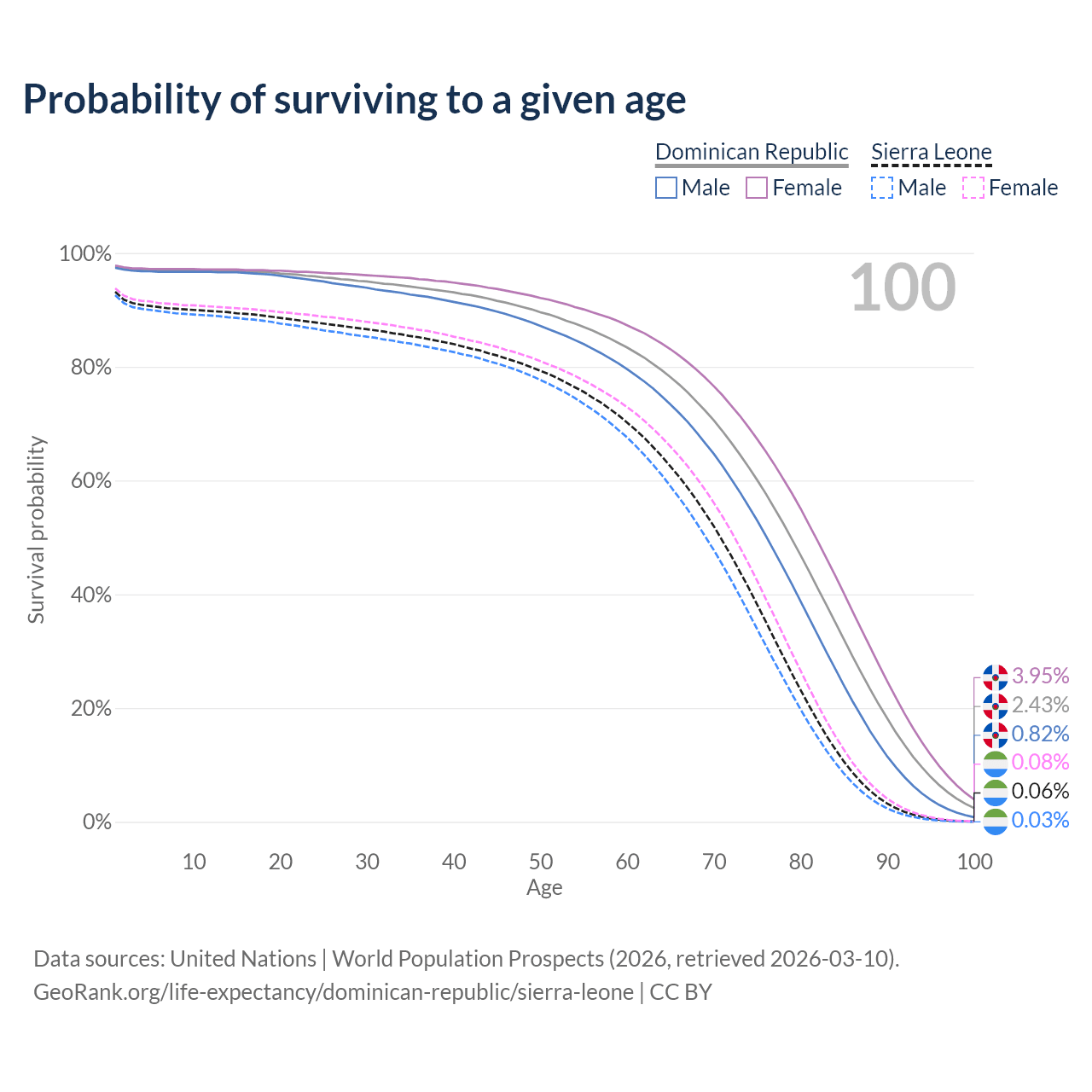 This life expectancy calculator shows the odds of living to 100, 95, 90, and below based on current age for both males and females in the Dominican Republic and Sierra Leone, along with mean and median age of death. The calculations are based on the 2026 life tables (actuarial tables) from the UN World Population Prospects.