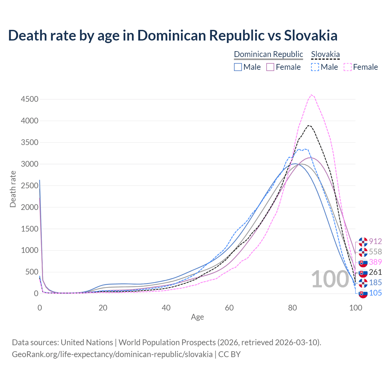 This life expectancy calculator shows the odds of living to 100, 95, 90, and below based on current age for both males and females in the Dominican Republic and Slovakia, along with mean and median age of death. The calculations are based on the 2026 life tables (actuarial tables) from the UN World Population Prospects.