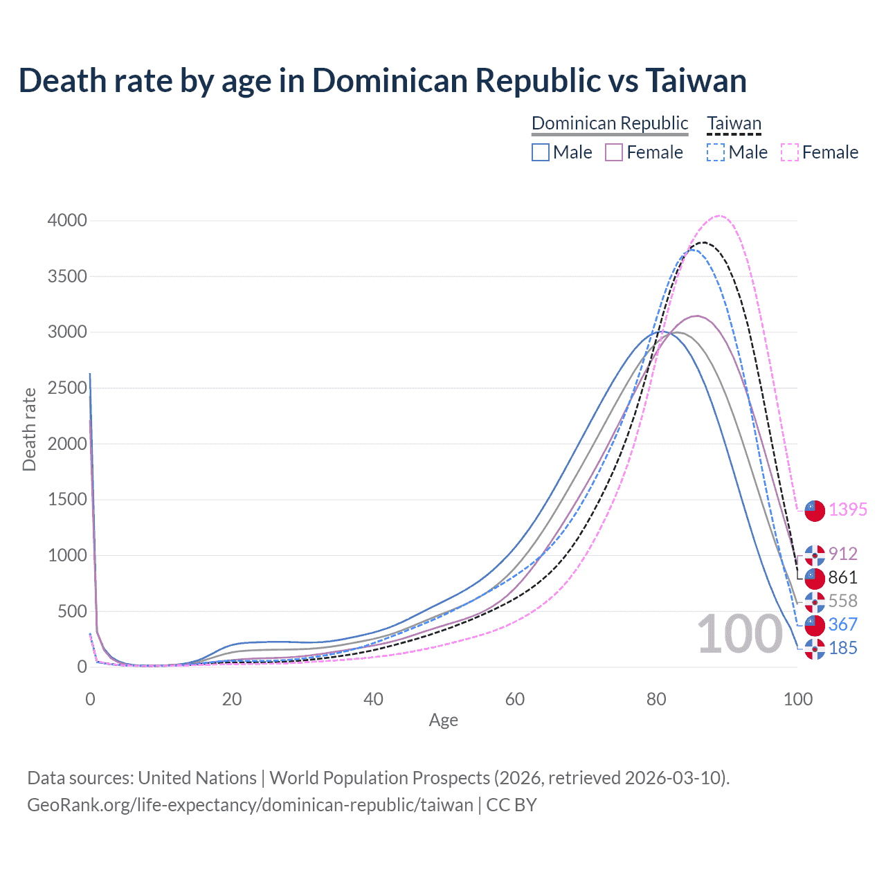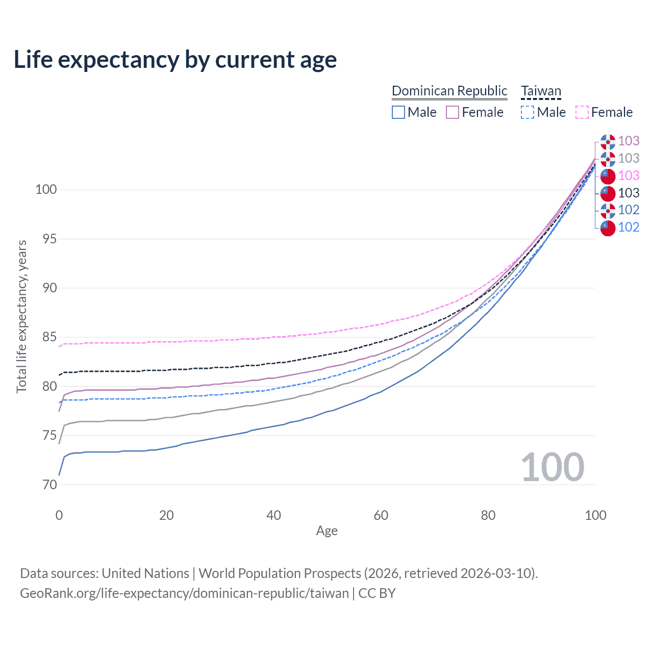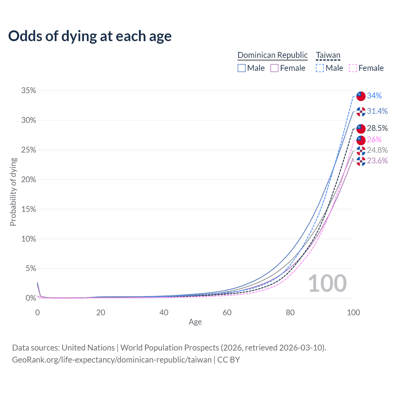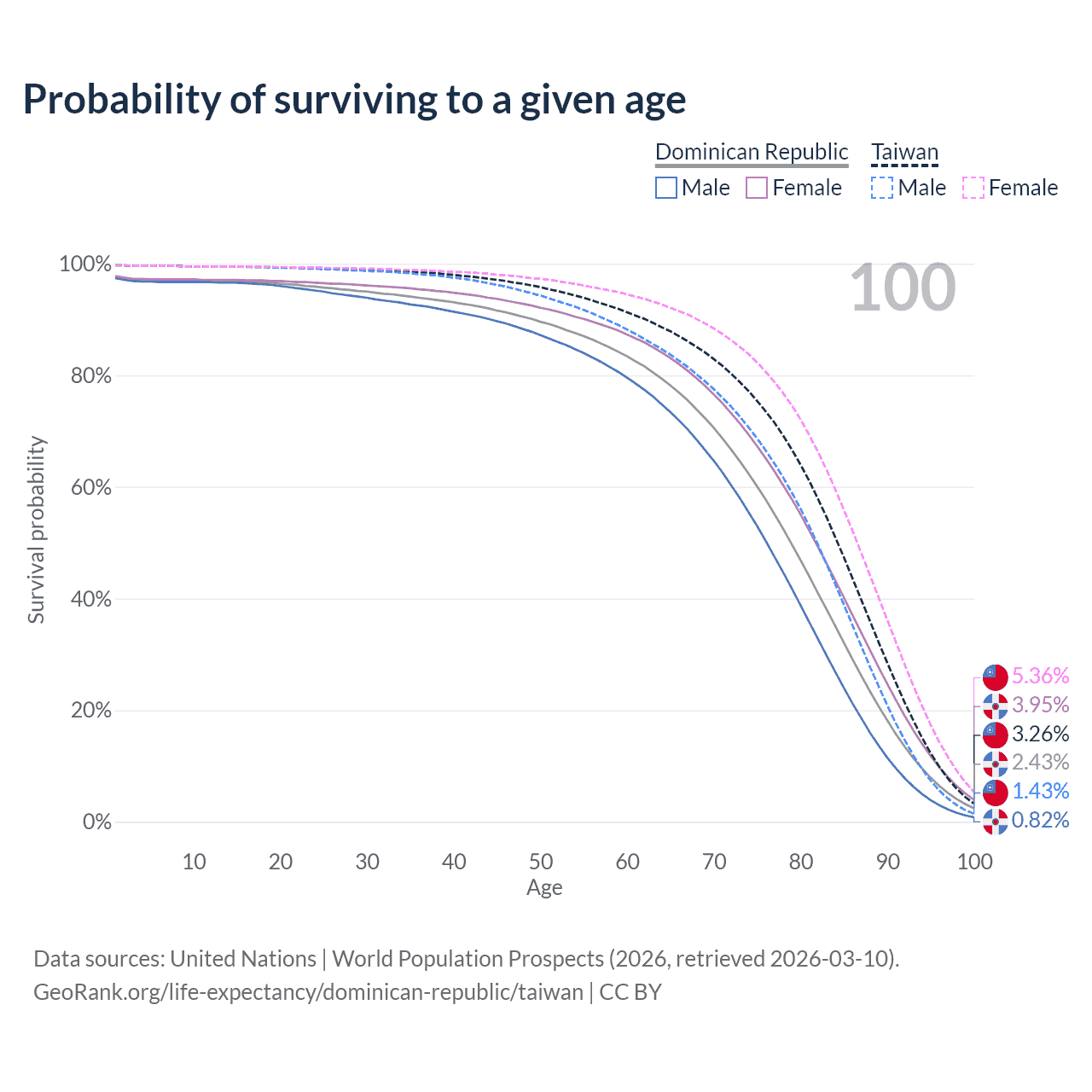 This life expectancy calculator shows the odds of living to 100, 95, 90, and below based on current age for both males and females in the Dominican Republic and Taiwan, along with mean and median age of death. The calculations are based on the 2026 life tables (actuarial tables) from the UN World Population Prospects.
